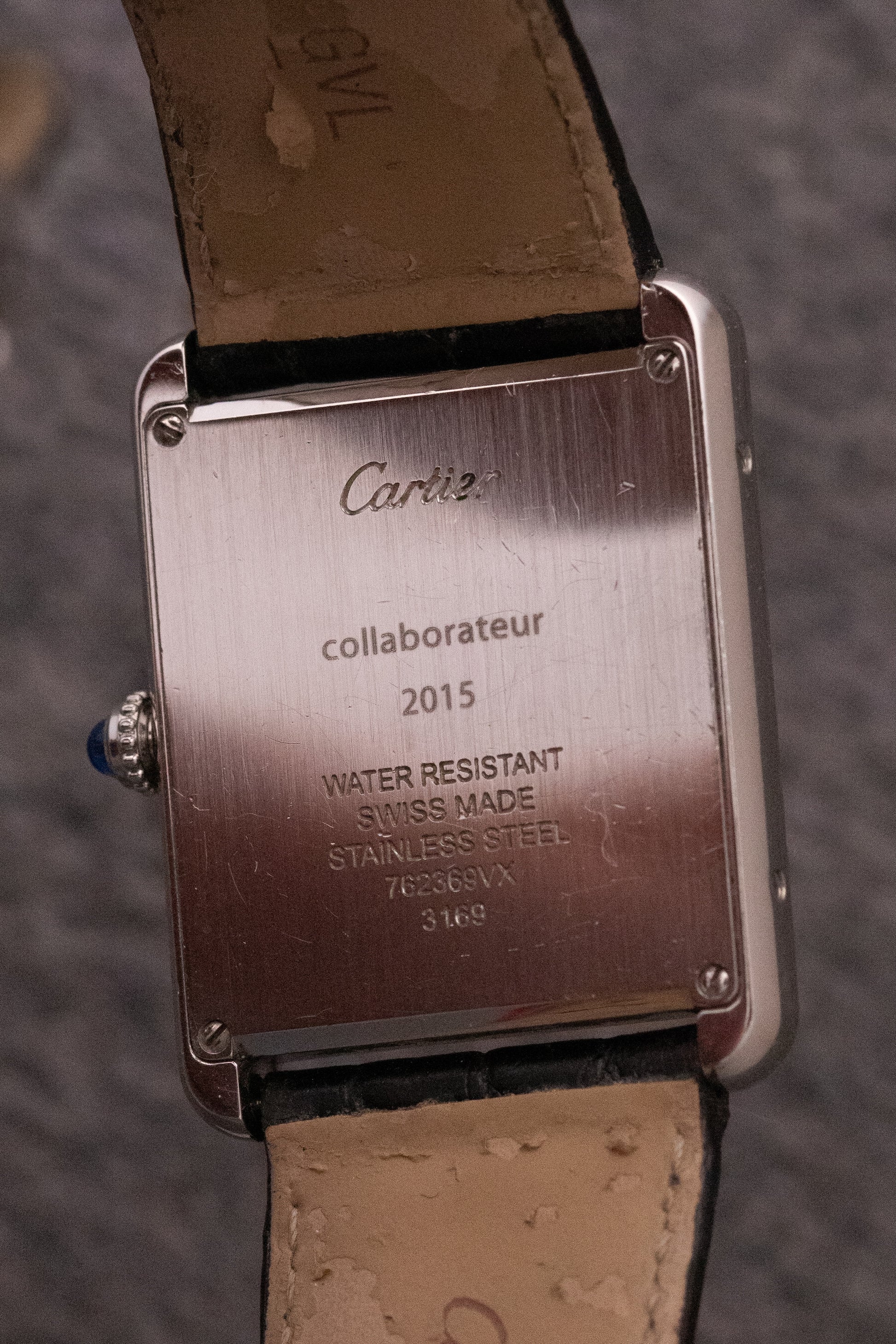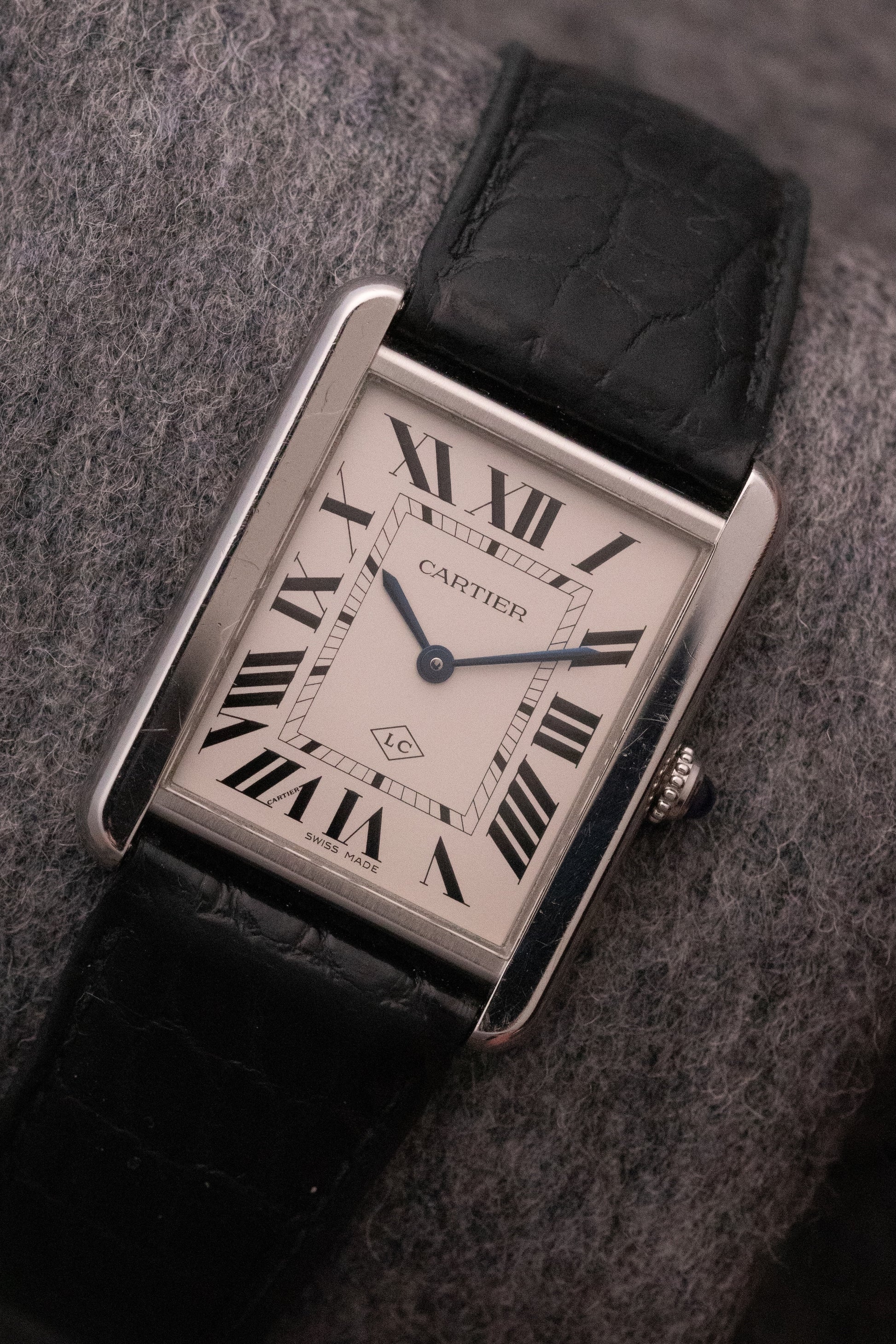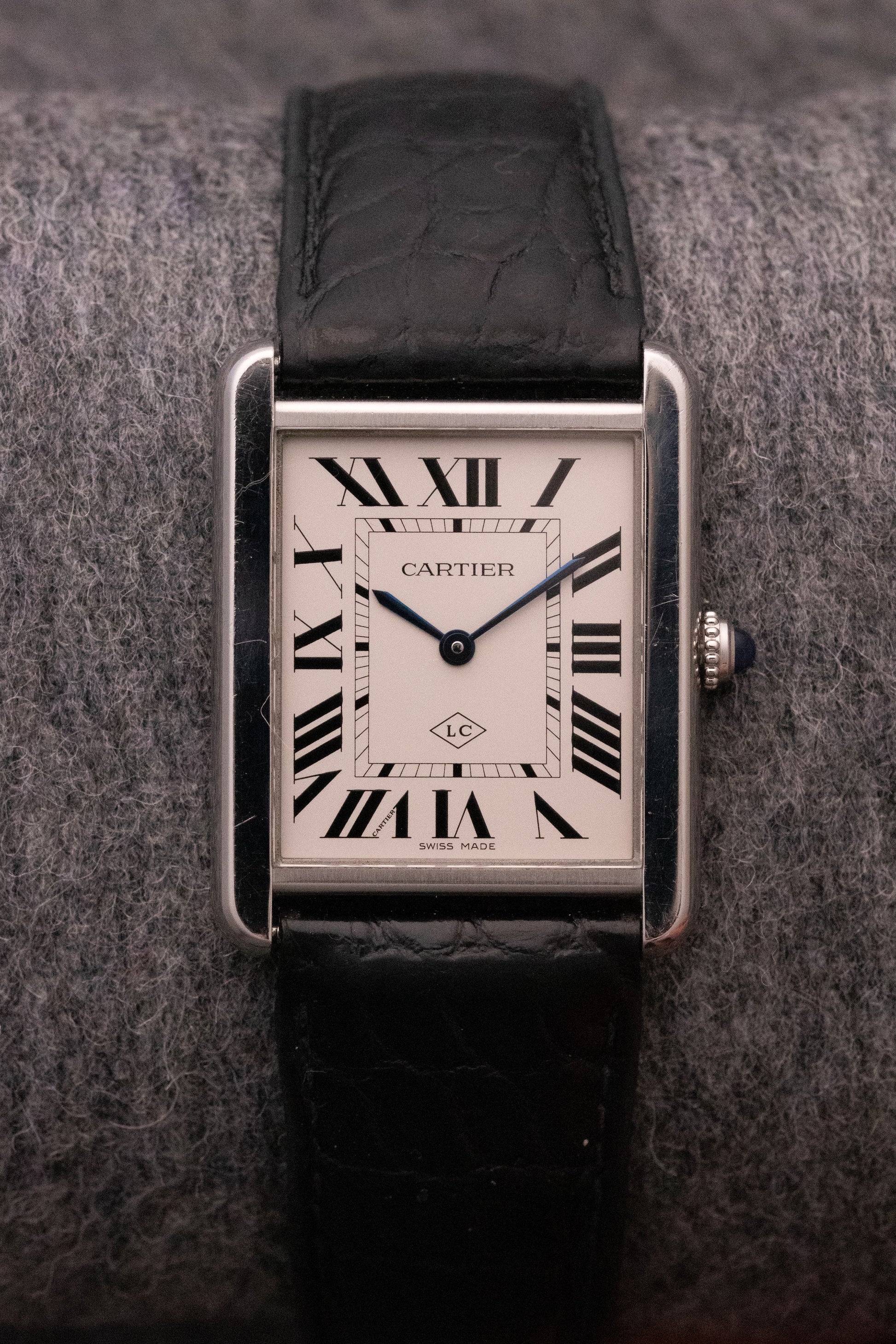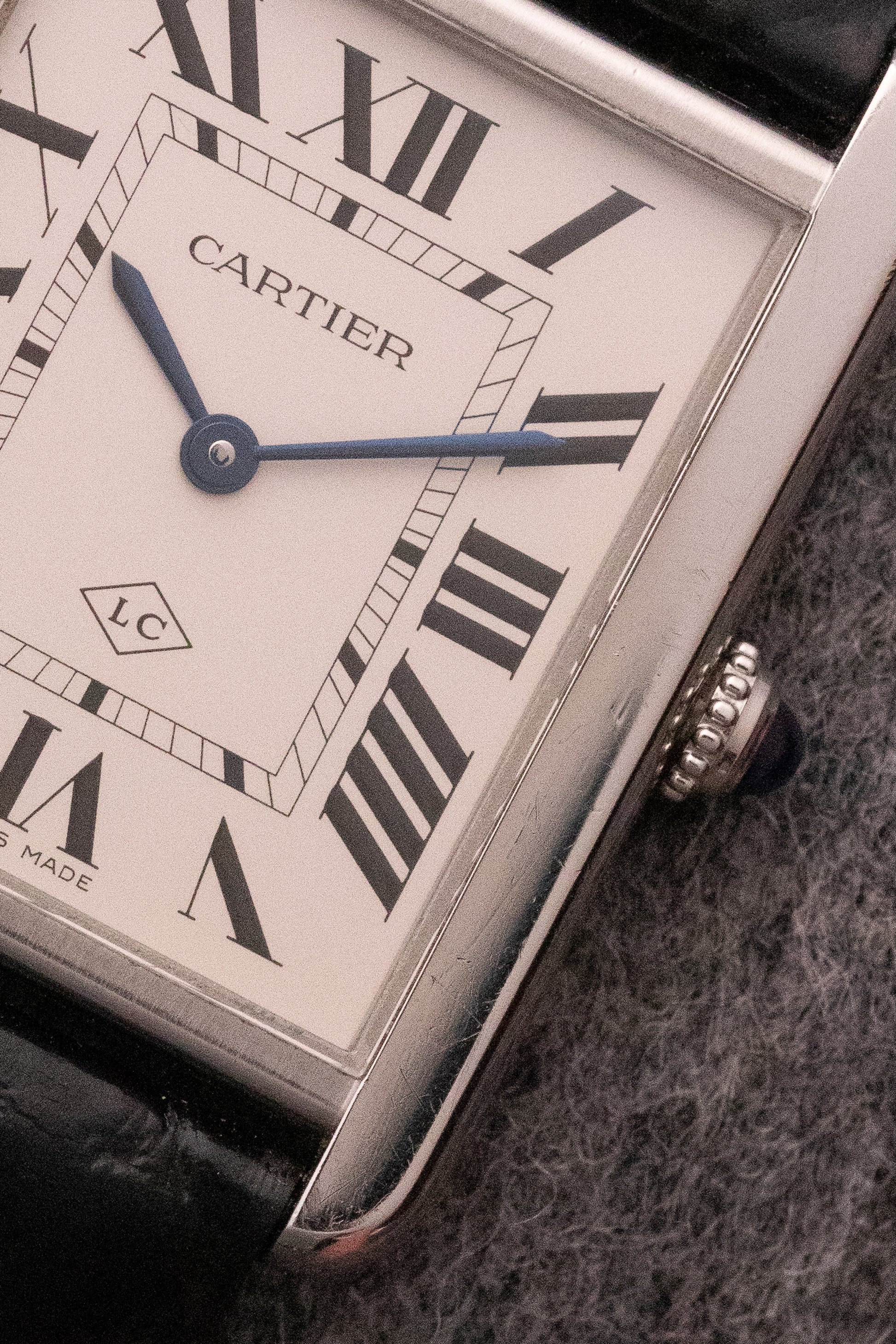 Cadran écru mat, chemin de fer et chiffres romains noirs, aiguilles glaives bleuies, marqué "LC" Louis Cartier