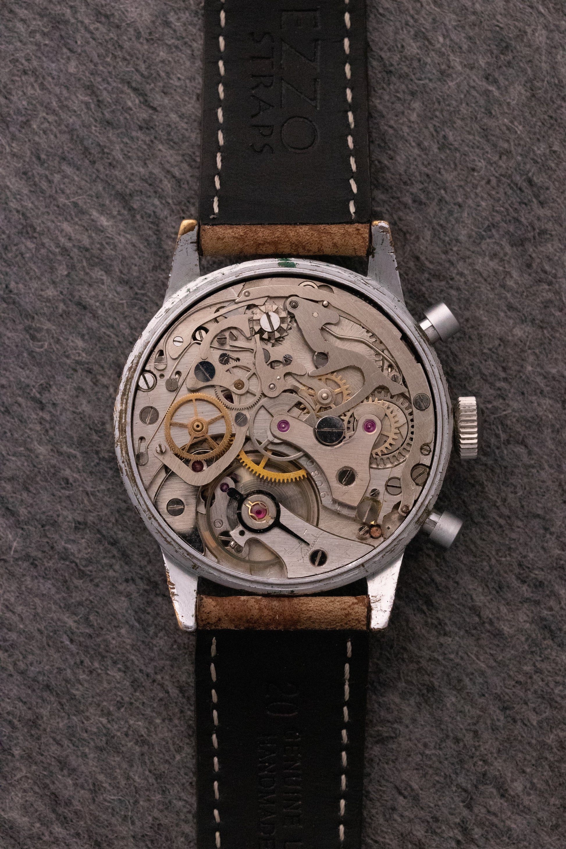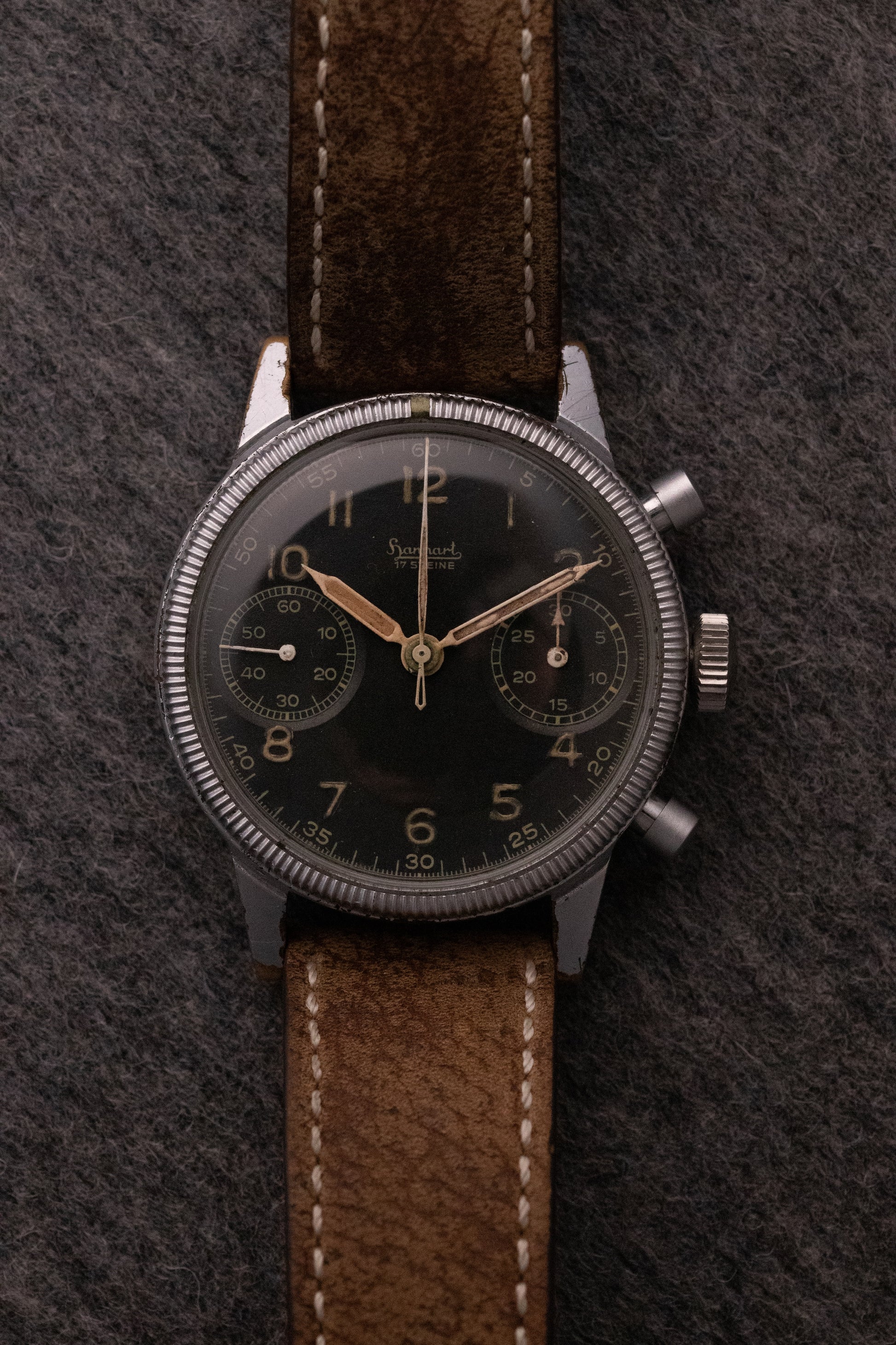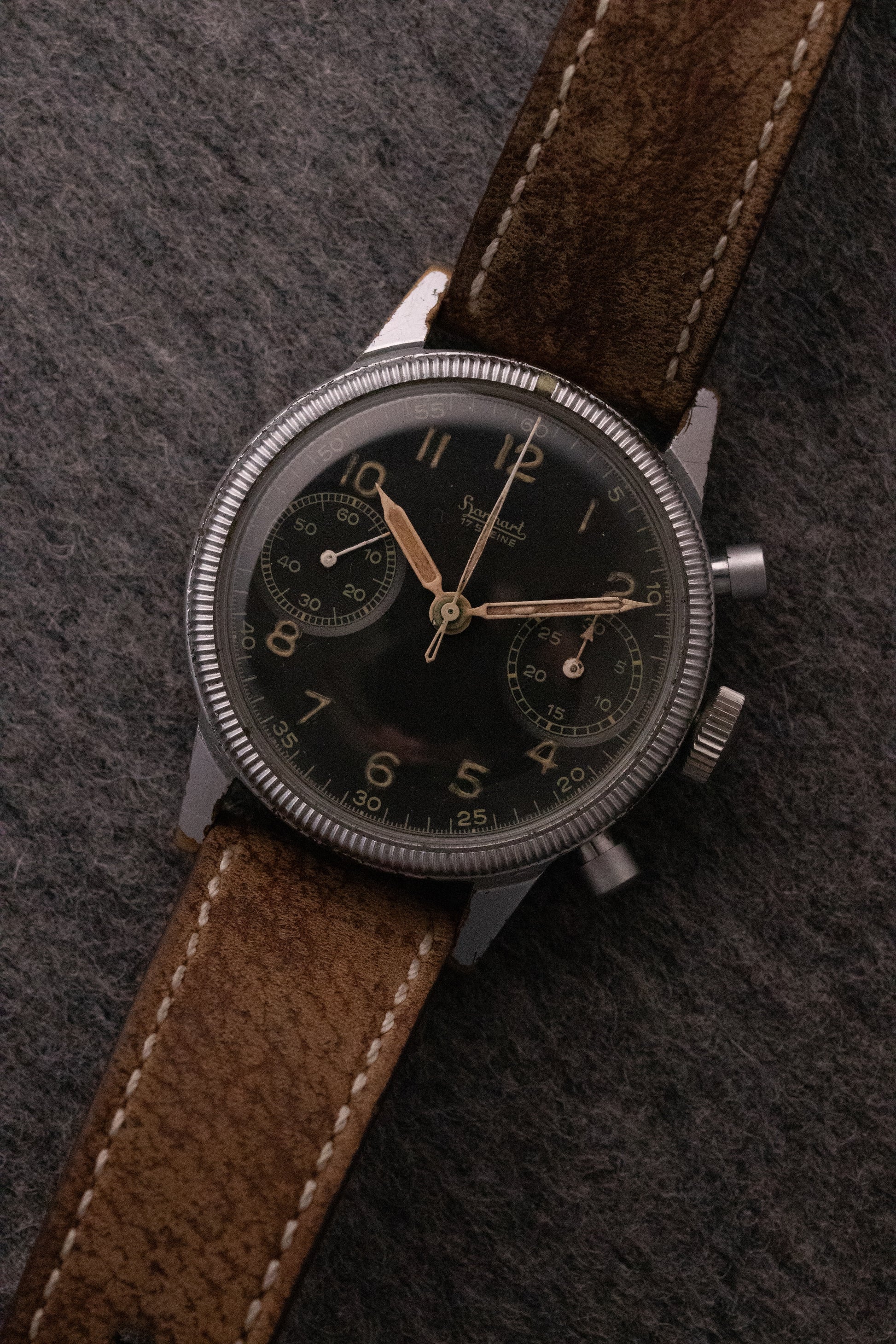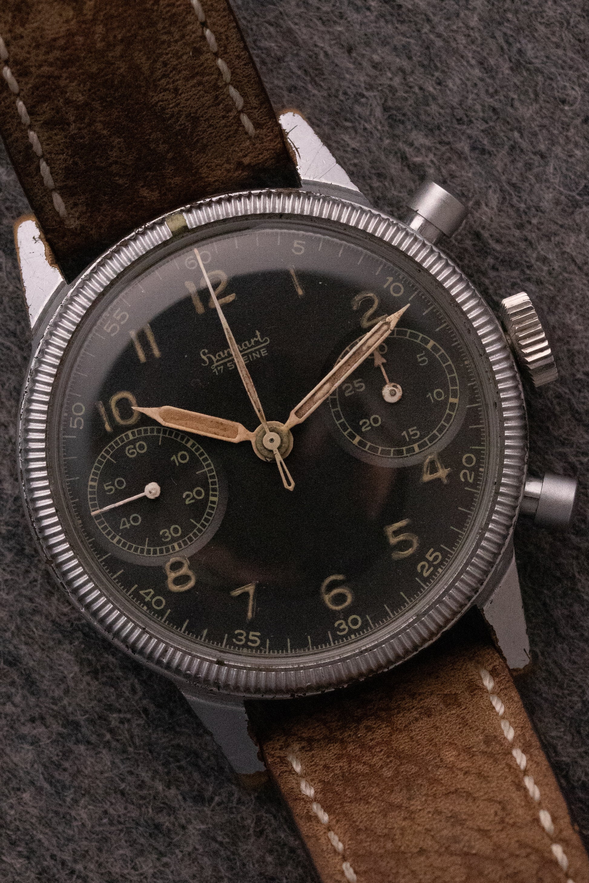 Cadran noir index peints au radium, aiguilles seringues au radium partiellement relumées, deux sous compteurs, un sous compteur seconde, un sous compteur totaliseur 30min à 3H, lunette bidirectionnelle cannelée
