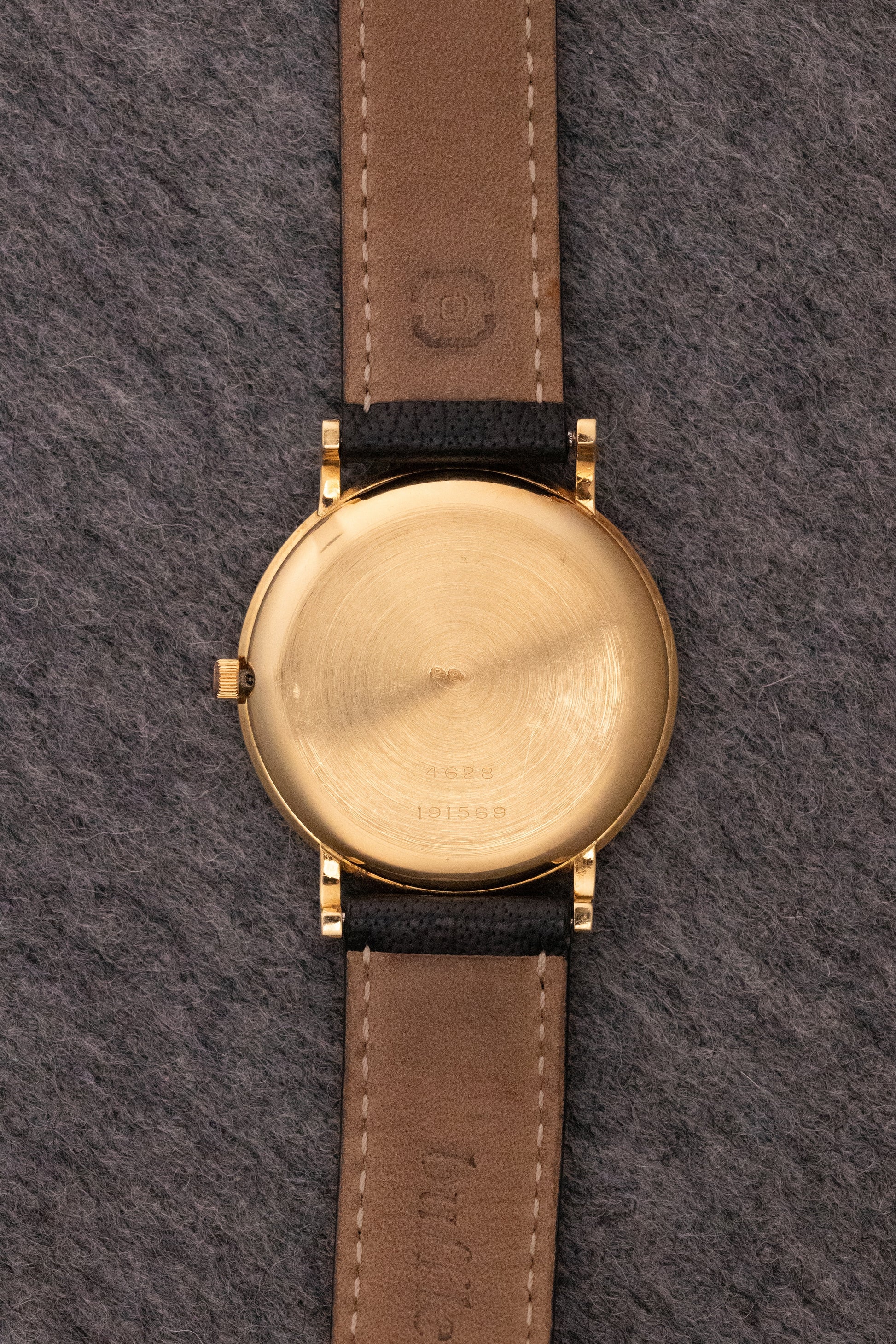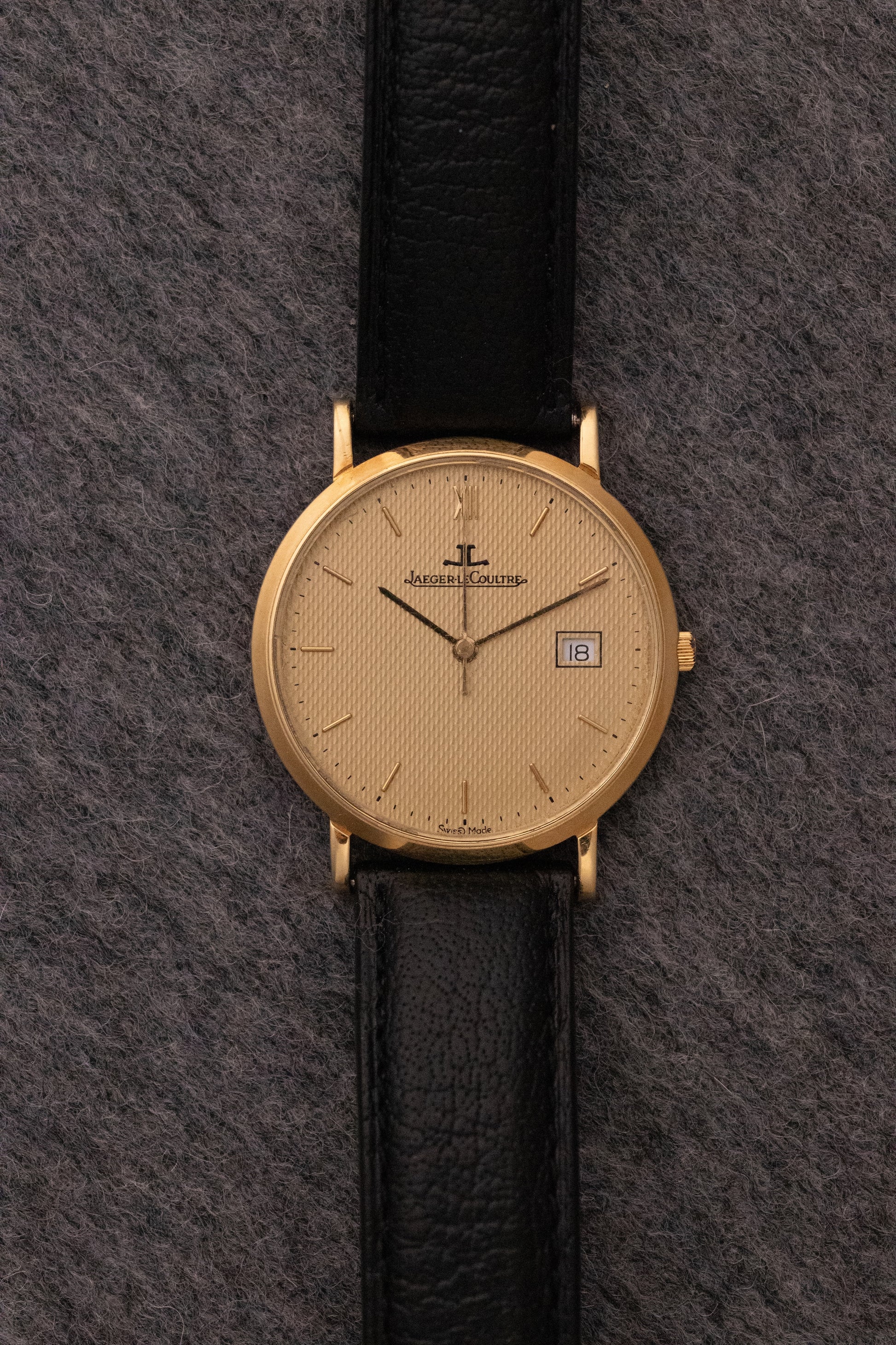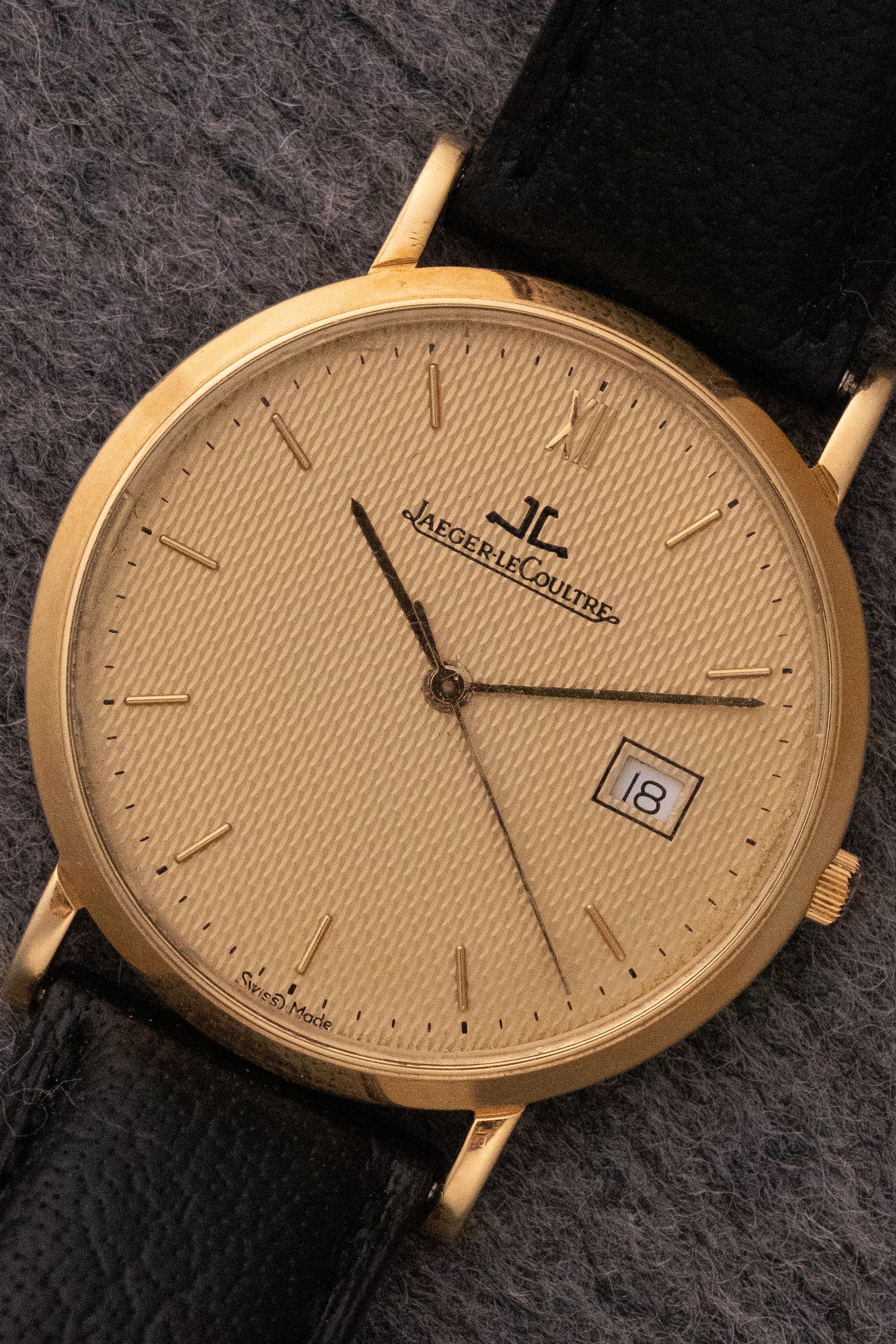 Cadran doré guilloché, aiguilles bâtons, date par guichet à 3H