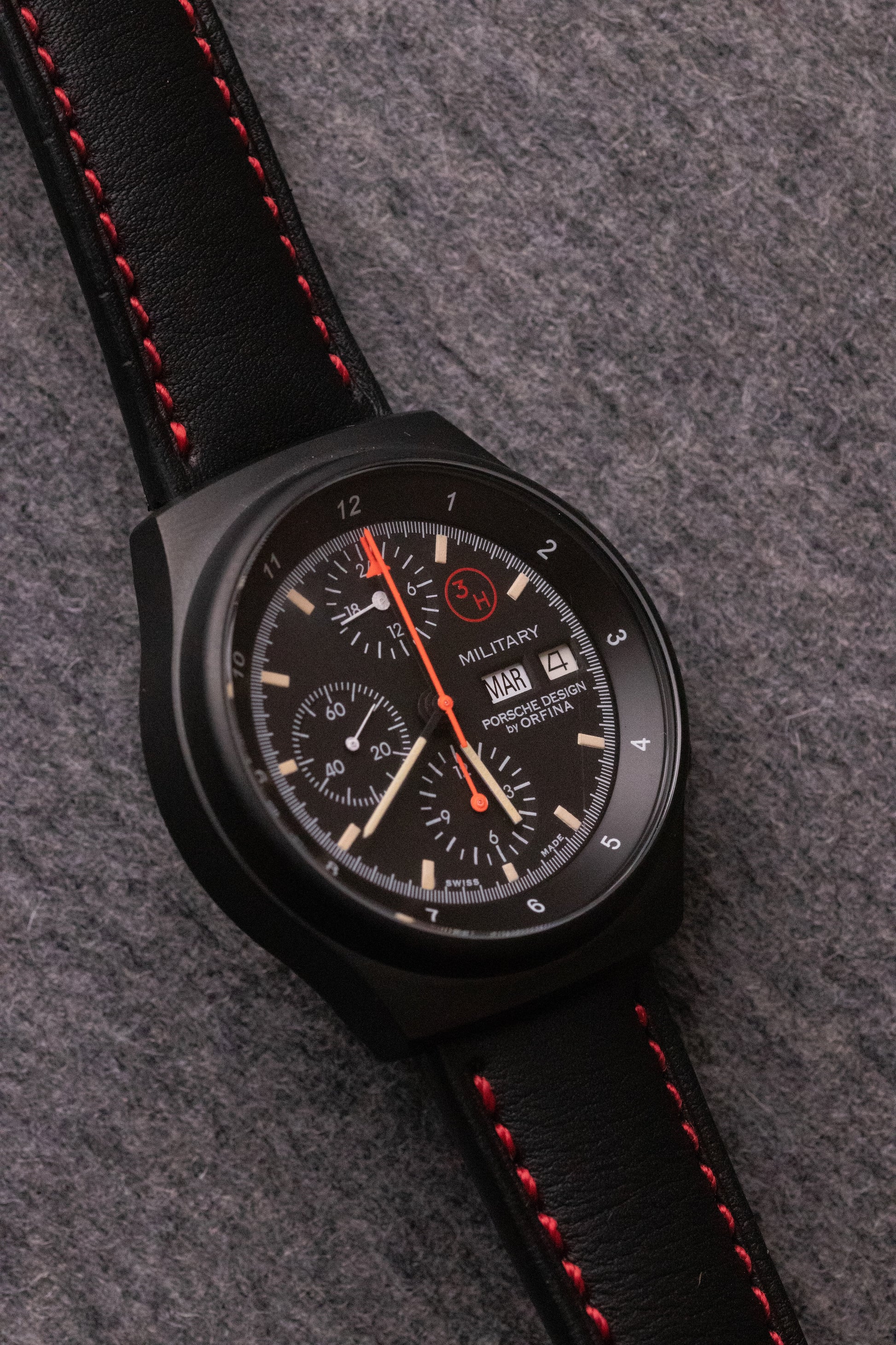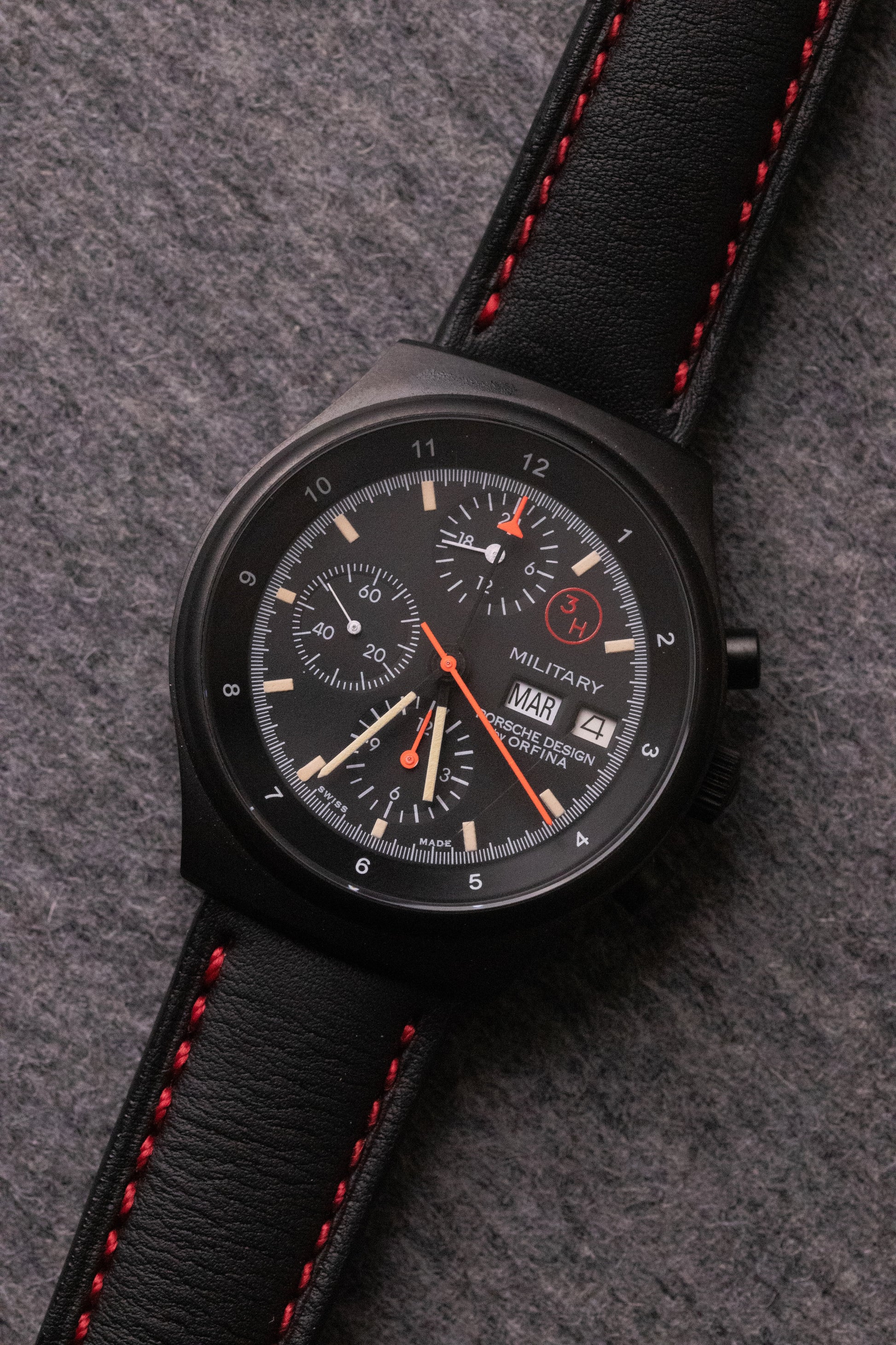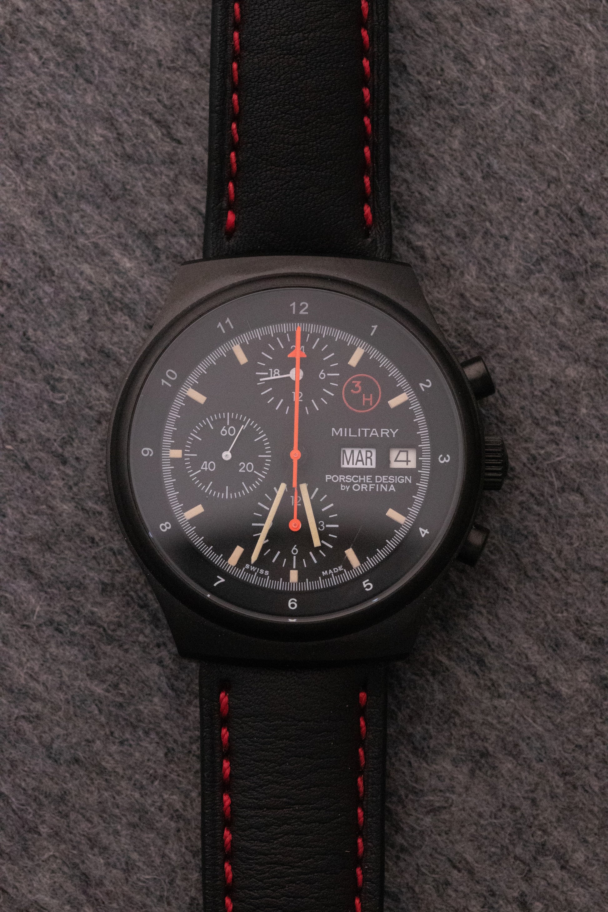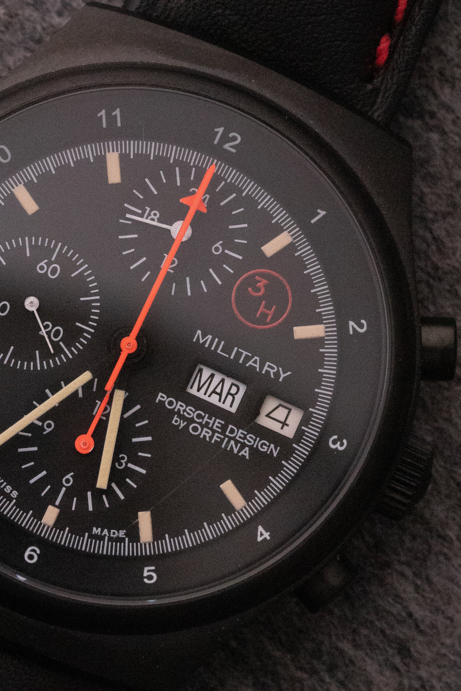 Cadran noir mat, index peints, aiguilles lumineuses, date et jour par guichet à 3H, trois sous compteurs, un sous compteur secondes à 9H, un sous compteur 24h à 12H, un sous compteur totaliseur 12h à 6H, rehaut noir