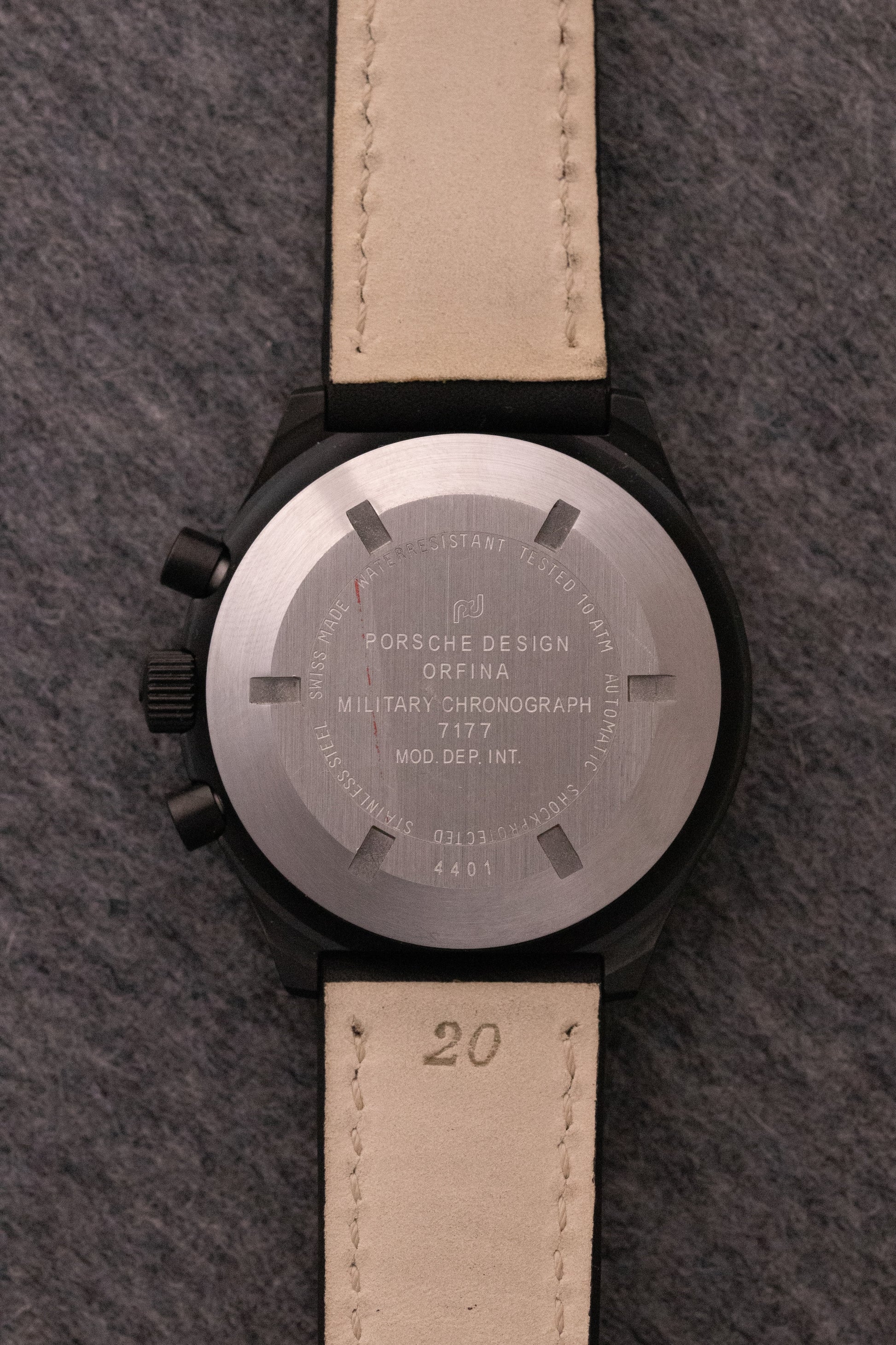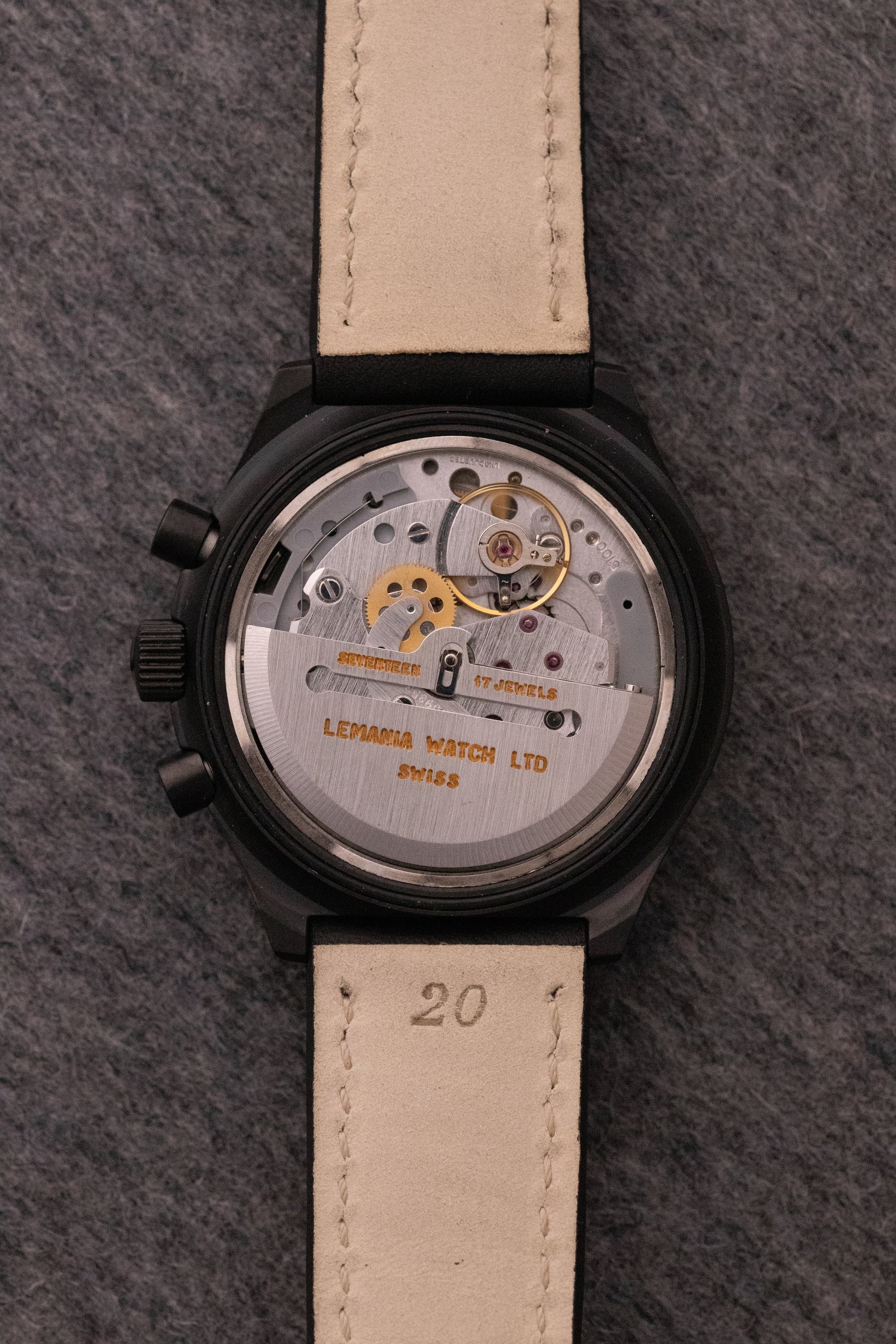 Boitier en acier noir mat, couronne signée vissée, fond vissé portant les références de la montre