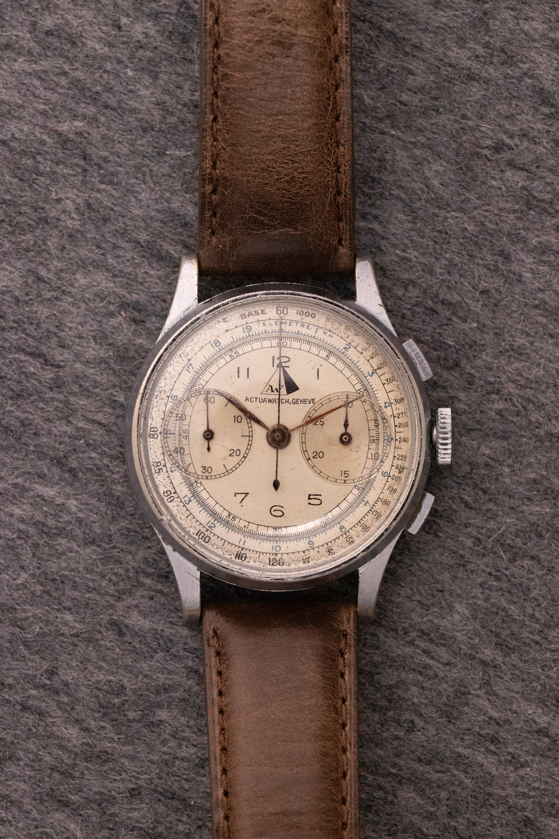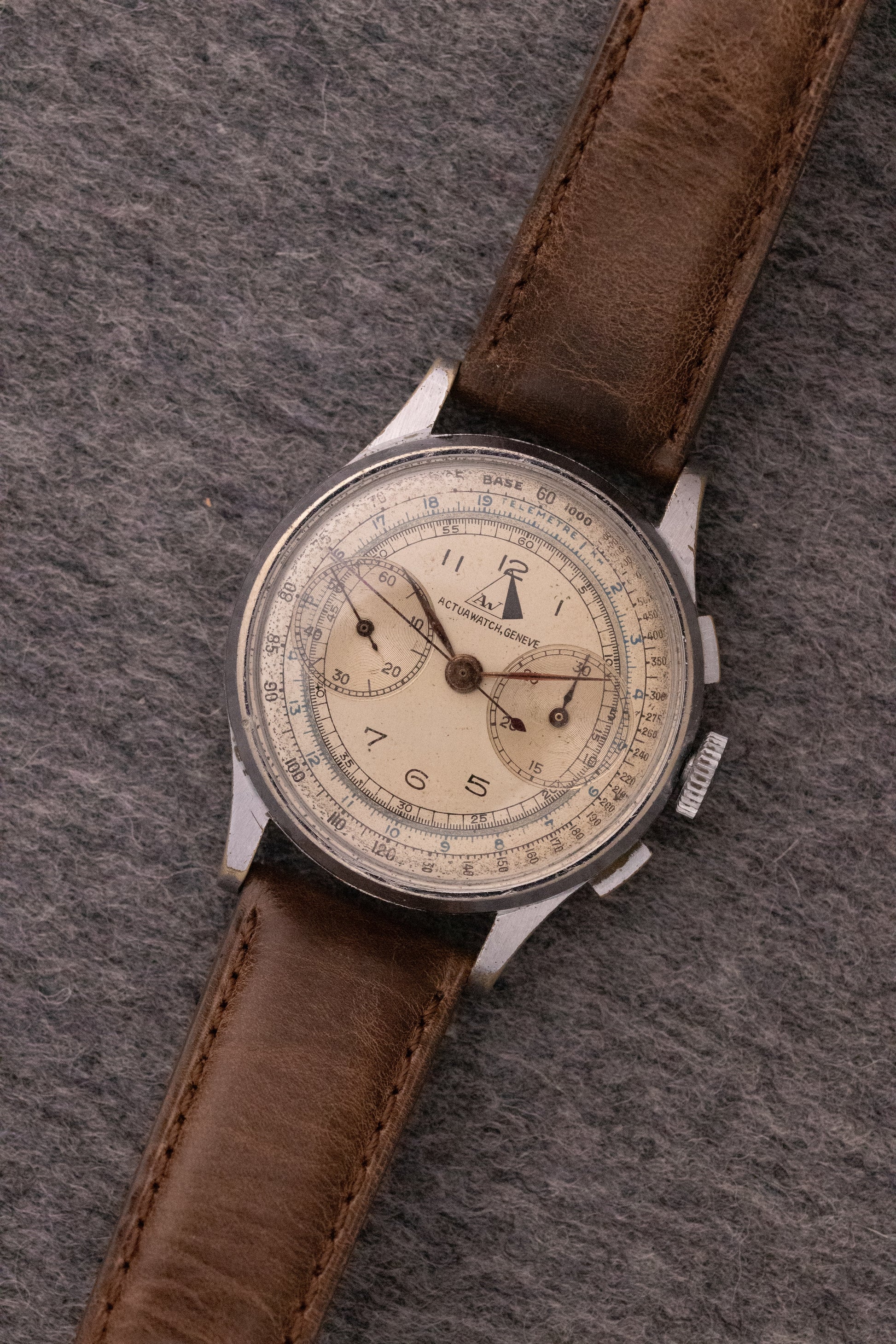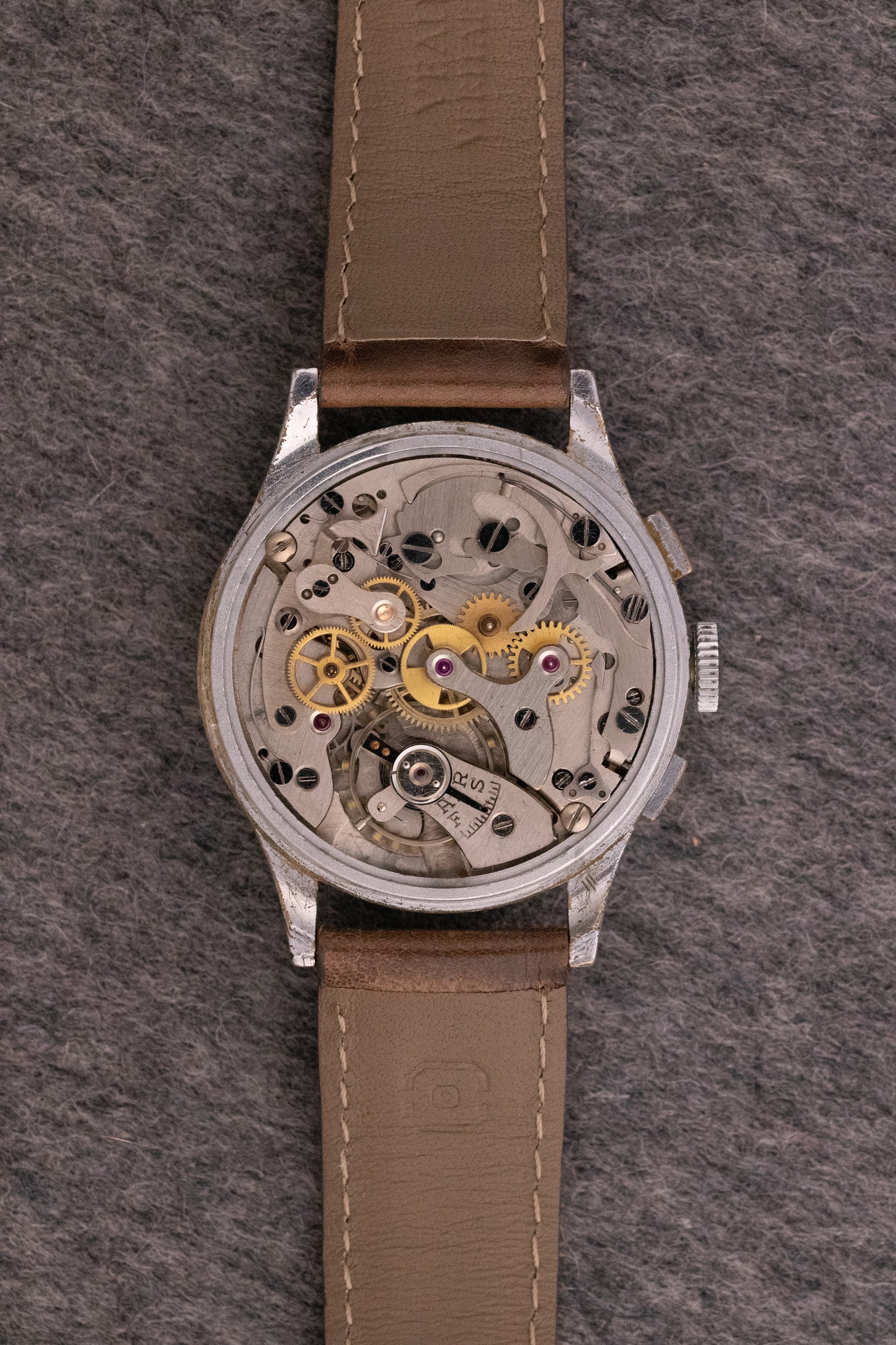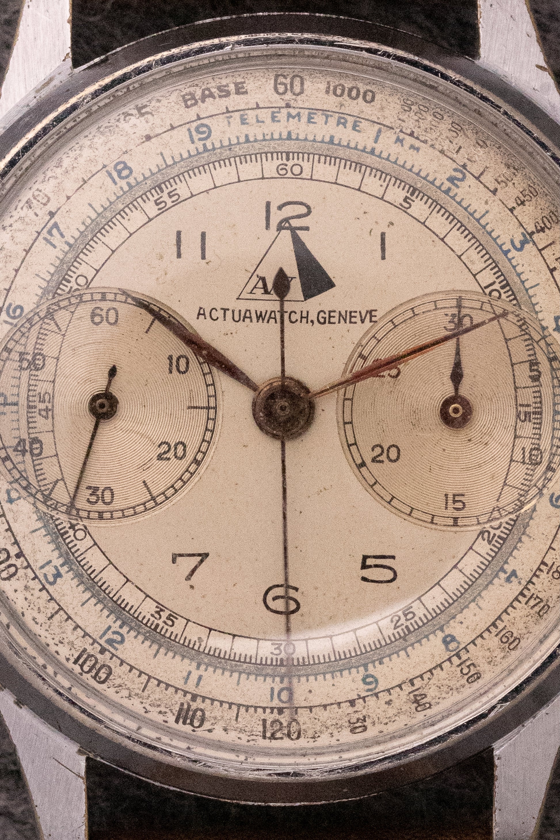 Cadran mat champagne, échelle télémétrique, deux sous compteurs, seconde permanente à 9H et totaliseur 30min à 3H, aiguilles feuilles