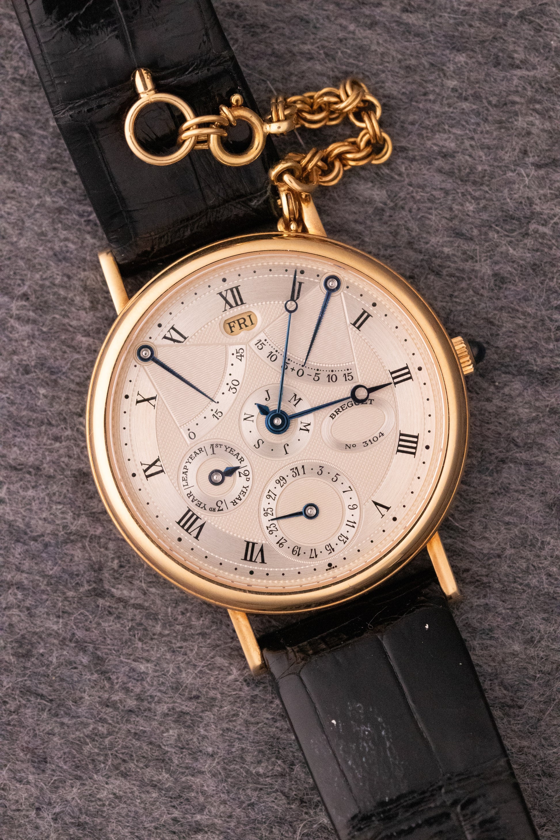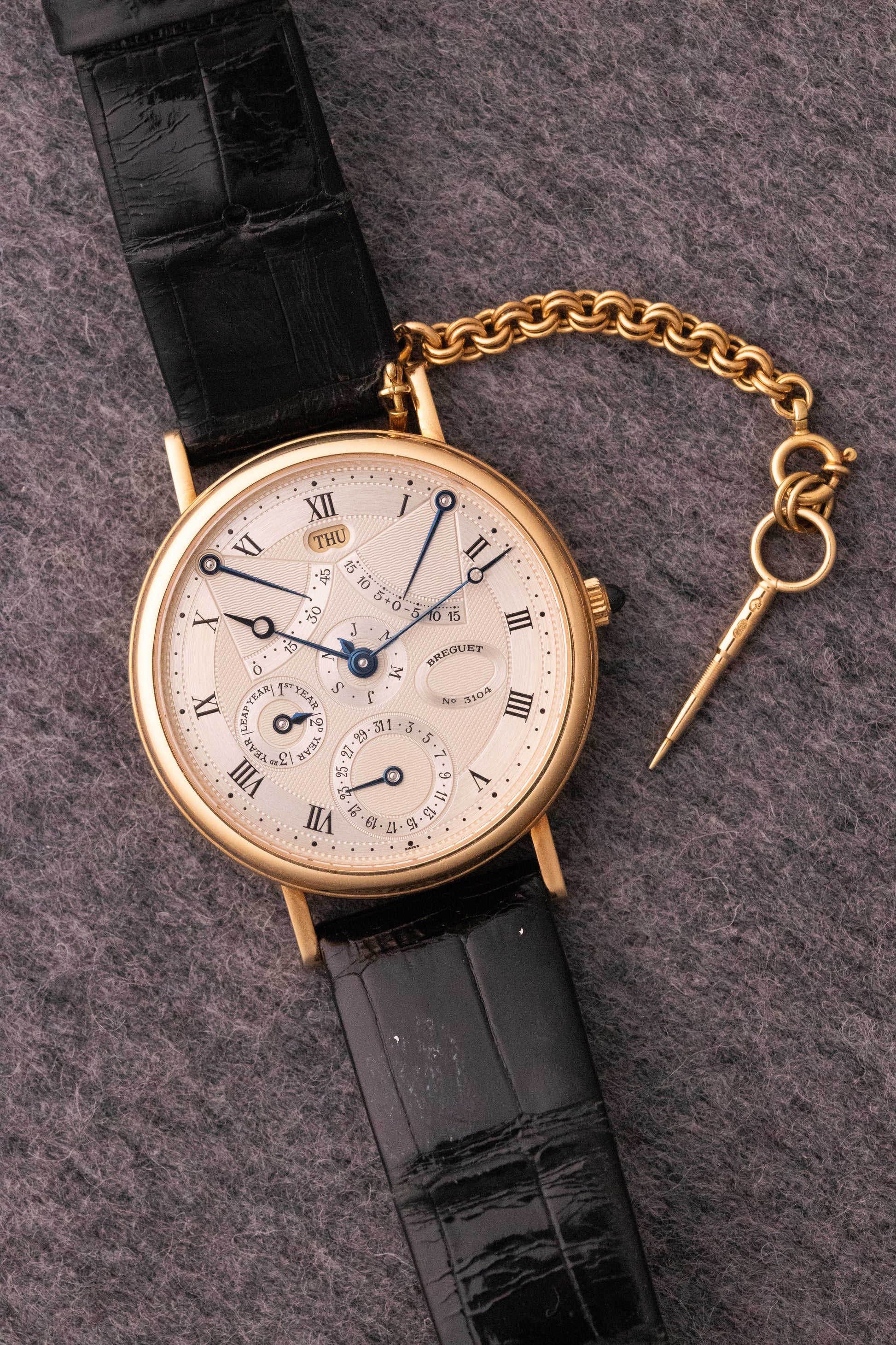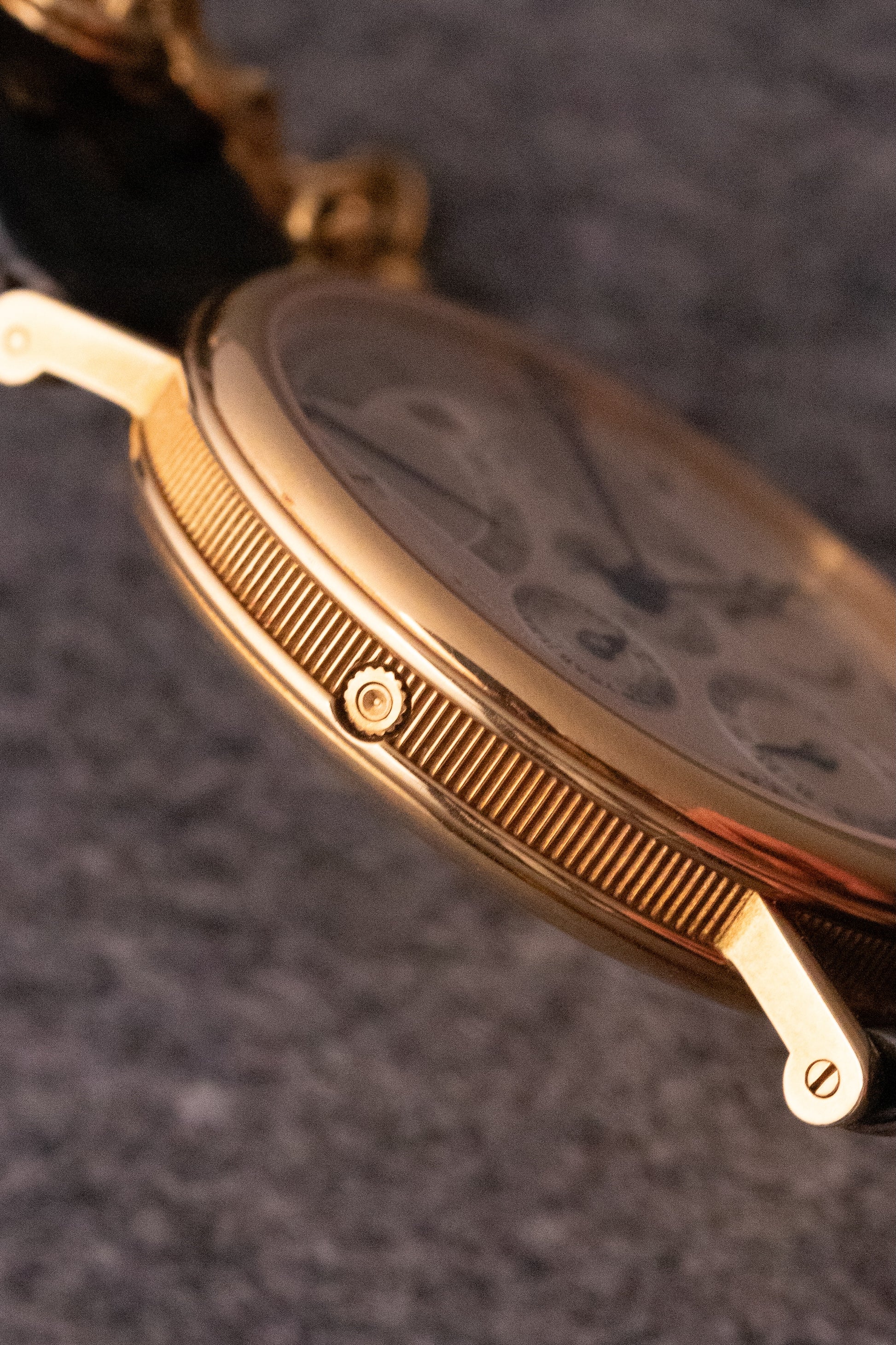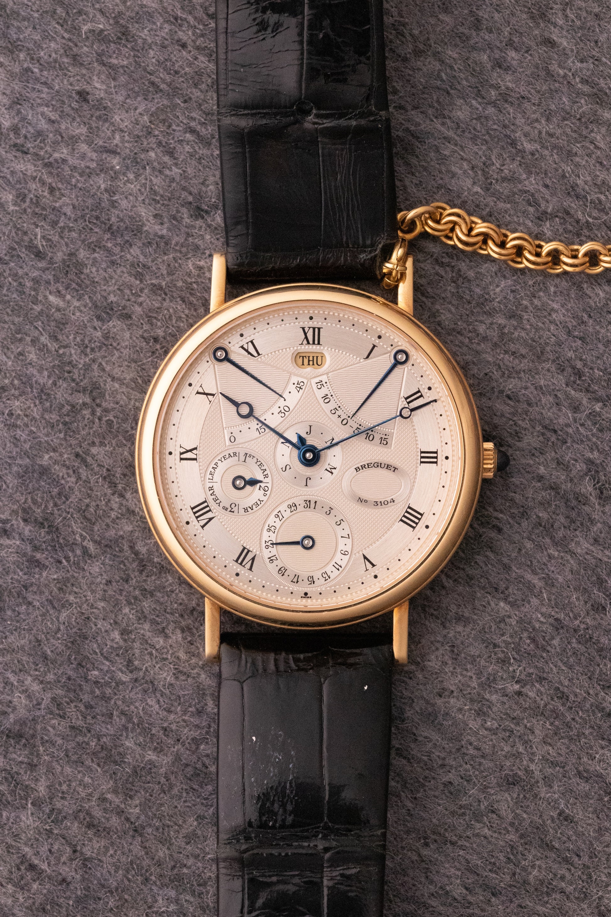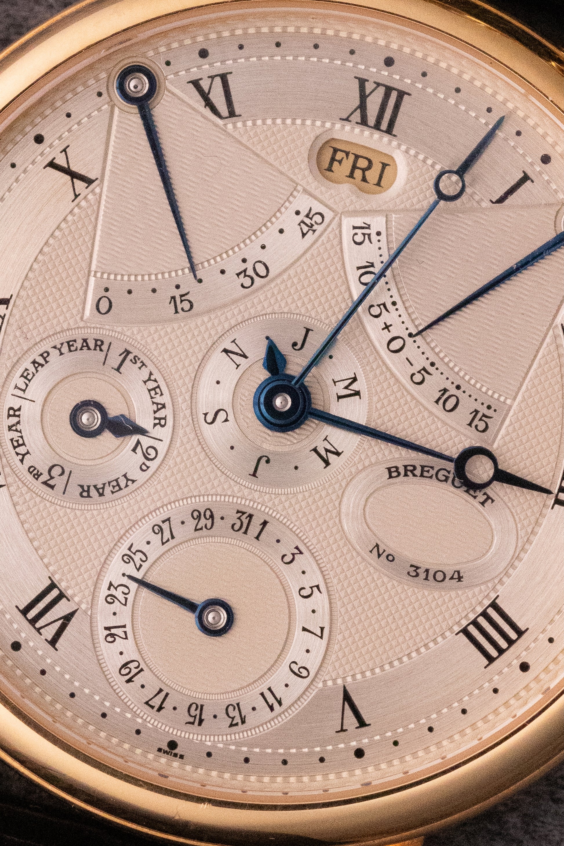 Cadran en or argenté guilloché et satiné, aiguilles Breguet bleuies, index chiffres romains et arabes noirs, indicateurs du jour, de la date, du mois et de l'année bissextile, réserve de marche et équation du temps