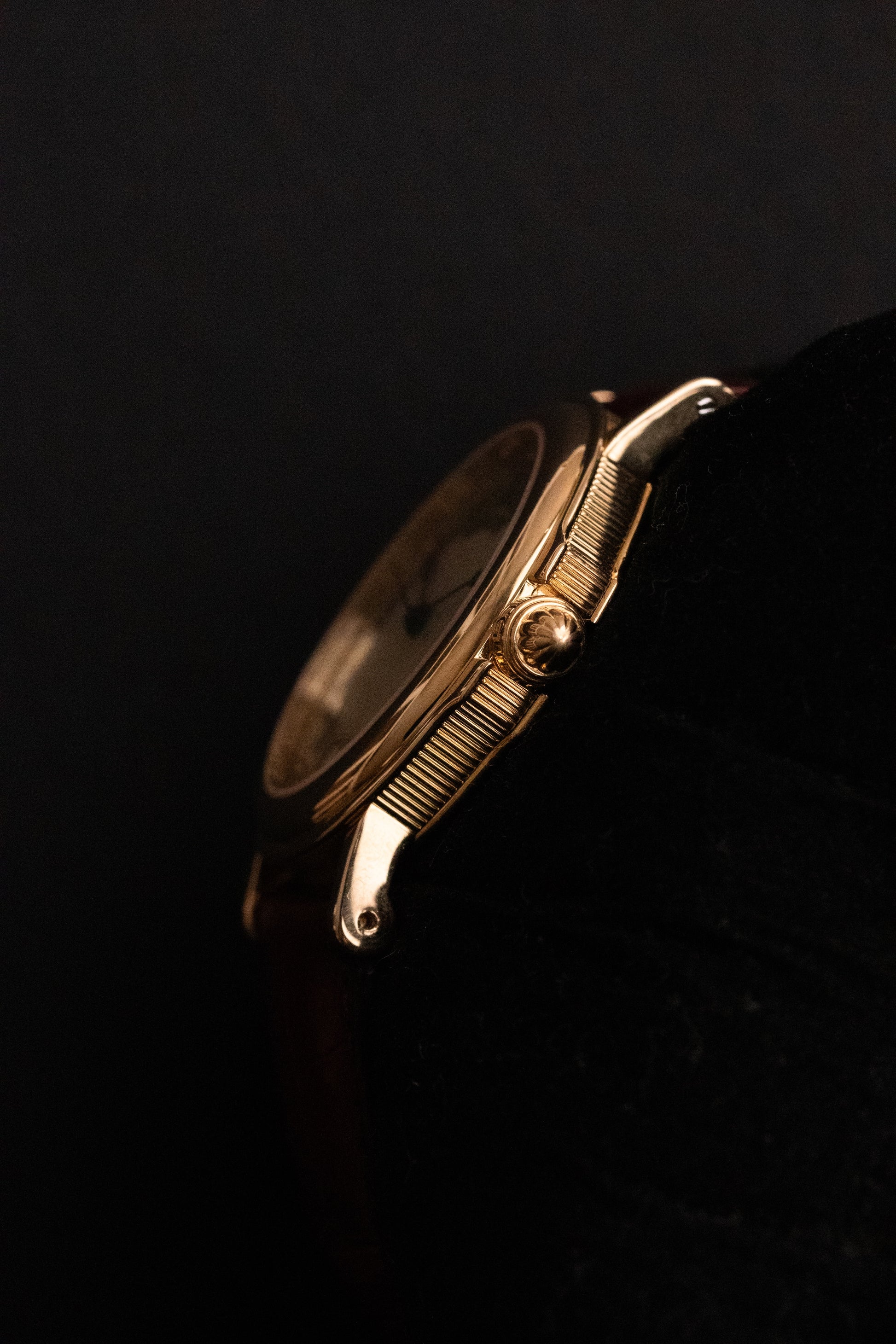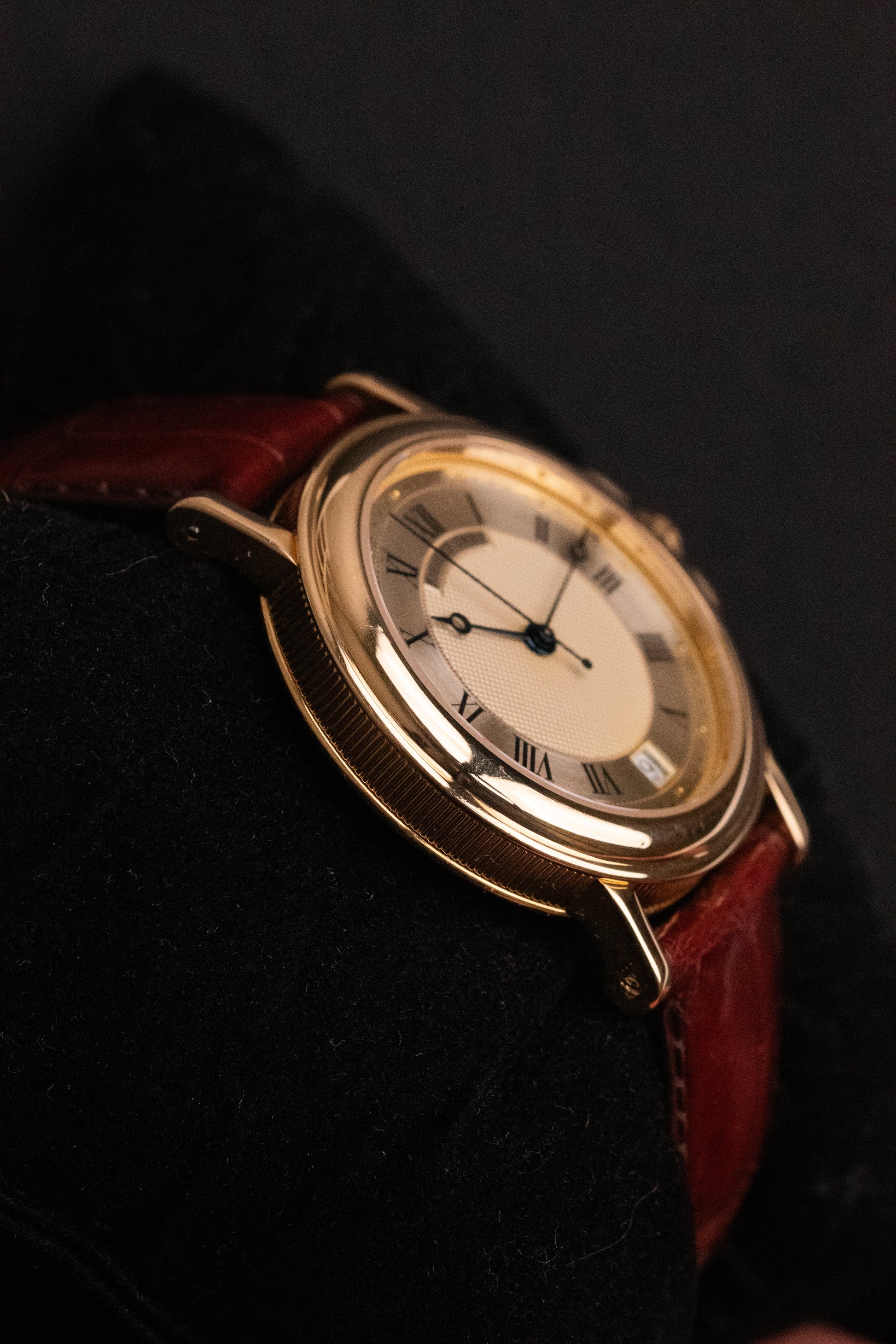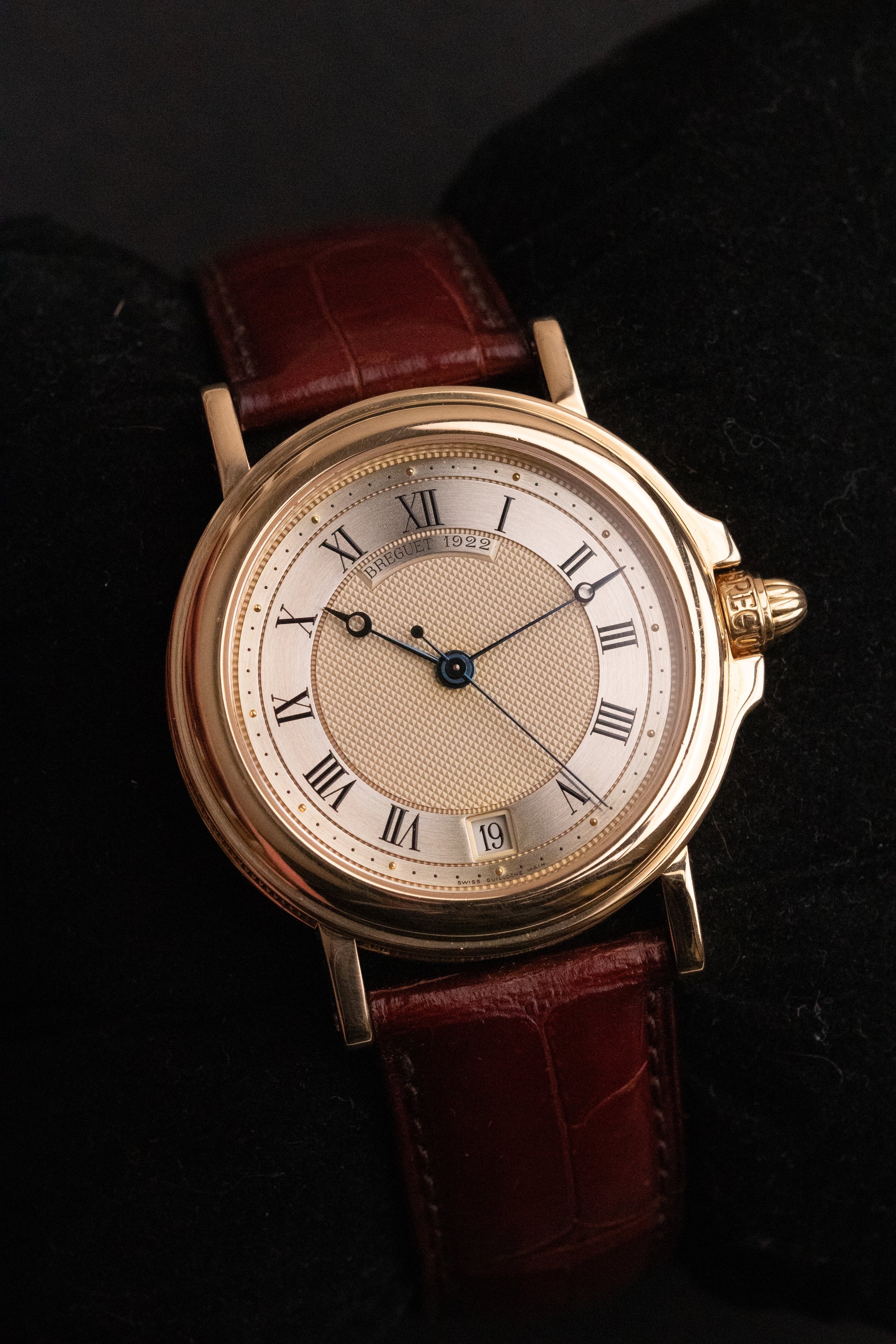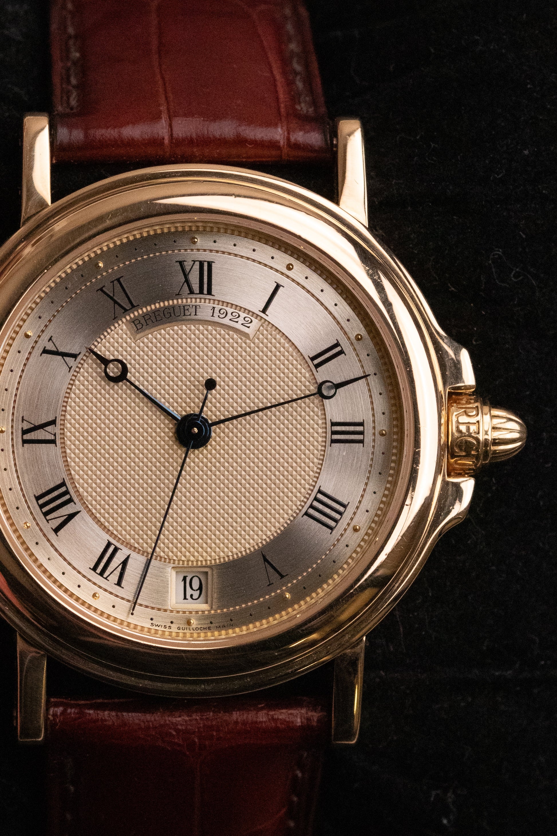 Cadran champagne guilloché, cerclage brossé, index romains, aiguilles bleuies type Breguet