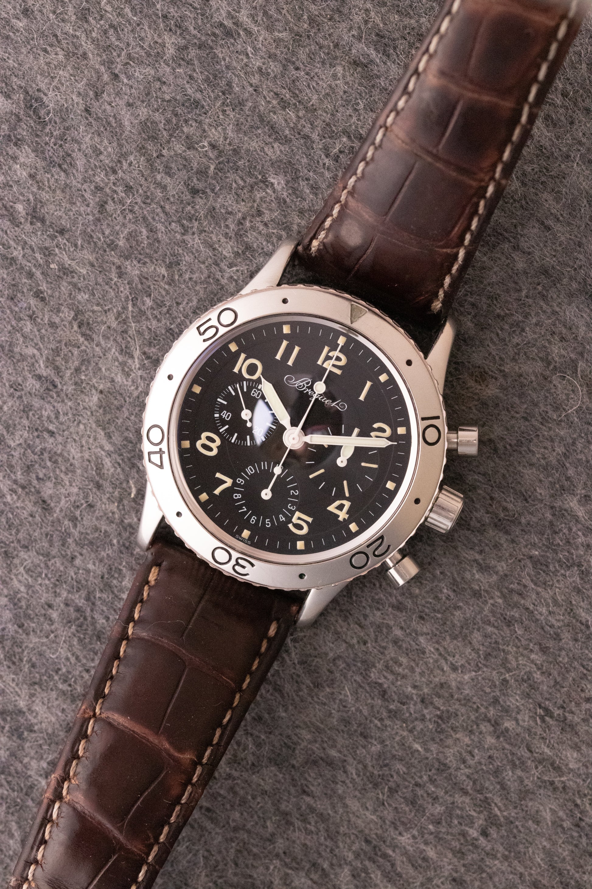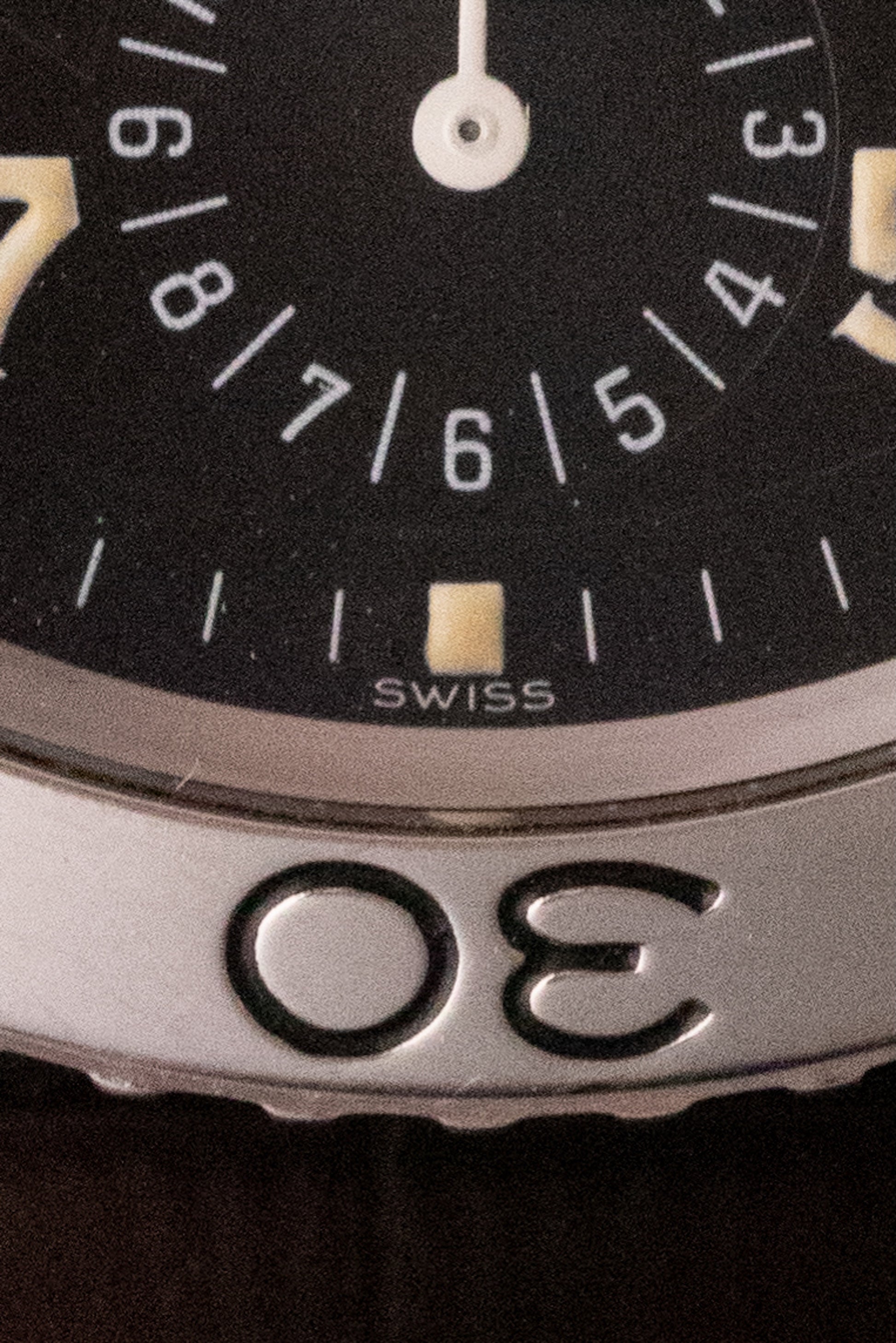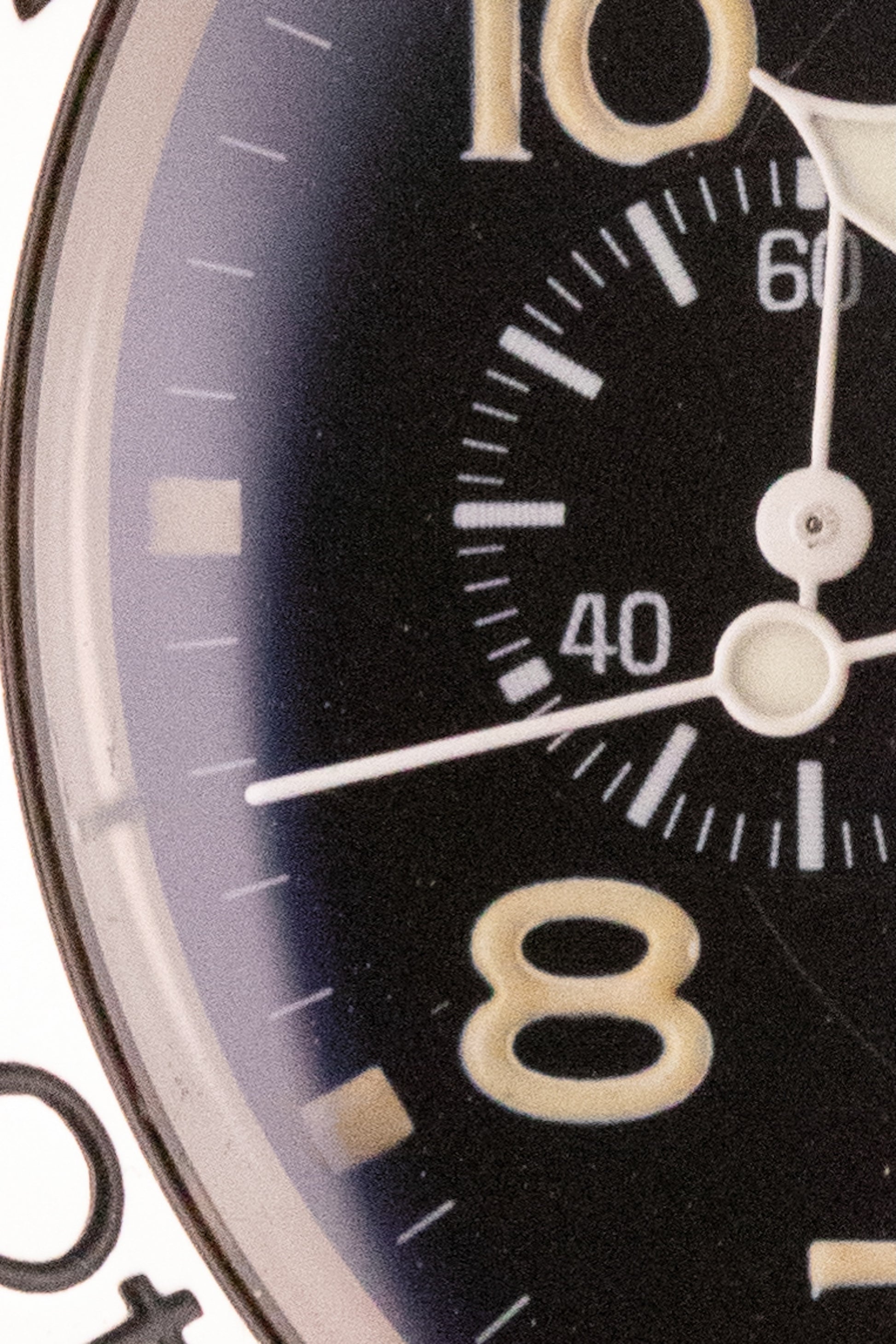 Cadran noir verni, index peints, aiguilles lumineuses, trois sous compteurs, une seconde permanente à 9H, un totaliseur 30min à 3H et un totaliseur 12h à 6H