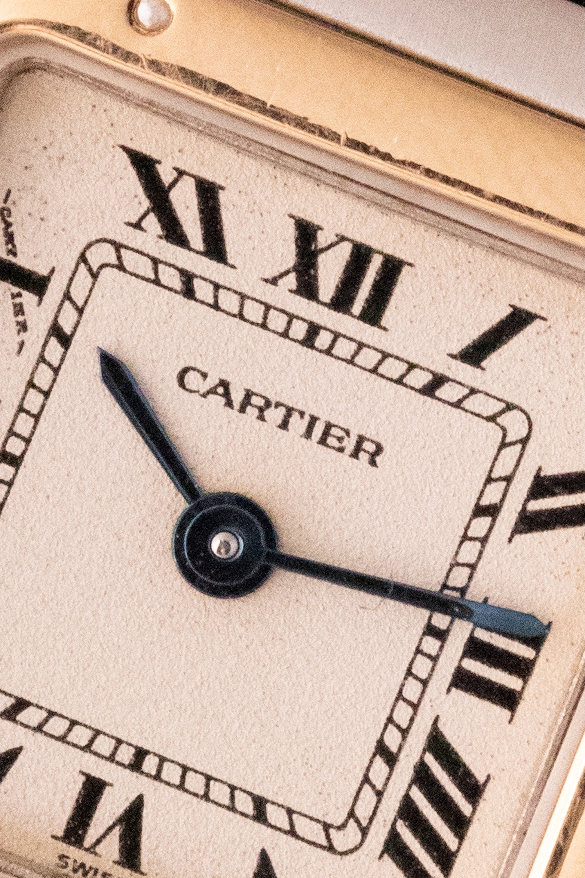Boitier acier 22 x 30mm, lunette or, couronne cabochon, fond vissé
