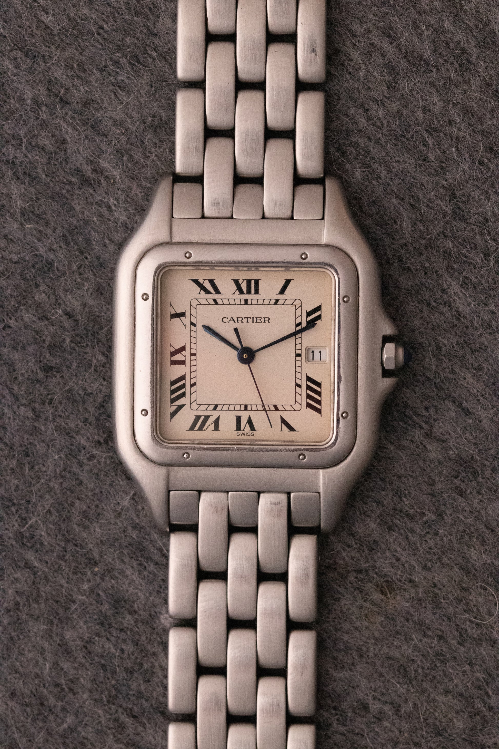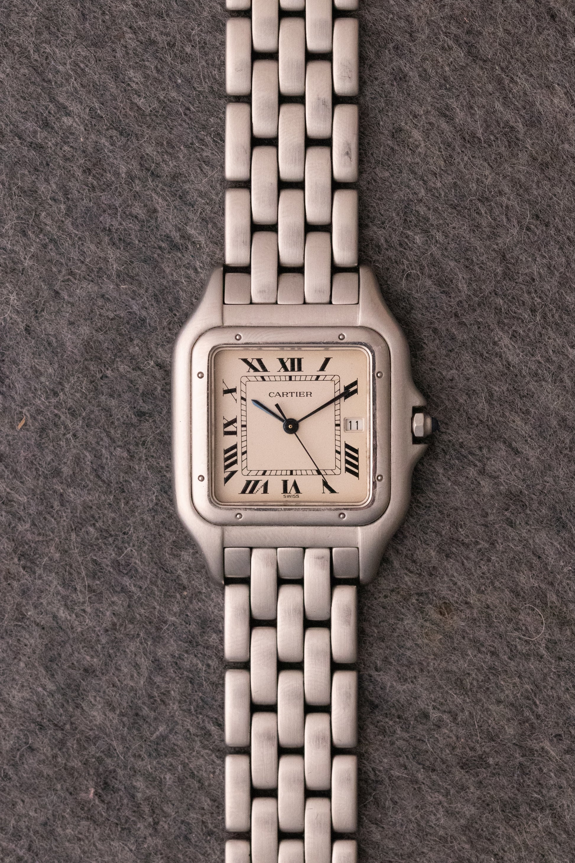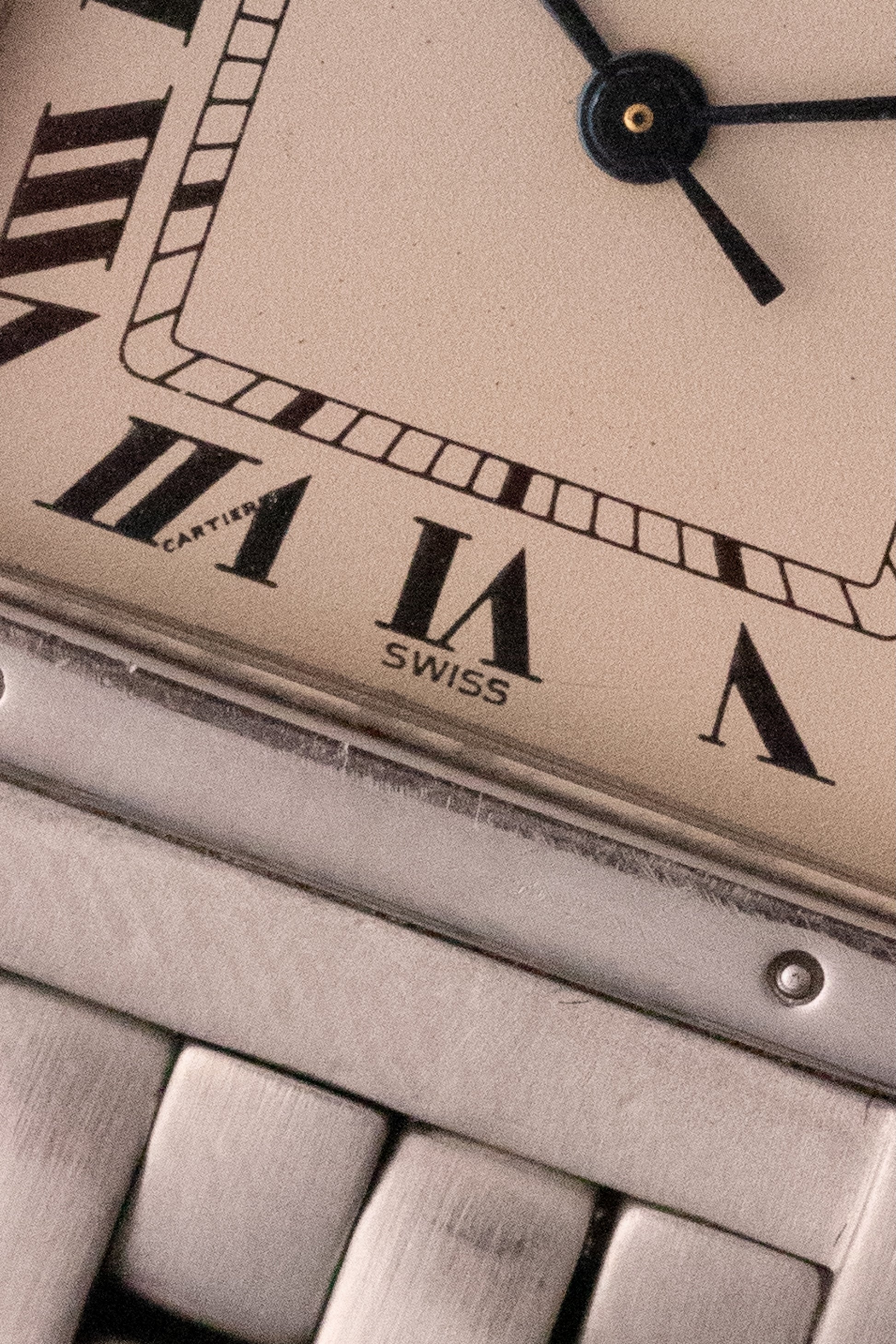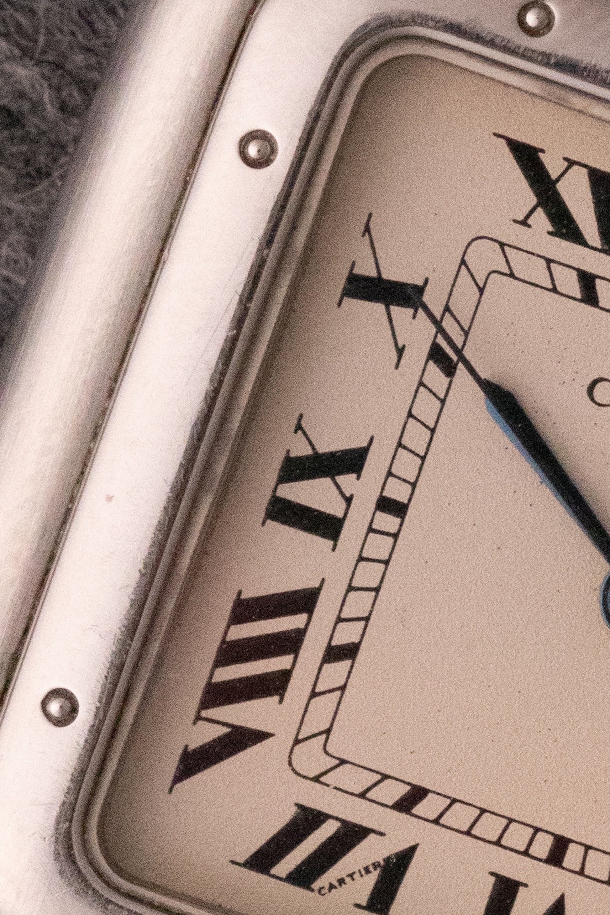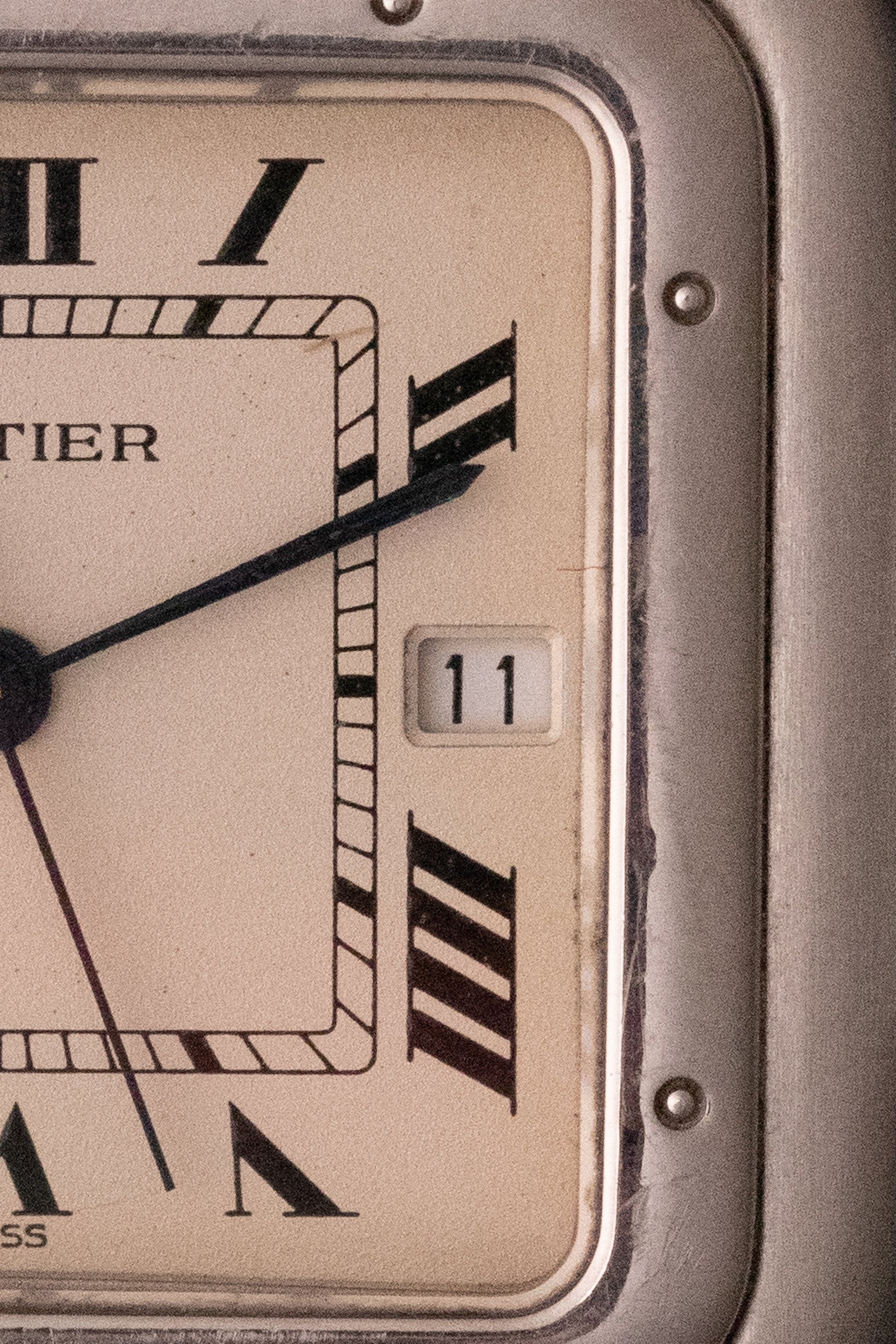 Cadran blanc patiné, index romains peints, chemin de fer peint, date par guichet à 3H
