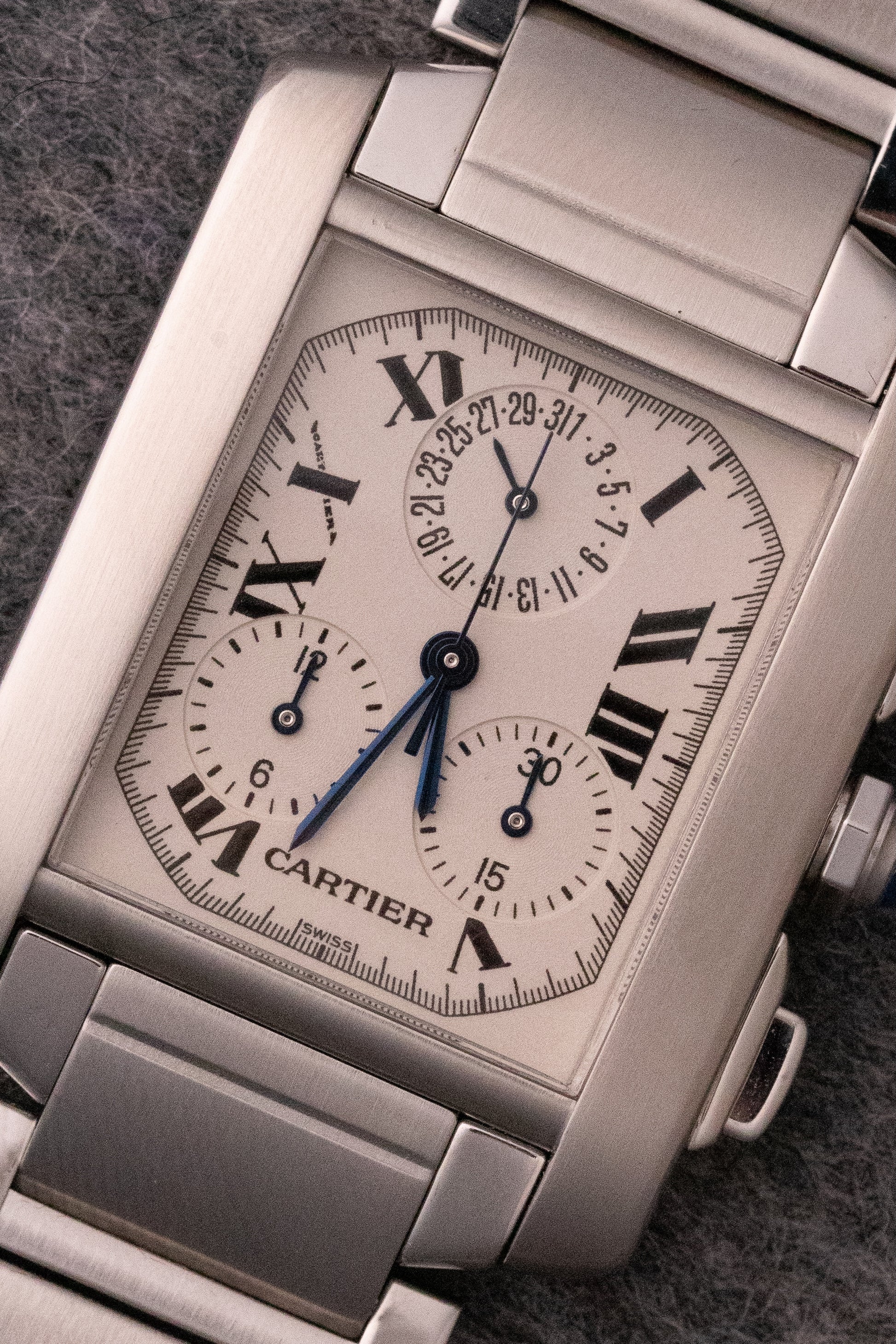 Cadran opalin, index chiffres romains, trois sous compteurs, 1 sous compteur date à 12h, 1 totaliseur 30min à 4H, un totaliseur 12h à 8H