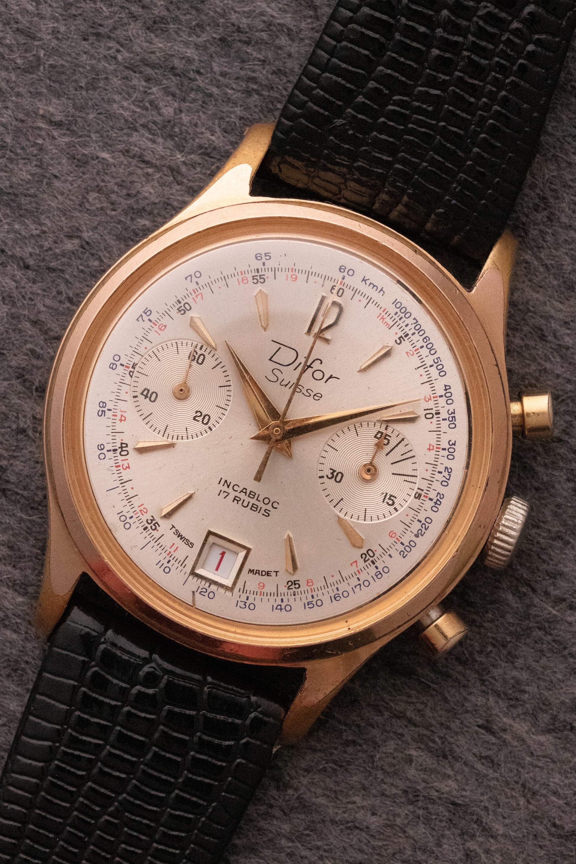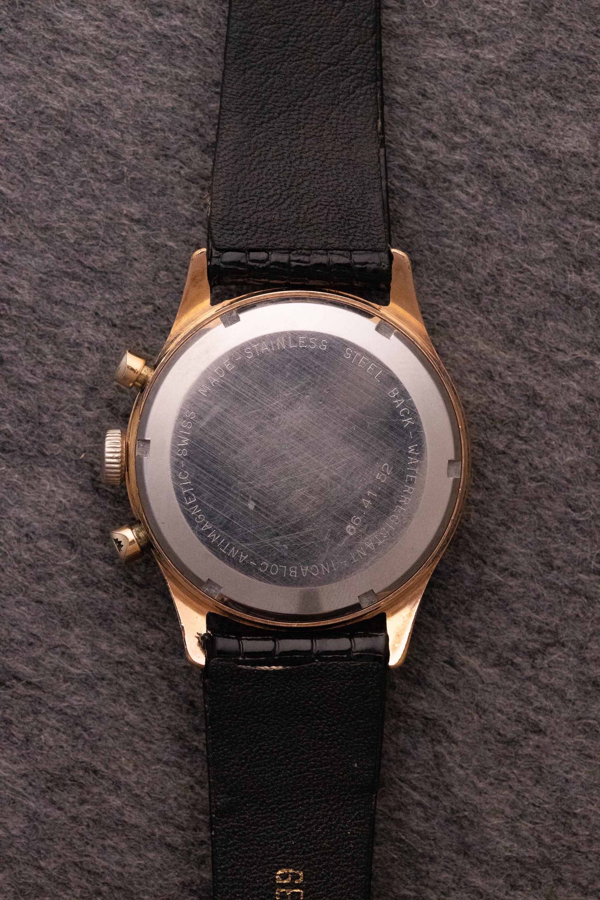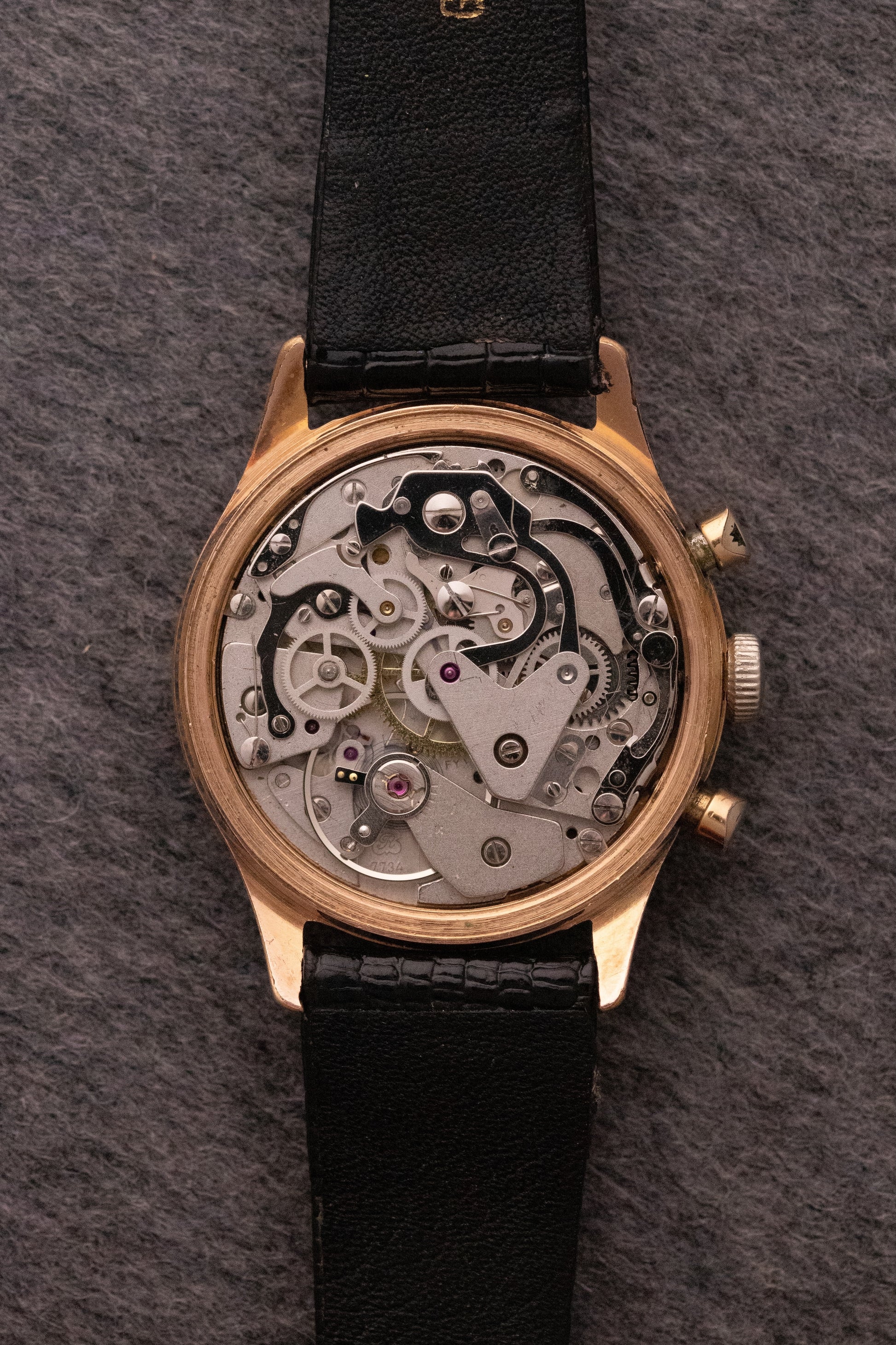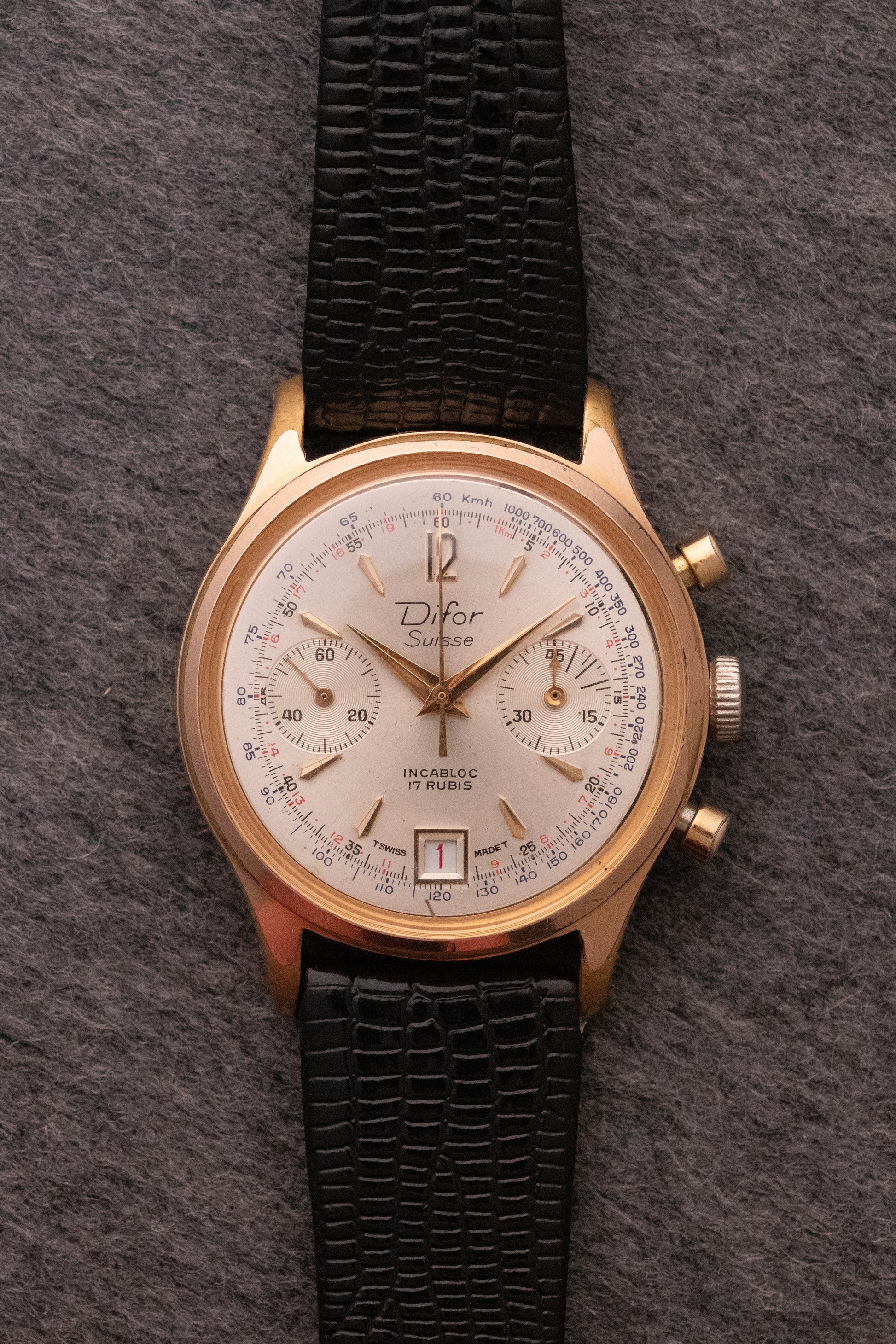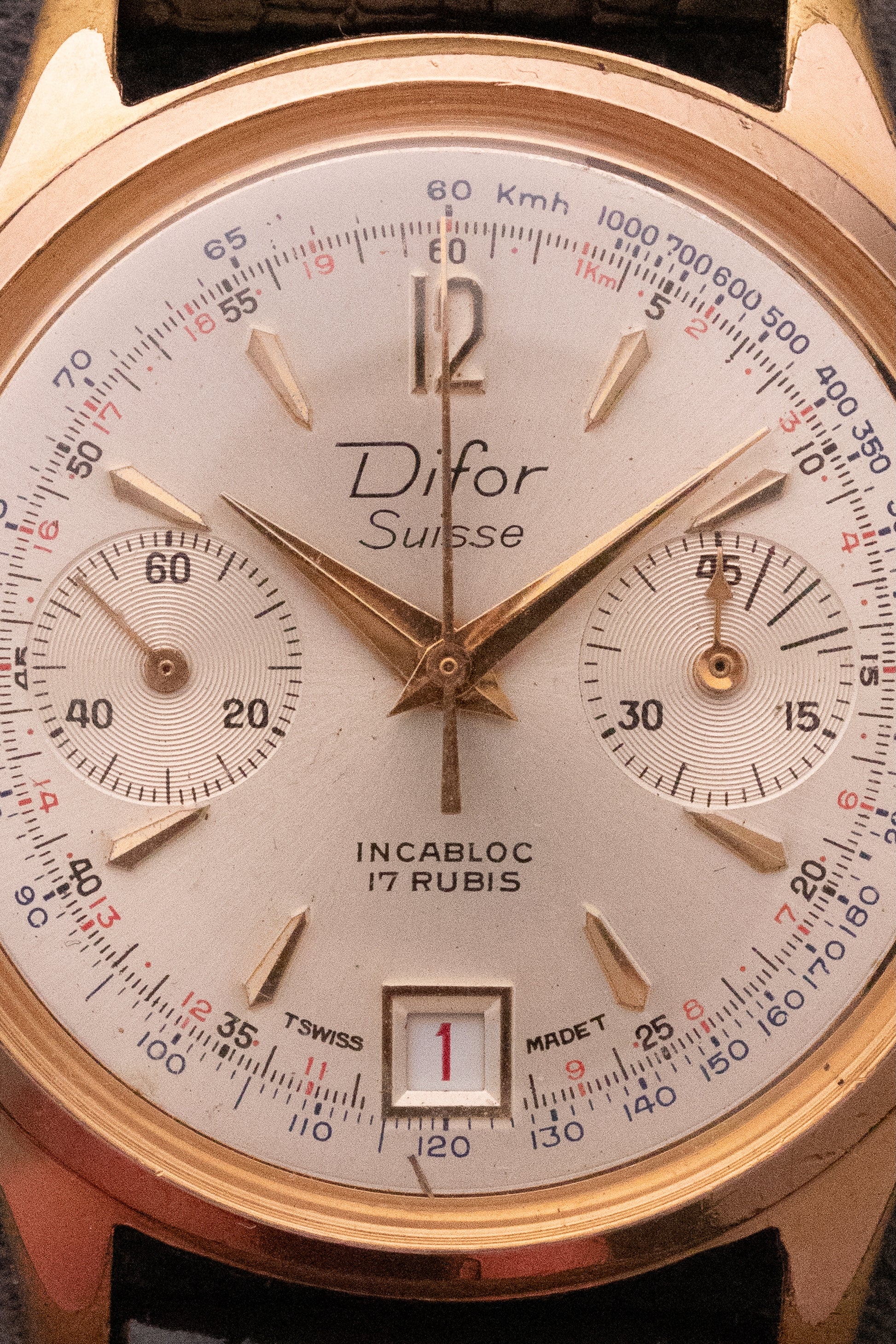 Cadran champagne brillant, index appliqués or, aiguilles dauphines dorées, date par guichet à 6H, deux sous compteurs, une seconde permanente à 9H, un totaliseur 45min à 3H