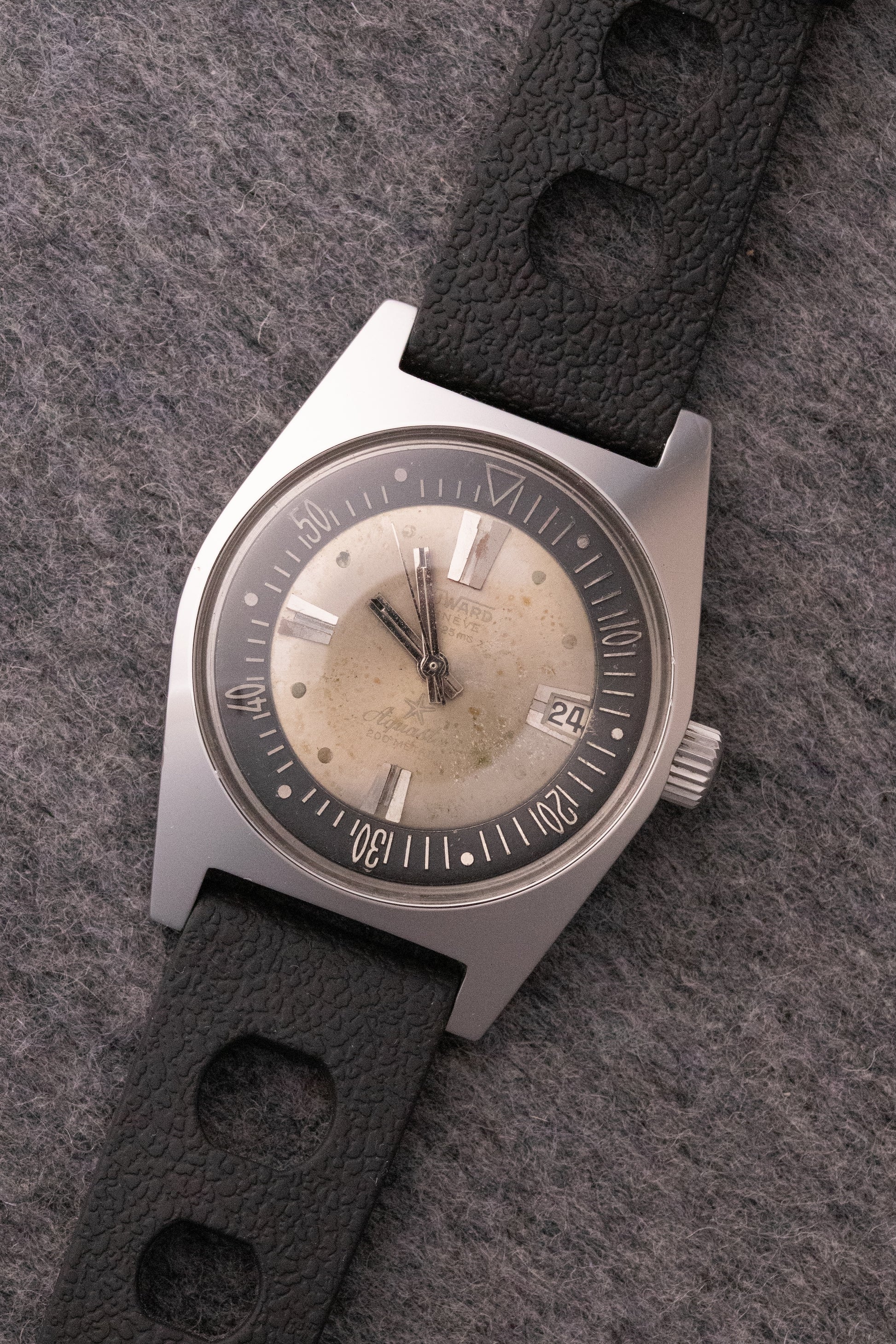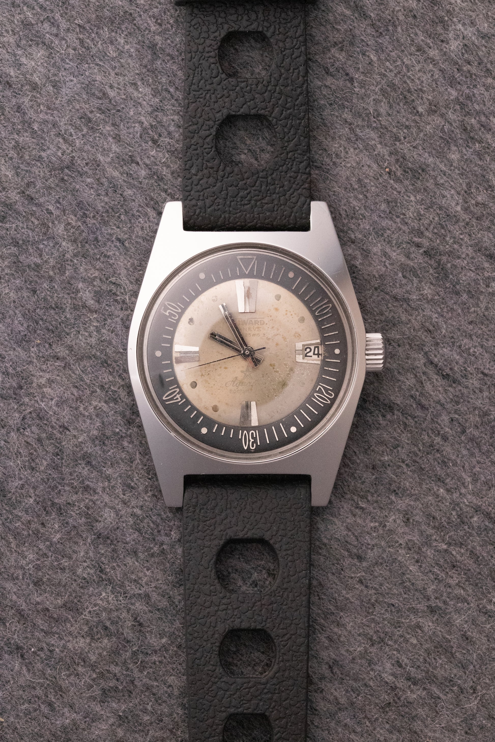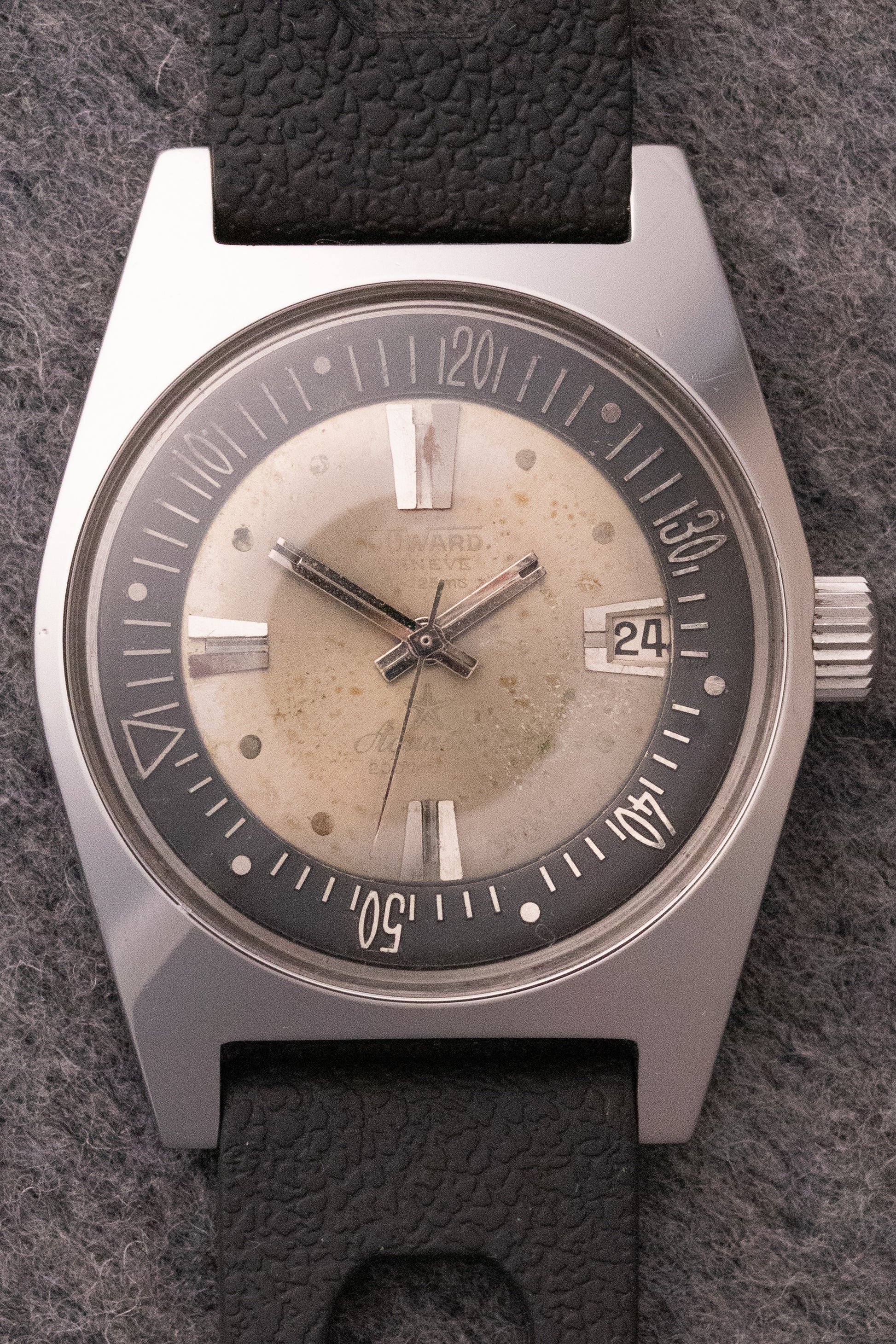 Cadran champagne, index appliqués, aiguilles bâtons, lunette interne, date par guichet à 3H
