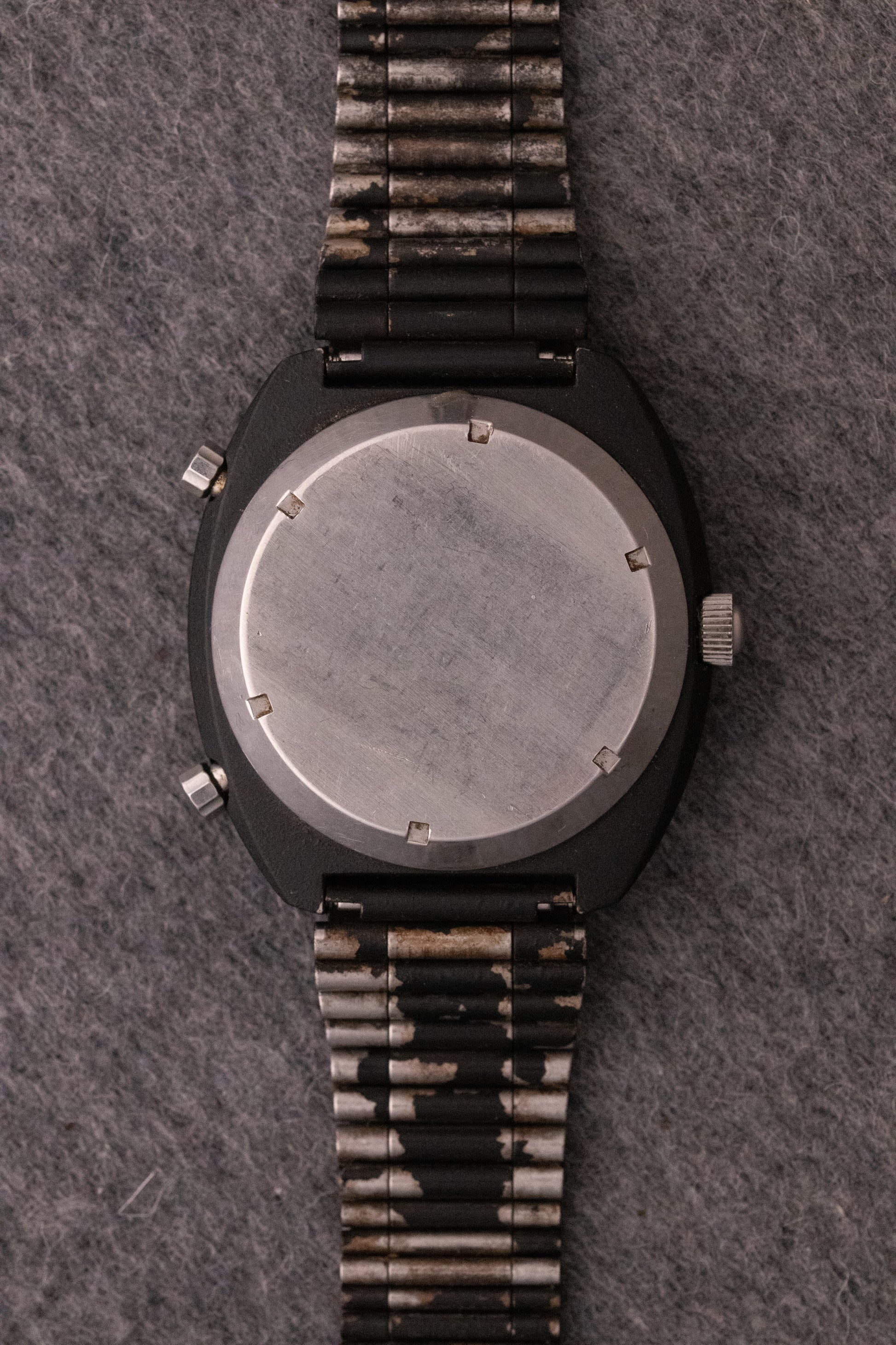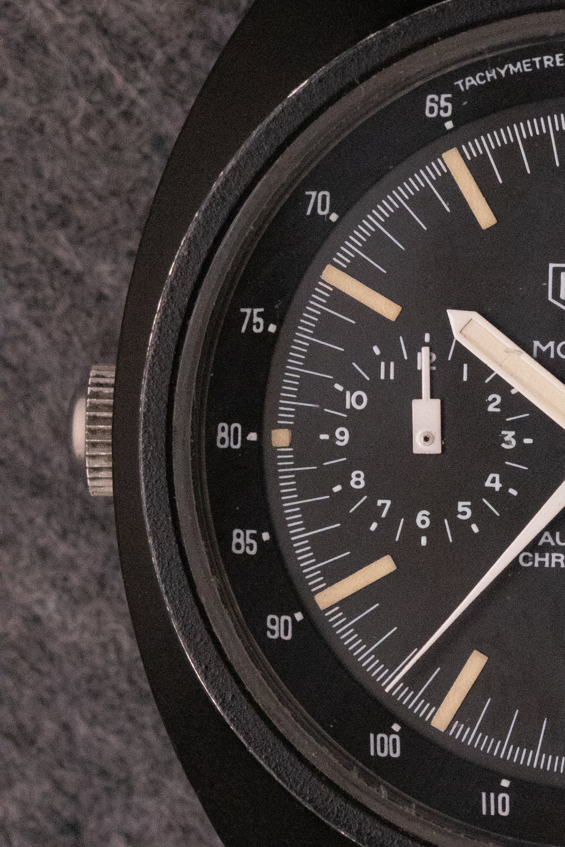 Cadran noir mat, index bâtons, aiguilles épées lumineuses, deux sous compteurs, 1 totaliseur 30min à 3H, un totaliseur 12h à 9H, date par guichet à 6H
