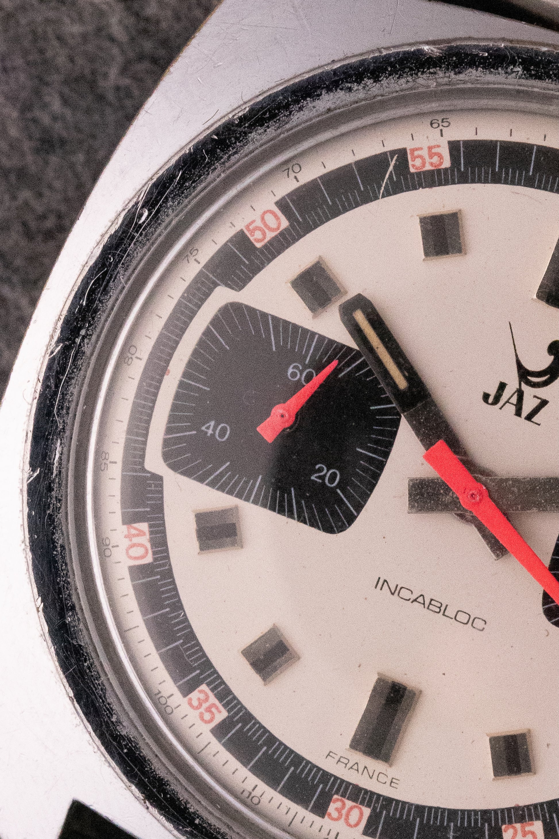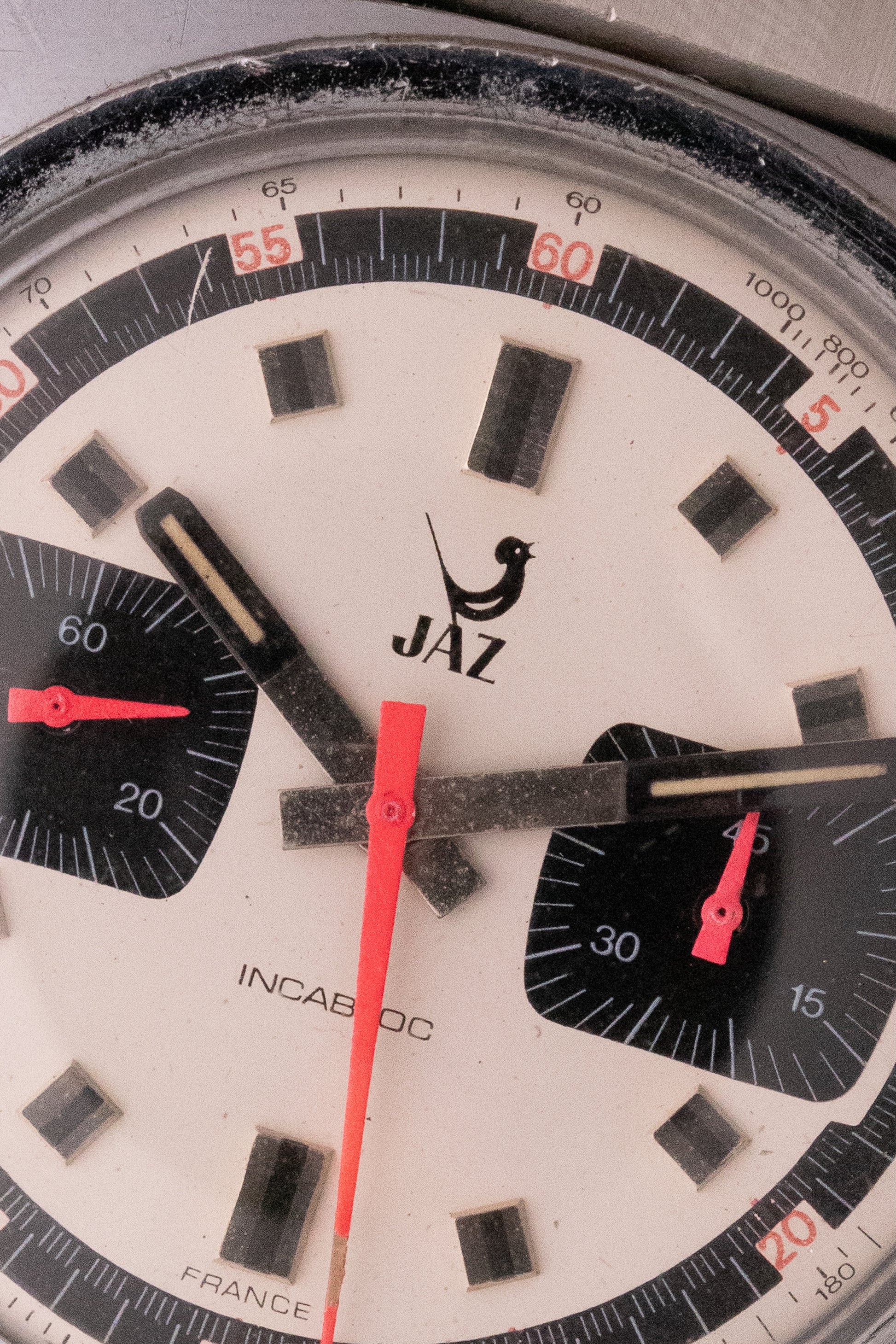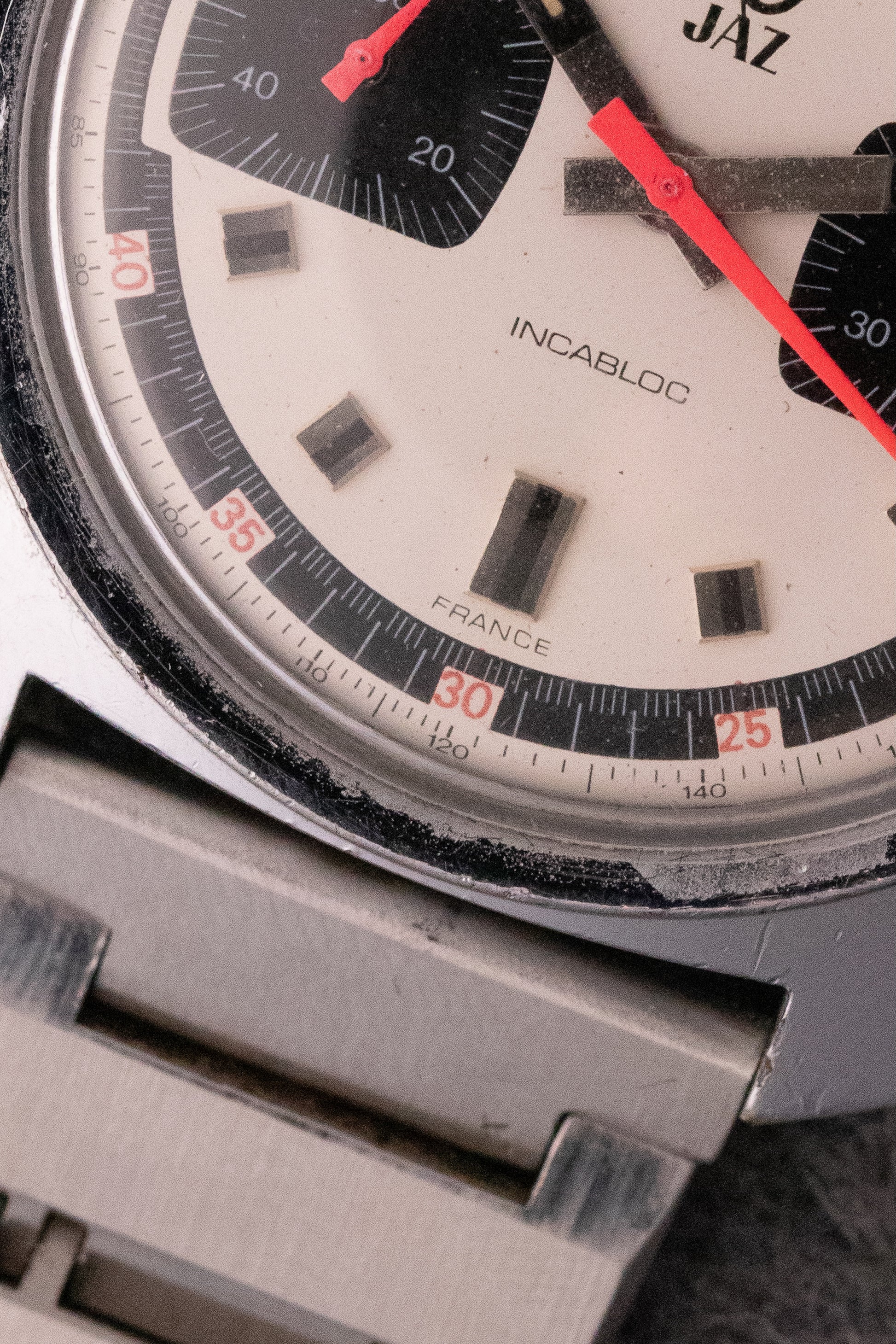 Cadran blanc cassé panda, aiguilles bâtons, acier et noires, trotteuse et aiguilles de sous compteurs corail, index bâtons, deux sous compteurs, une seconde permanente à 9H, un totaliseur 30min à 3H