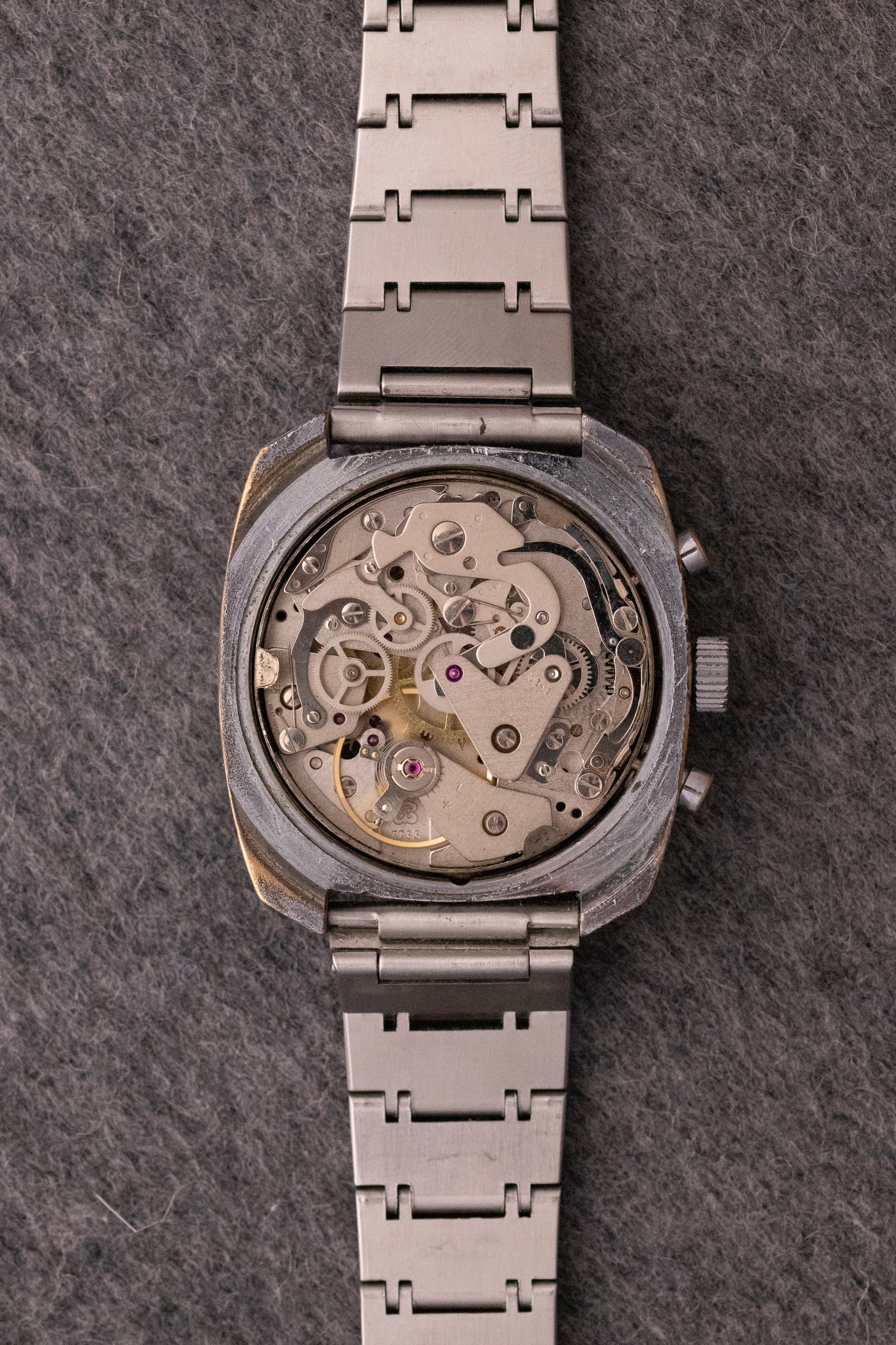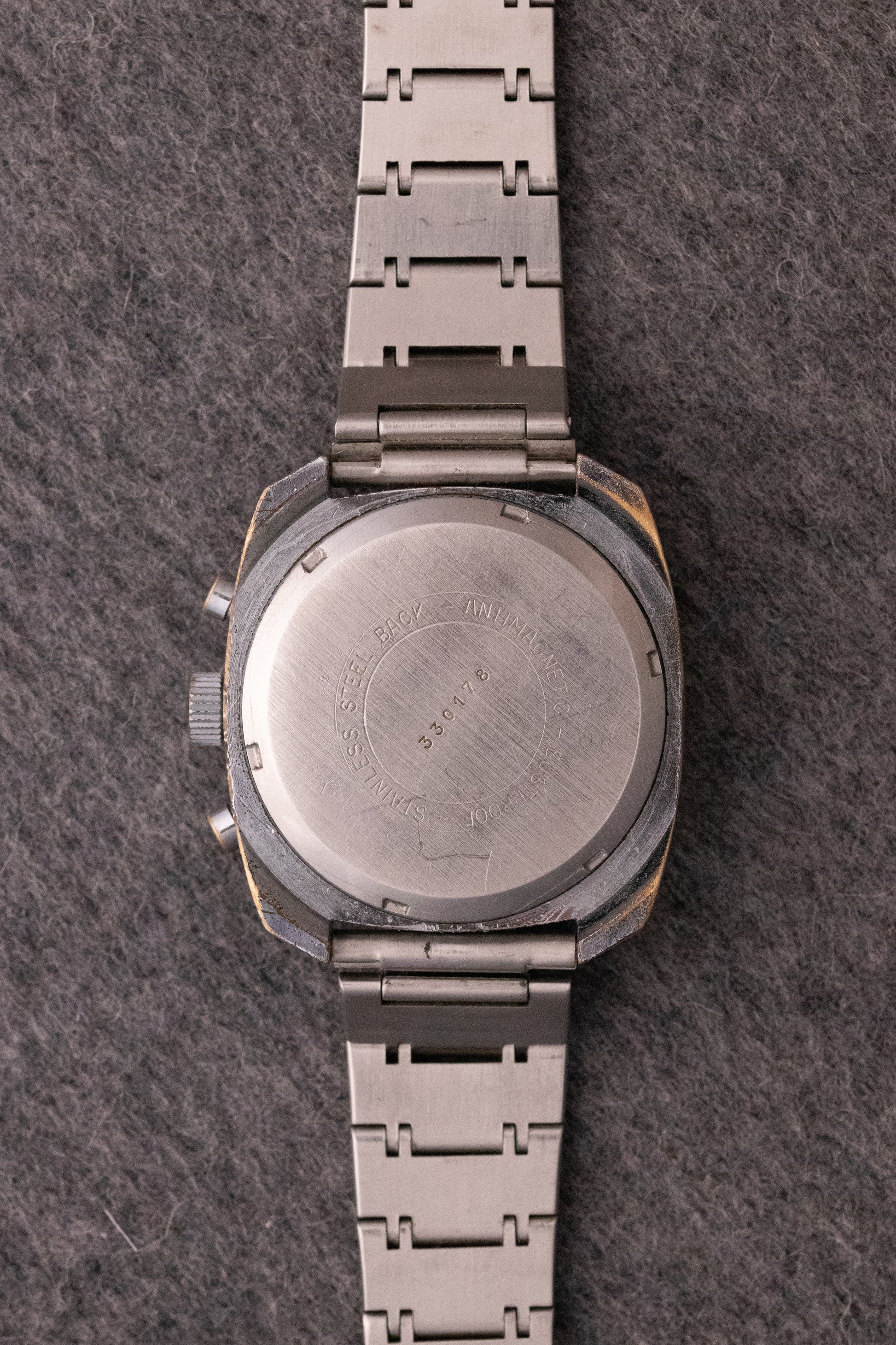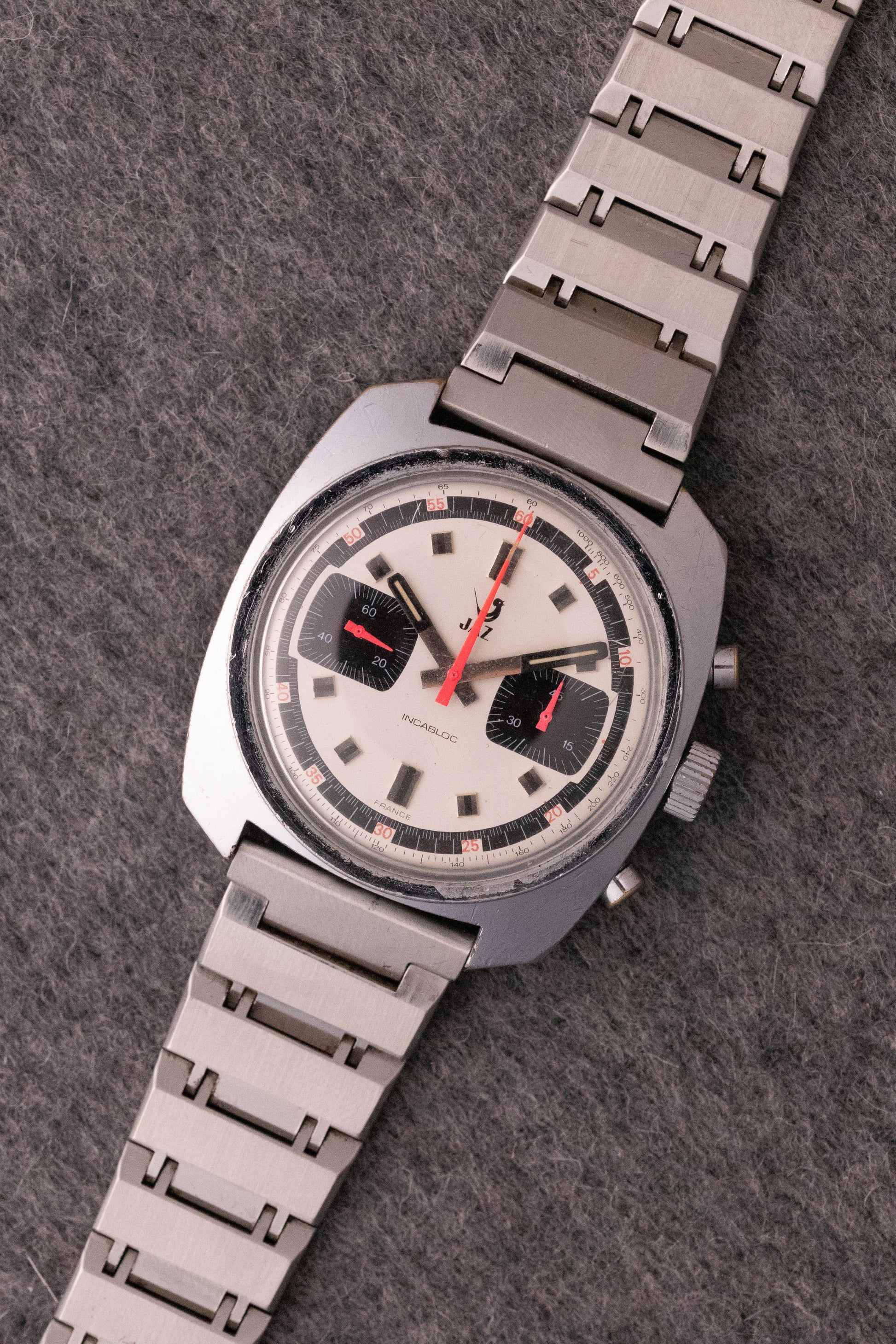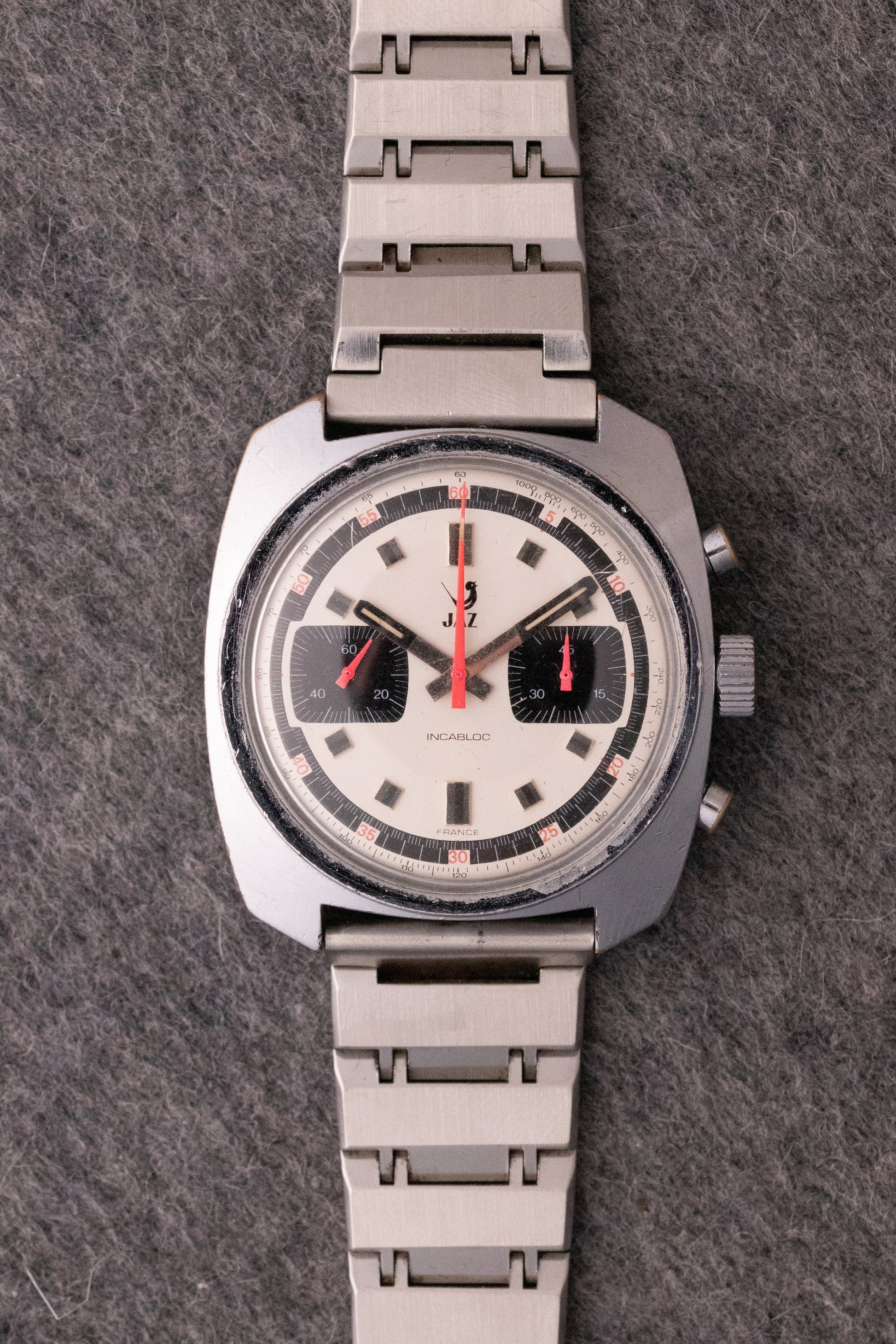 Cadran blanc cassé panda, aiguilles bâtons, acier et noires, trotteuse et aiguilles de sous compteurs corail, index bâtons, deux sous compteurs, une seconde permanente à 9H, un totaliseur 30min à 3H