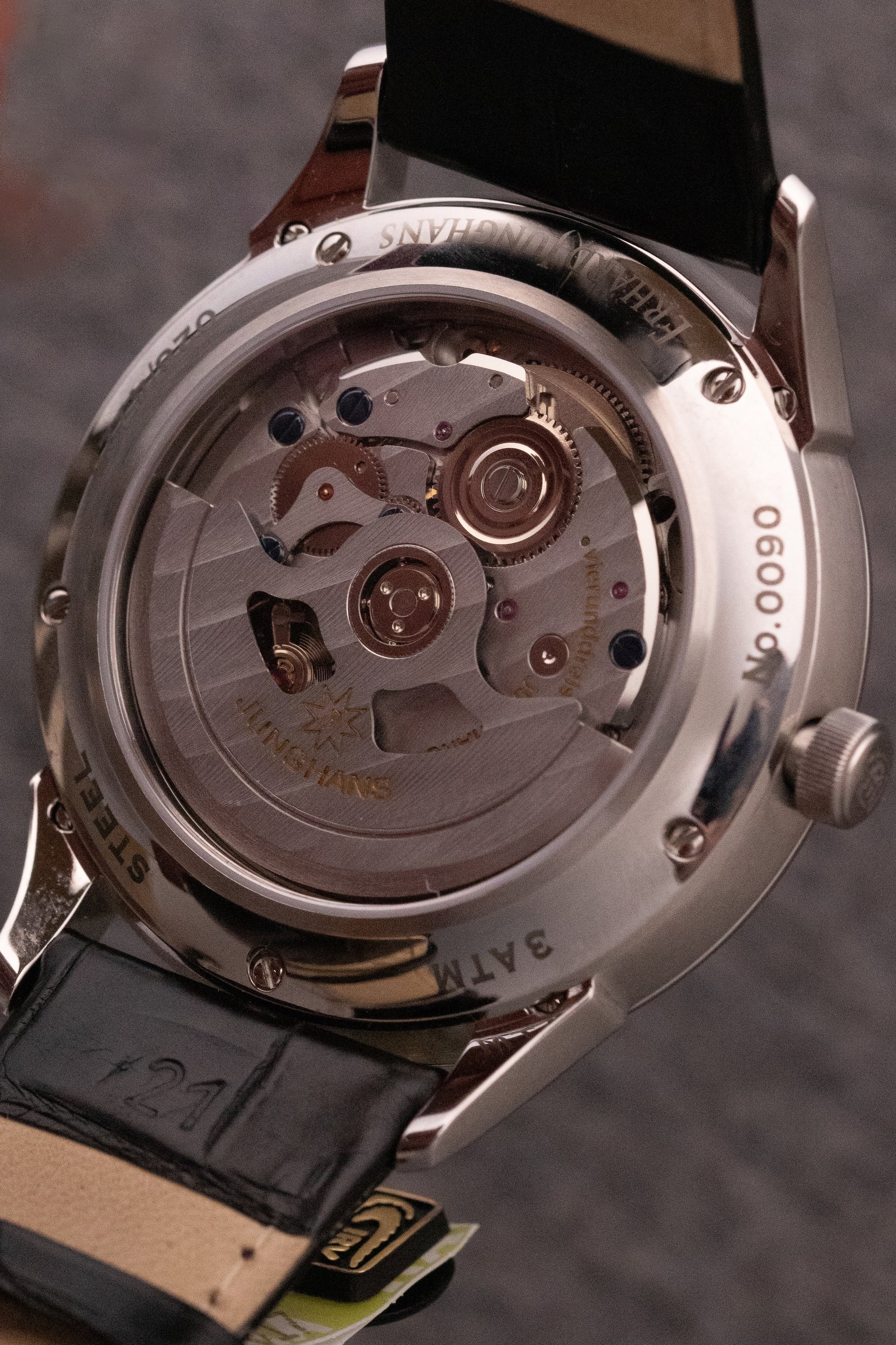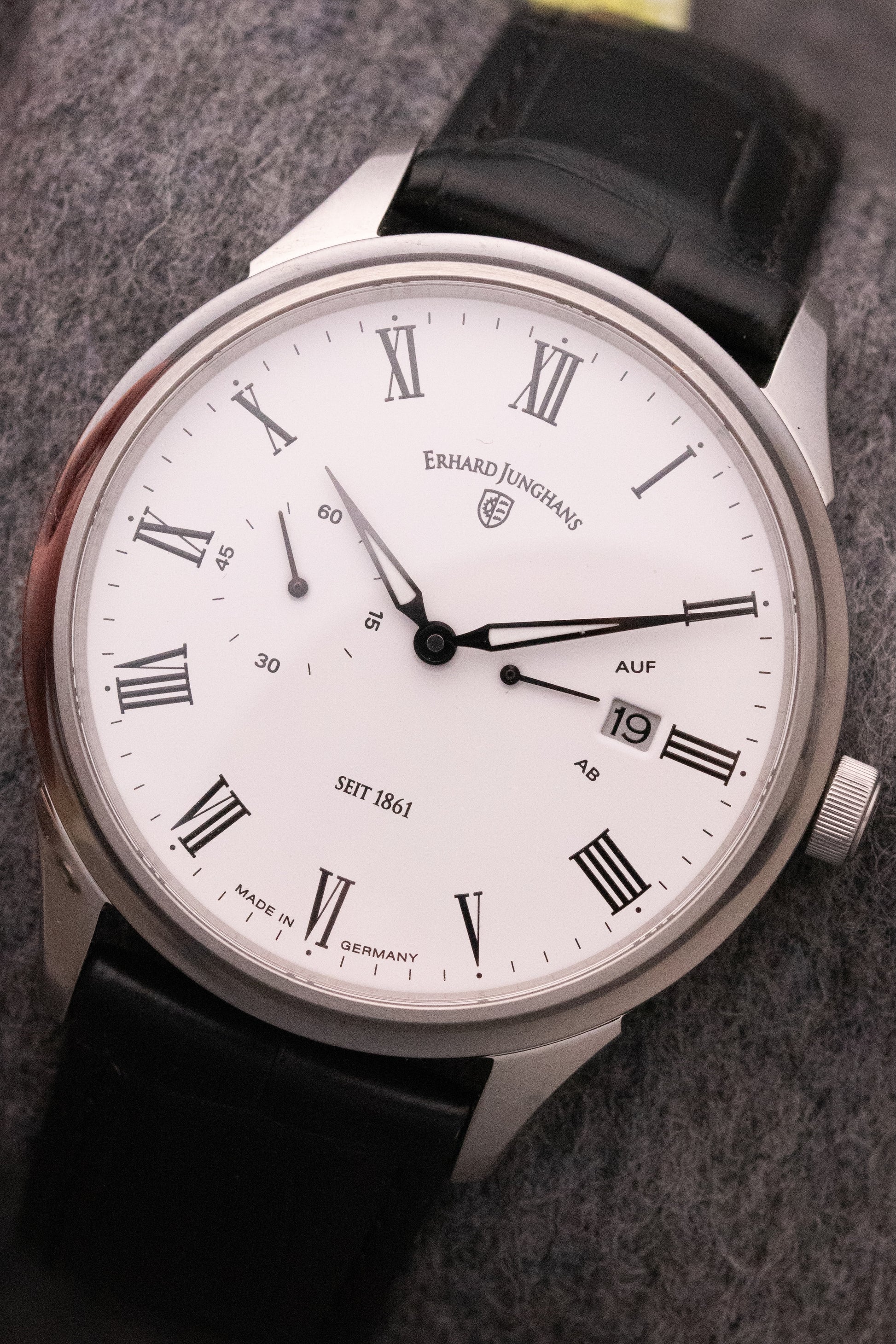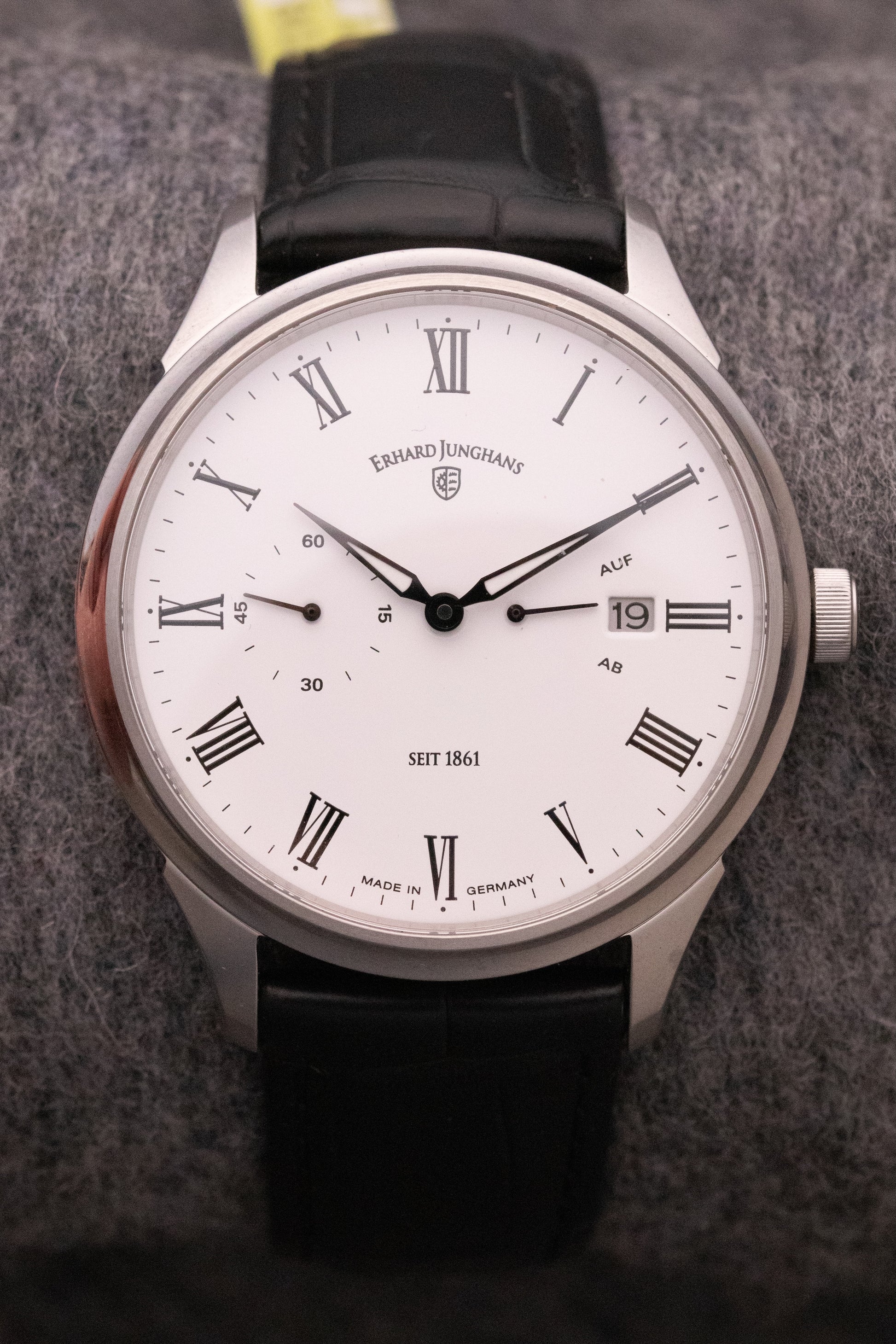 Cadran blanc mat, chiffres romains peints, petite seconde à 9H, réserve de marche et date par guichet à 3H, aiguilles feuilles