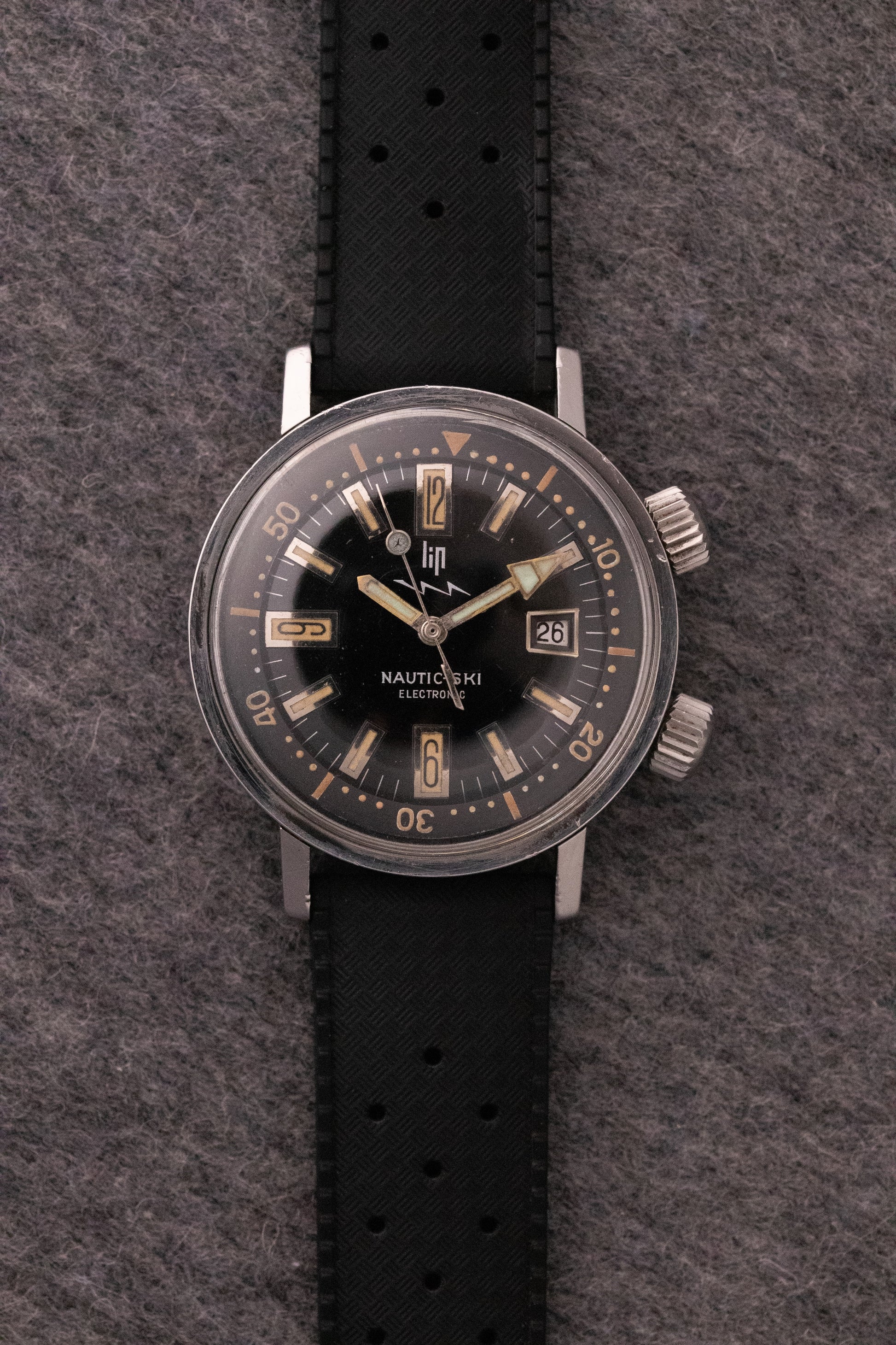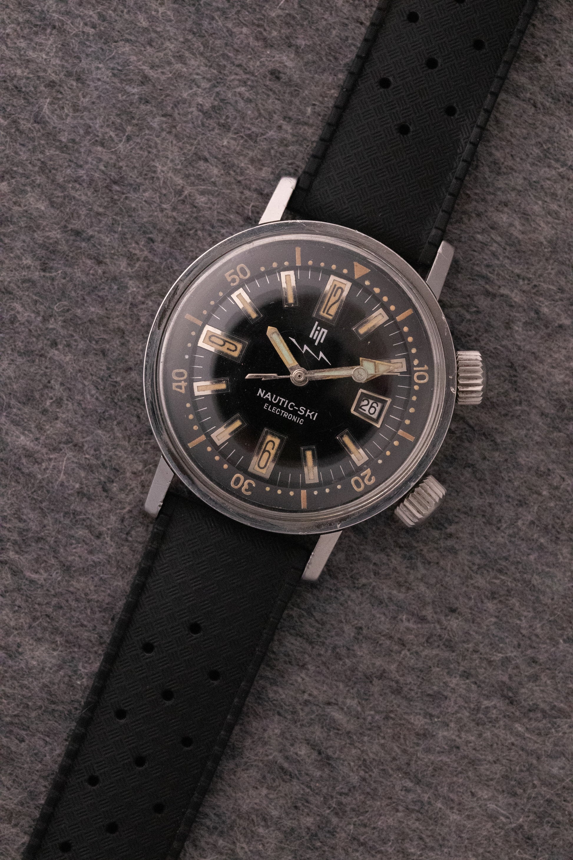 Cadran noir vernis, index et aiguilles tritium, date par guichet à 3H, lunette interne noire