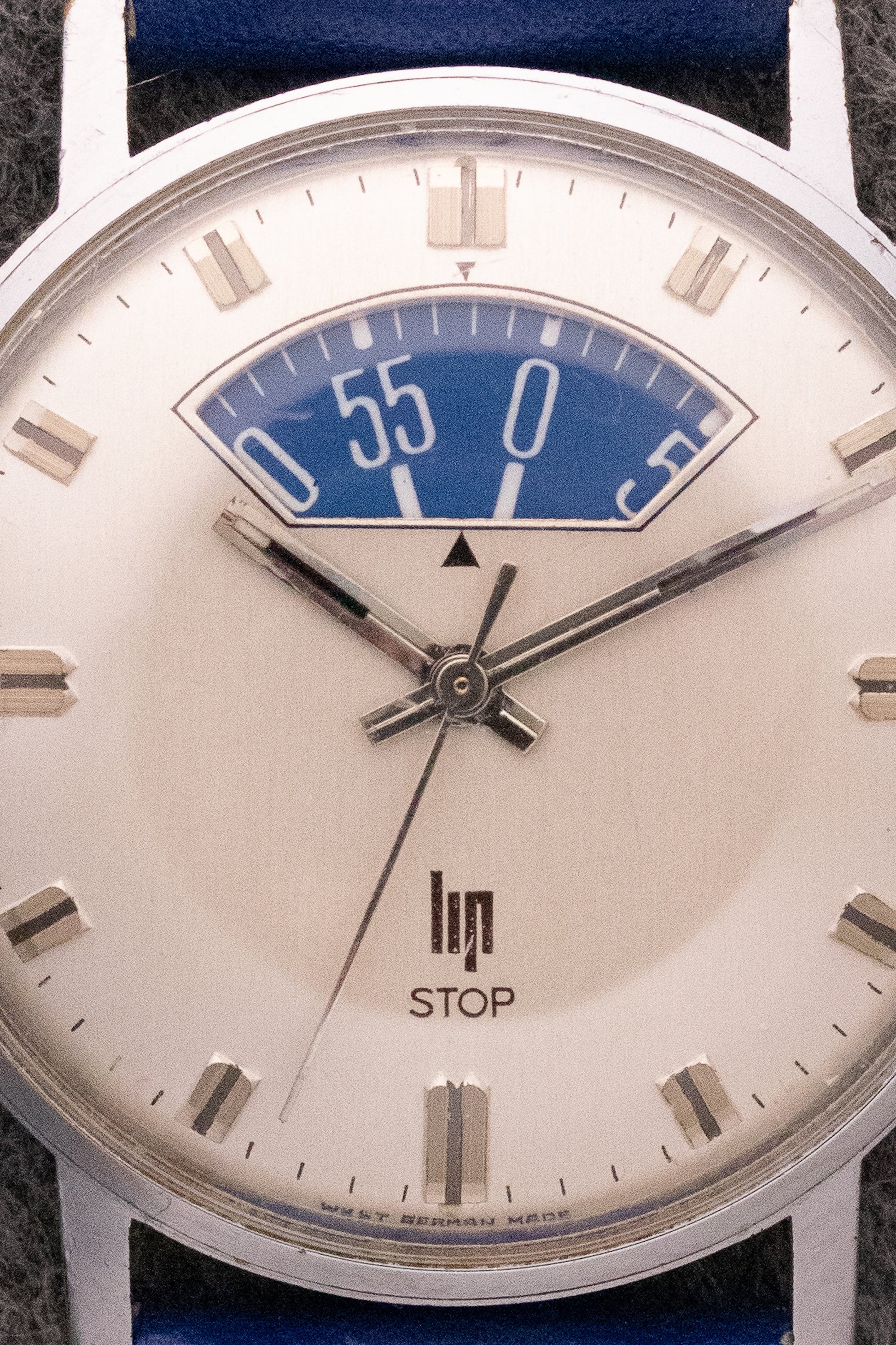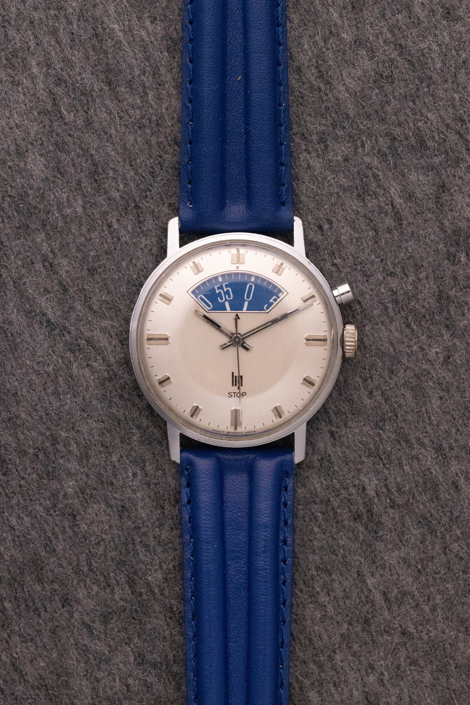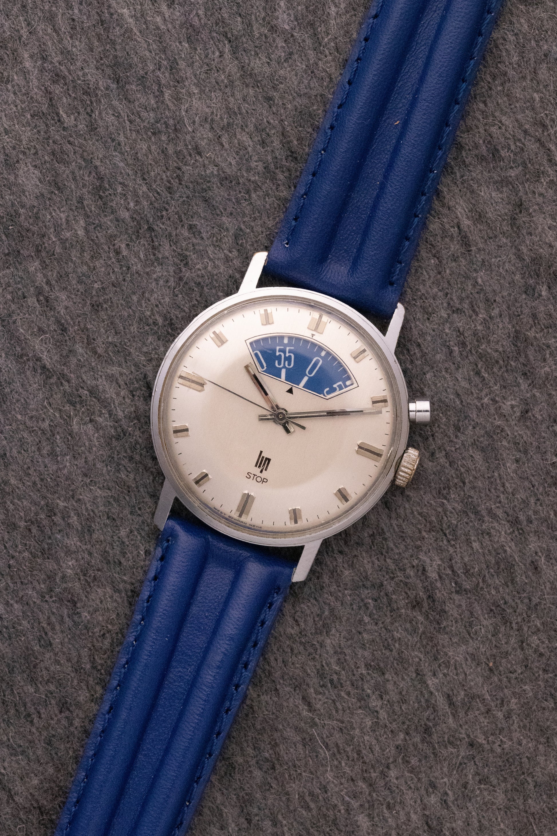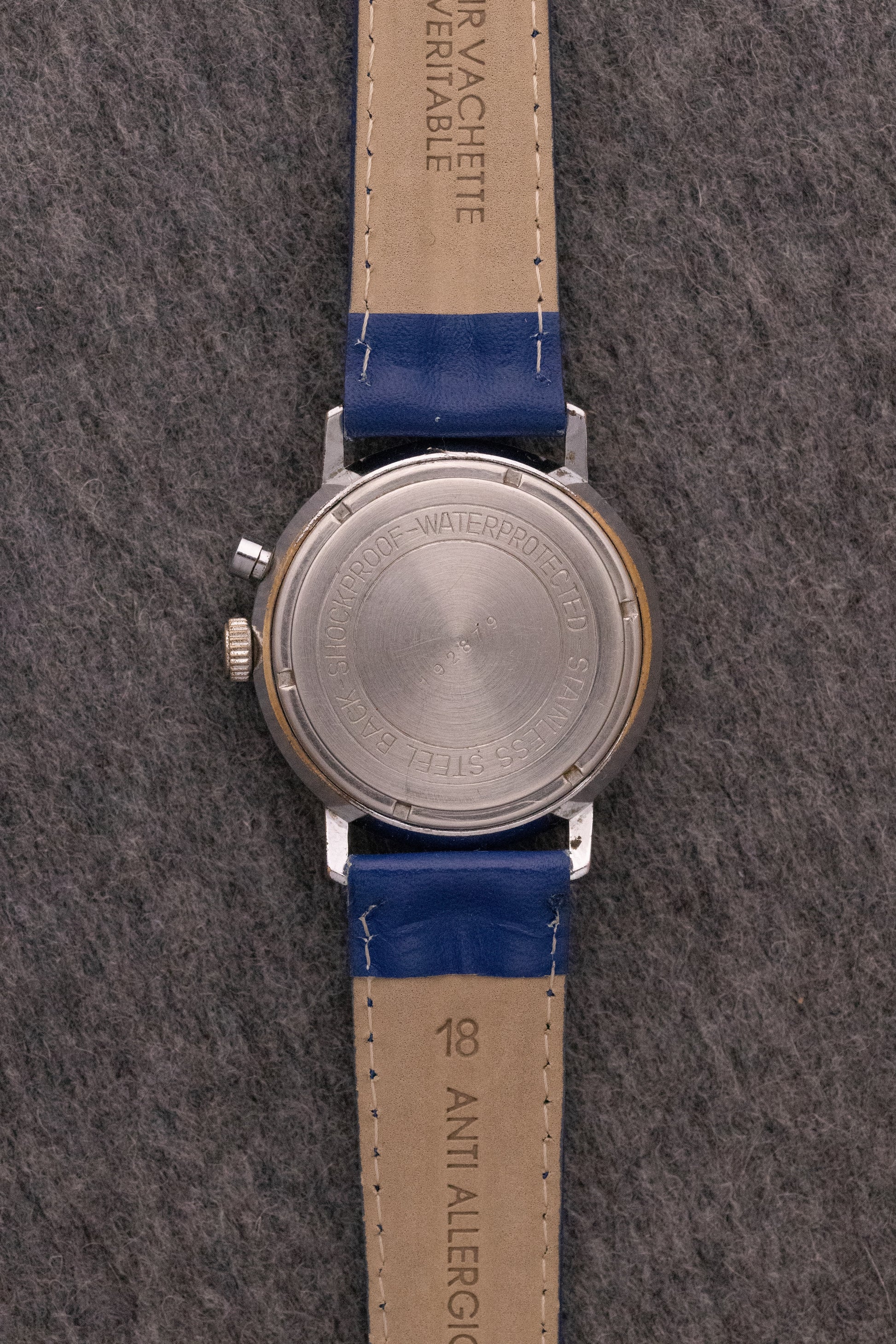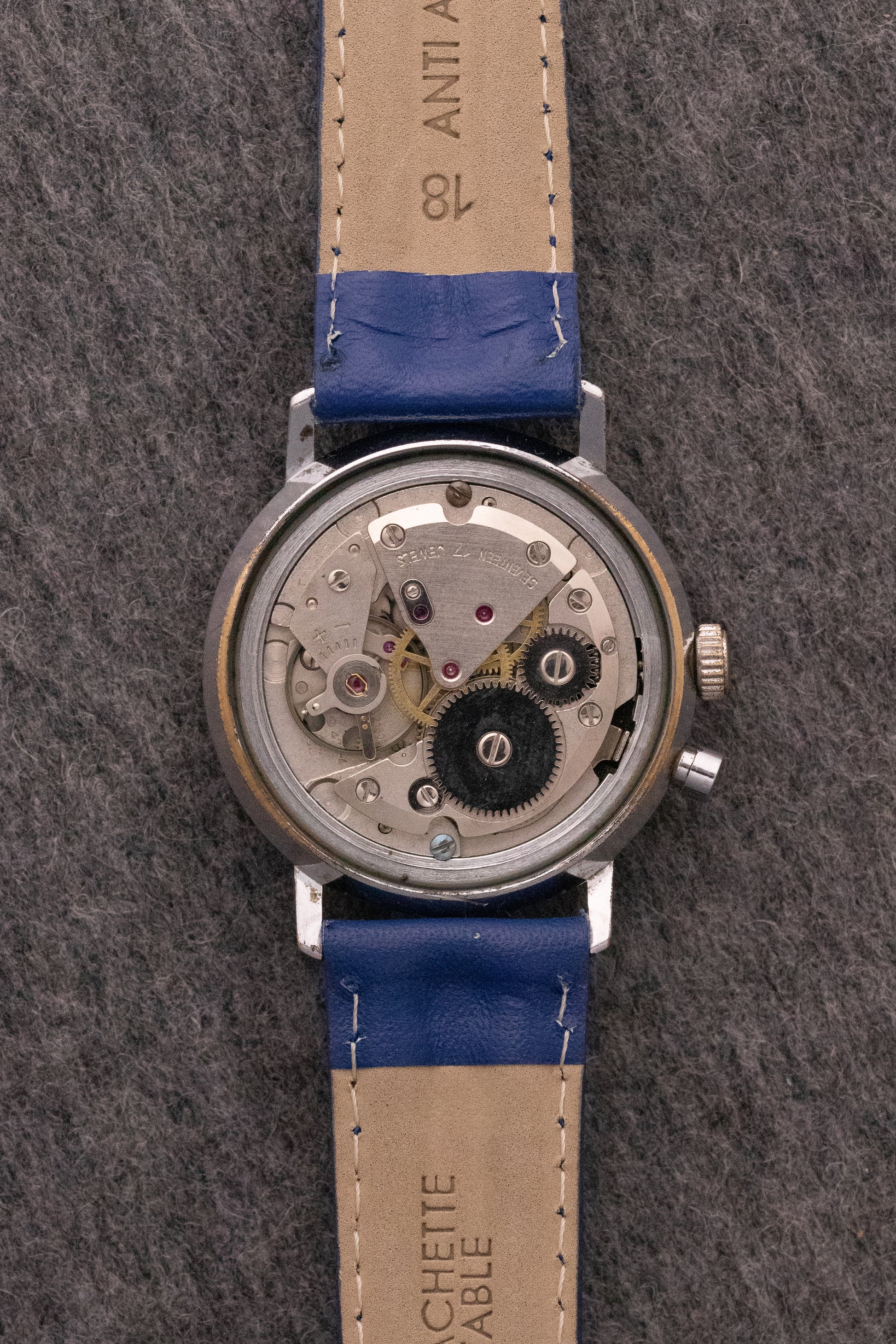 Cadran champagne satiné, index appliqués, disque bleu, aiguilles lumineuses
