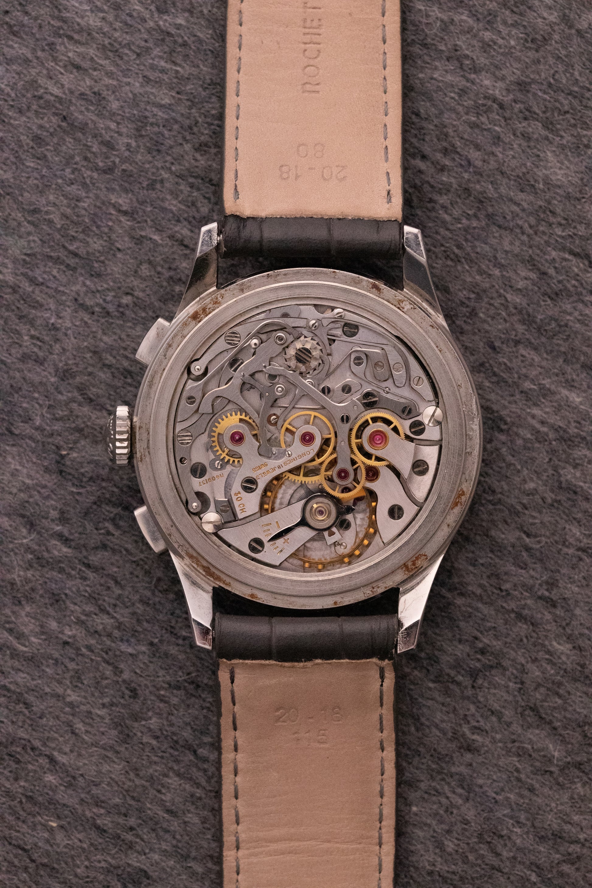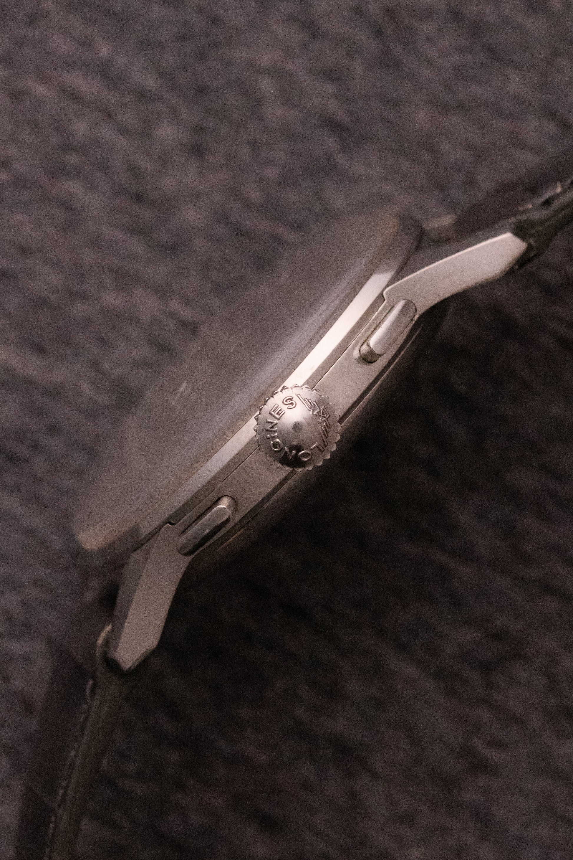 Cadran champagne à index appliqués dorés, aiguilles alpha dorées, échelle télémétrique, deux sous compteurs, une seconde permanente à 9H, un totaliseur 30min à 3H