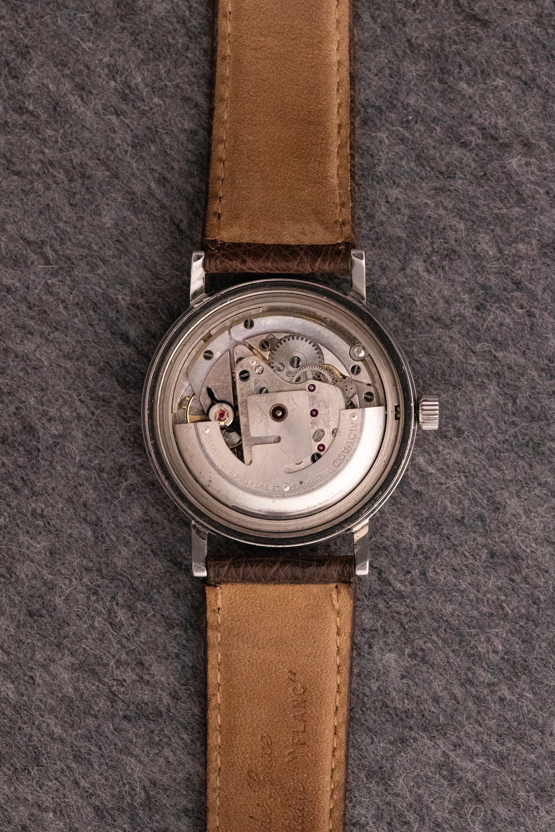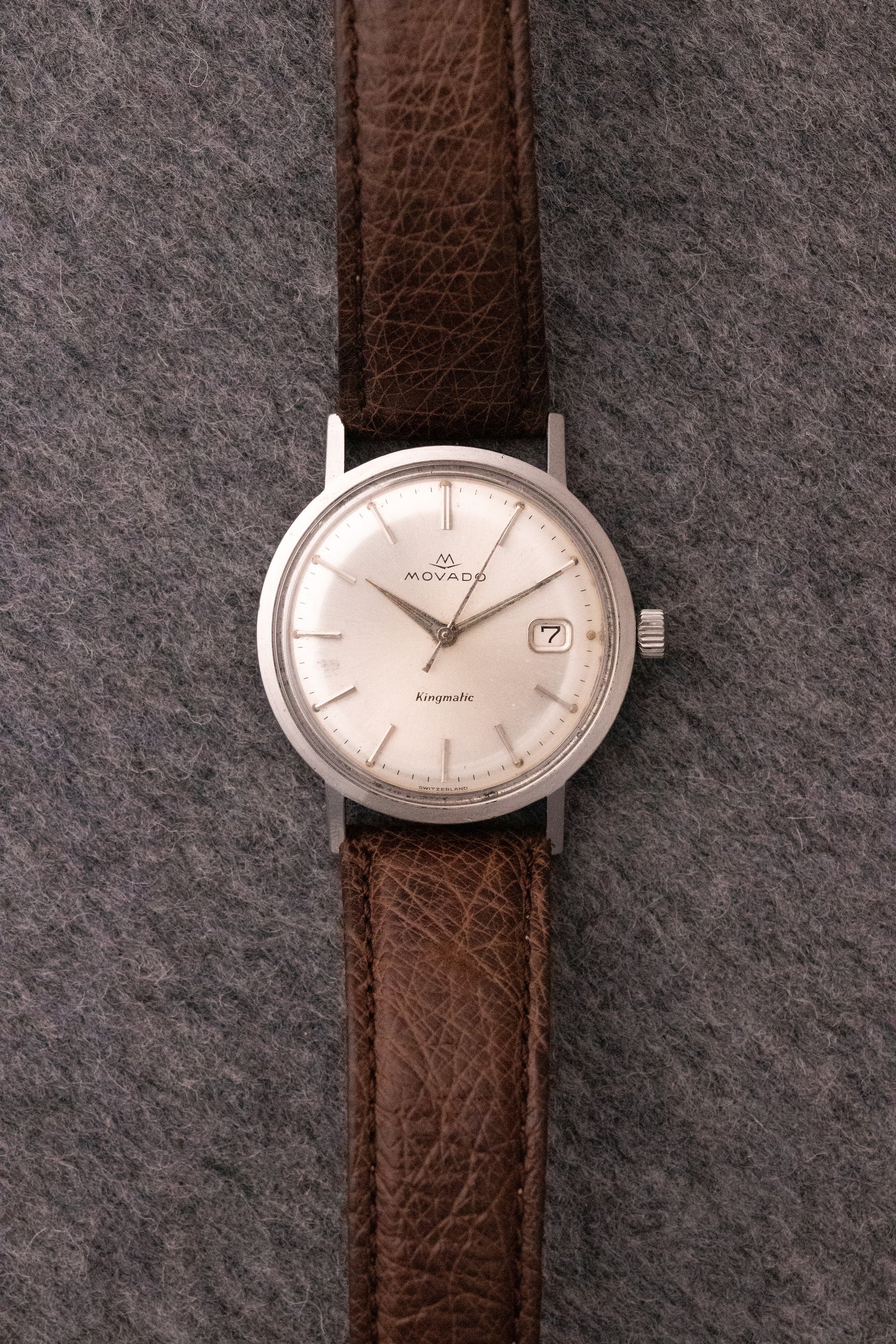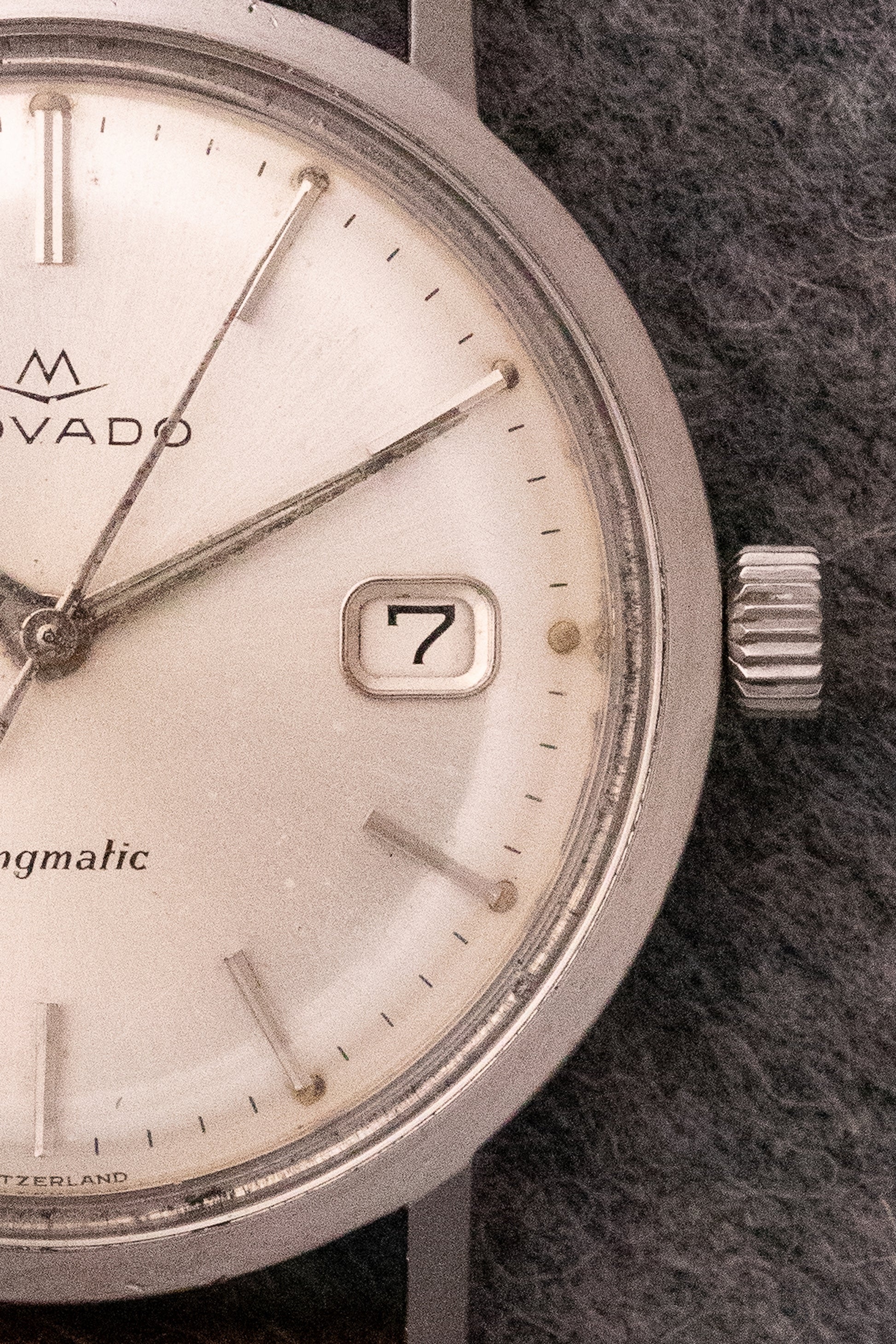 Cadran argenté, index appliqués, aiguilles glaives, date par guichet à 3H