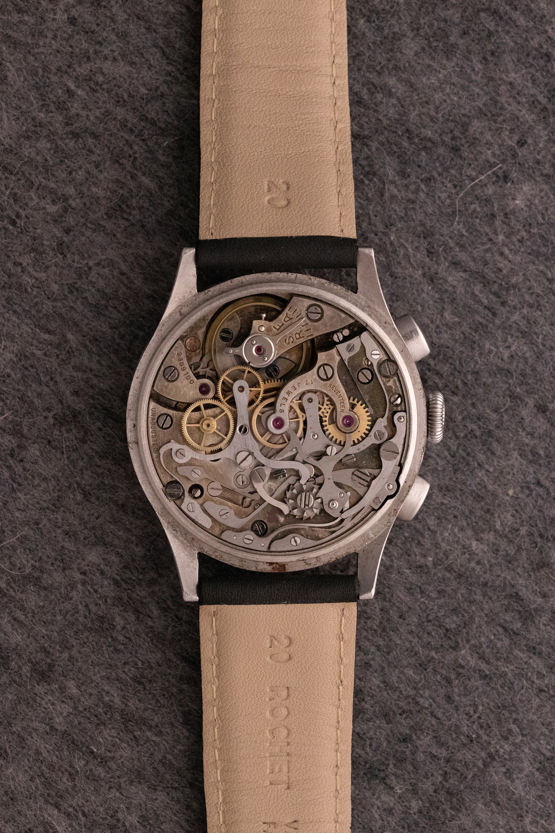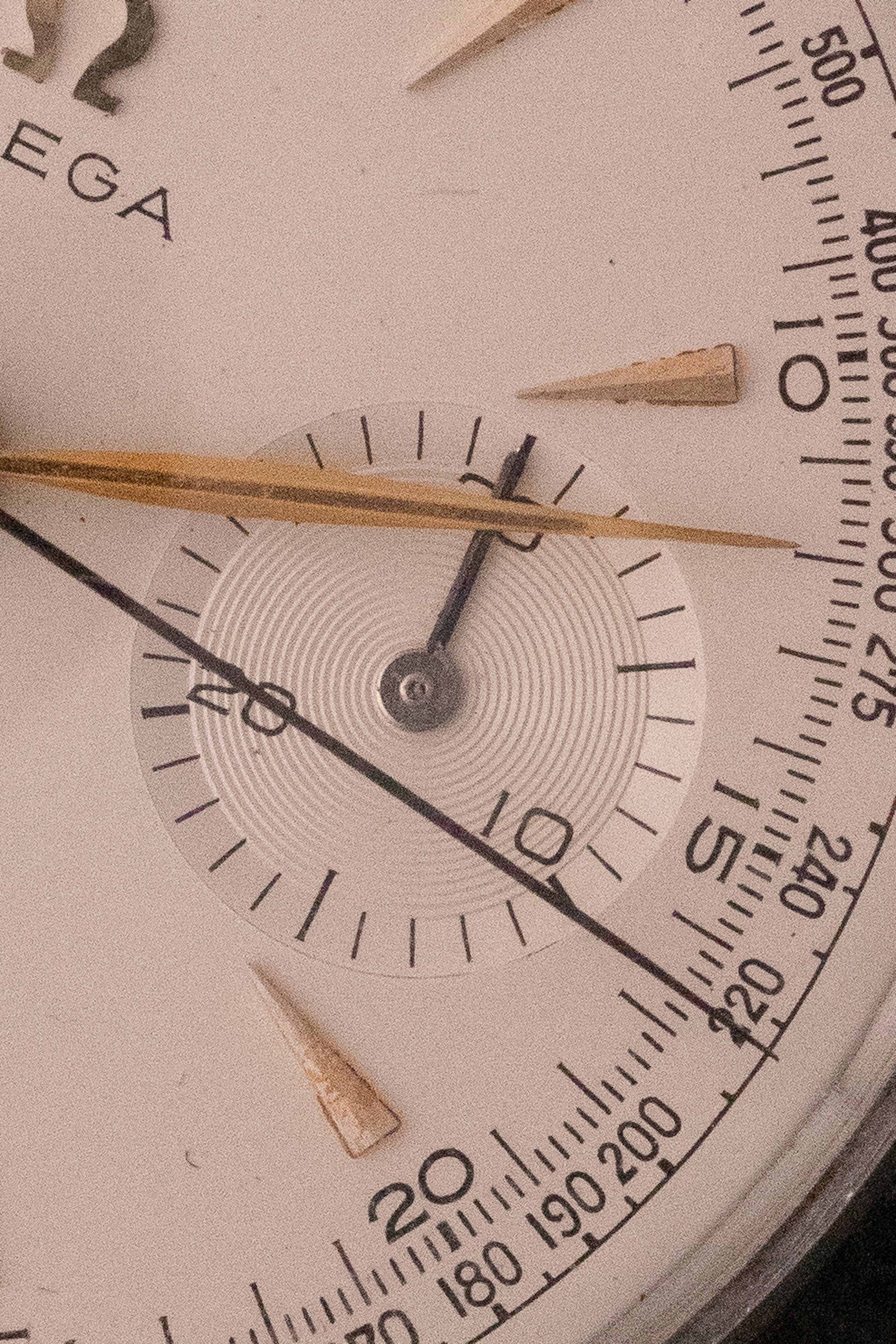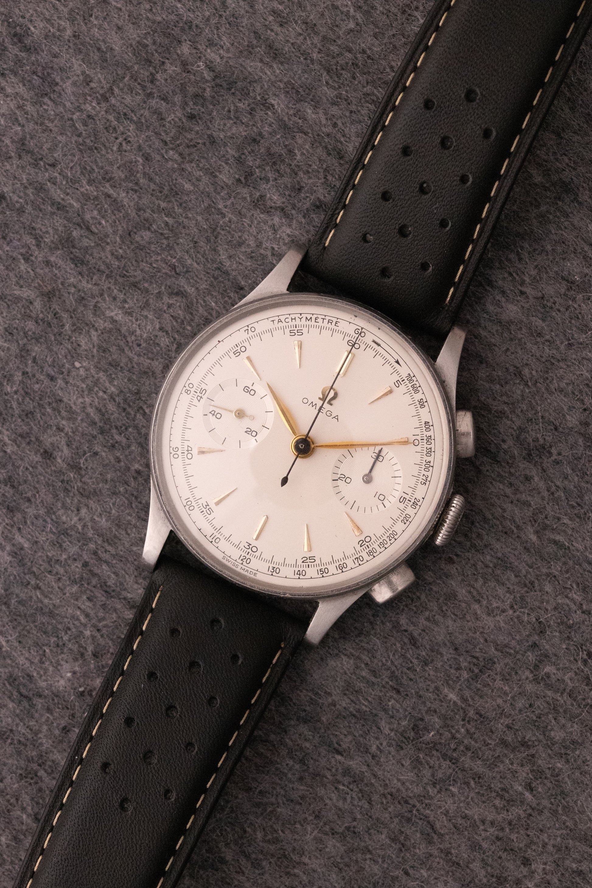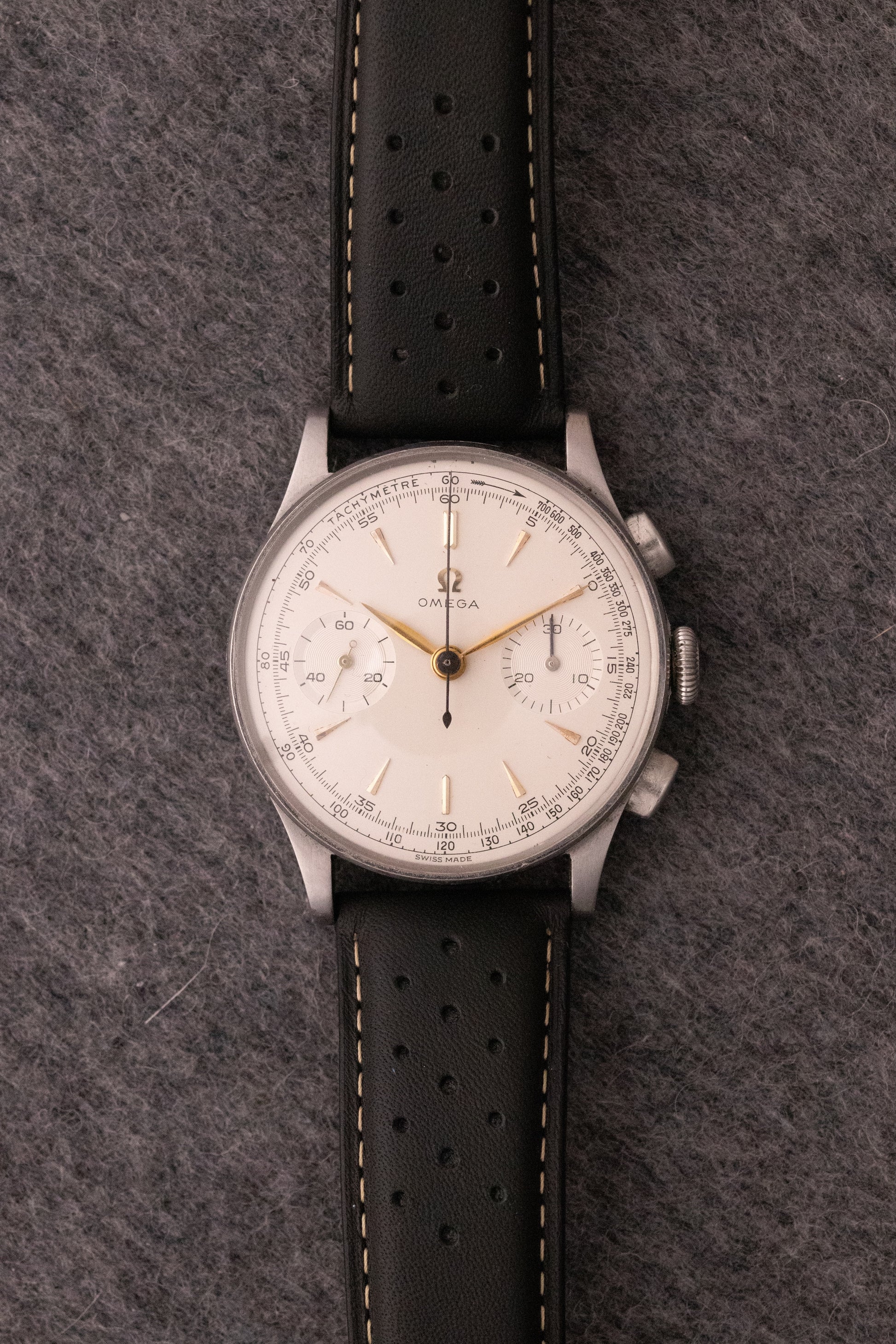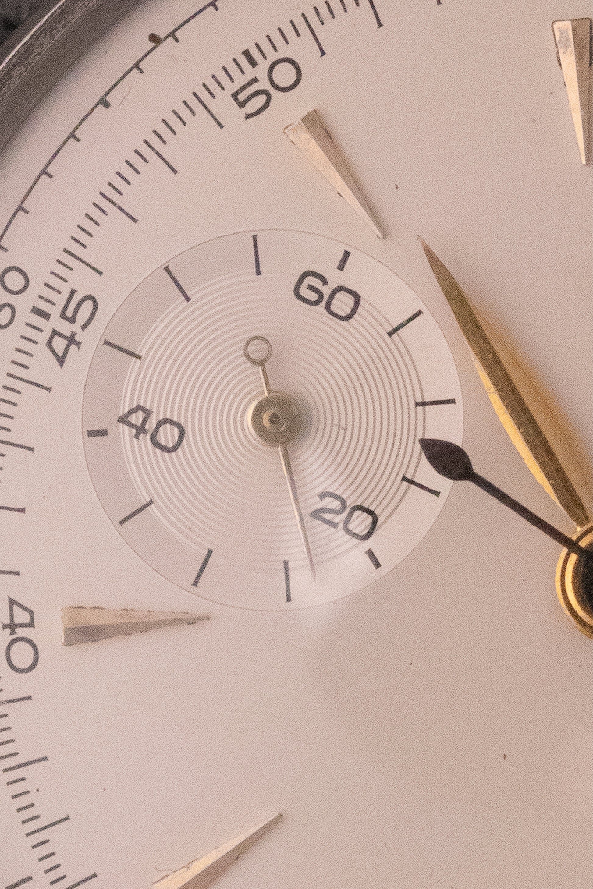 Cadran blanc, index or appliqués, aiguilles or feuilles, trotteuse bleuie, échelle tachi peinte, deux sous compteurs, une seconde permanente à 9H, un totaliseur 30min à 3H