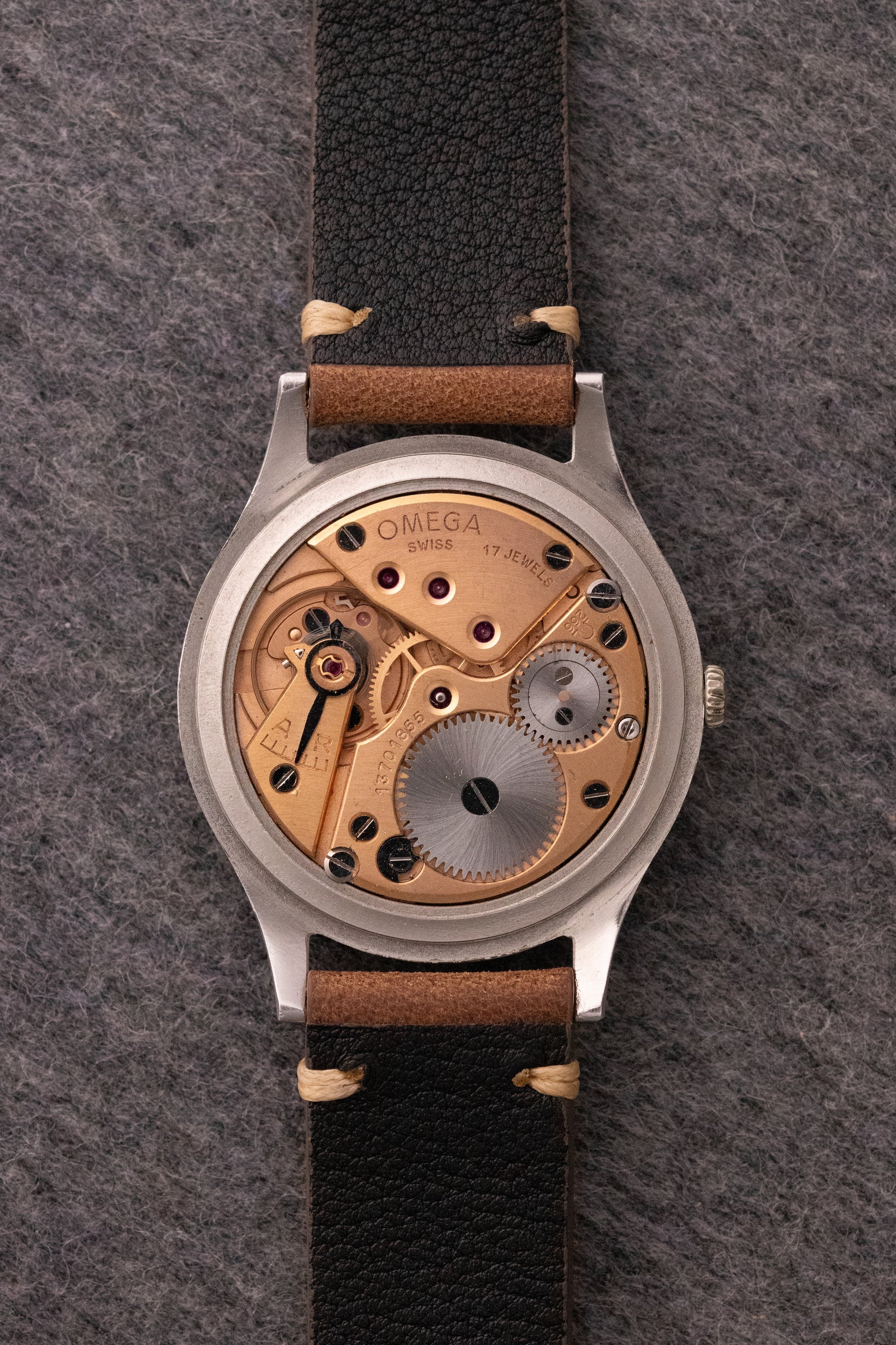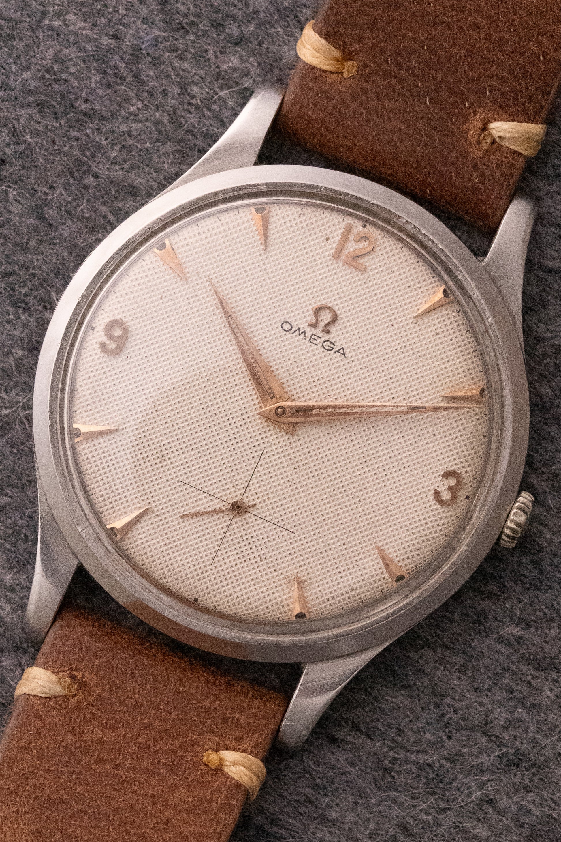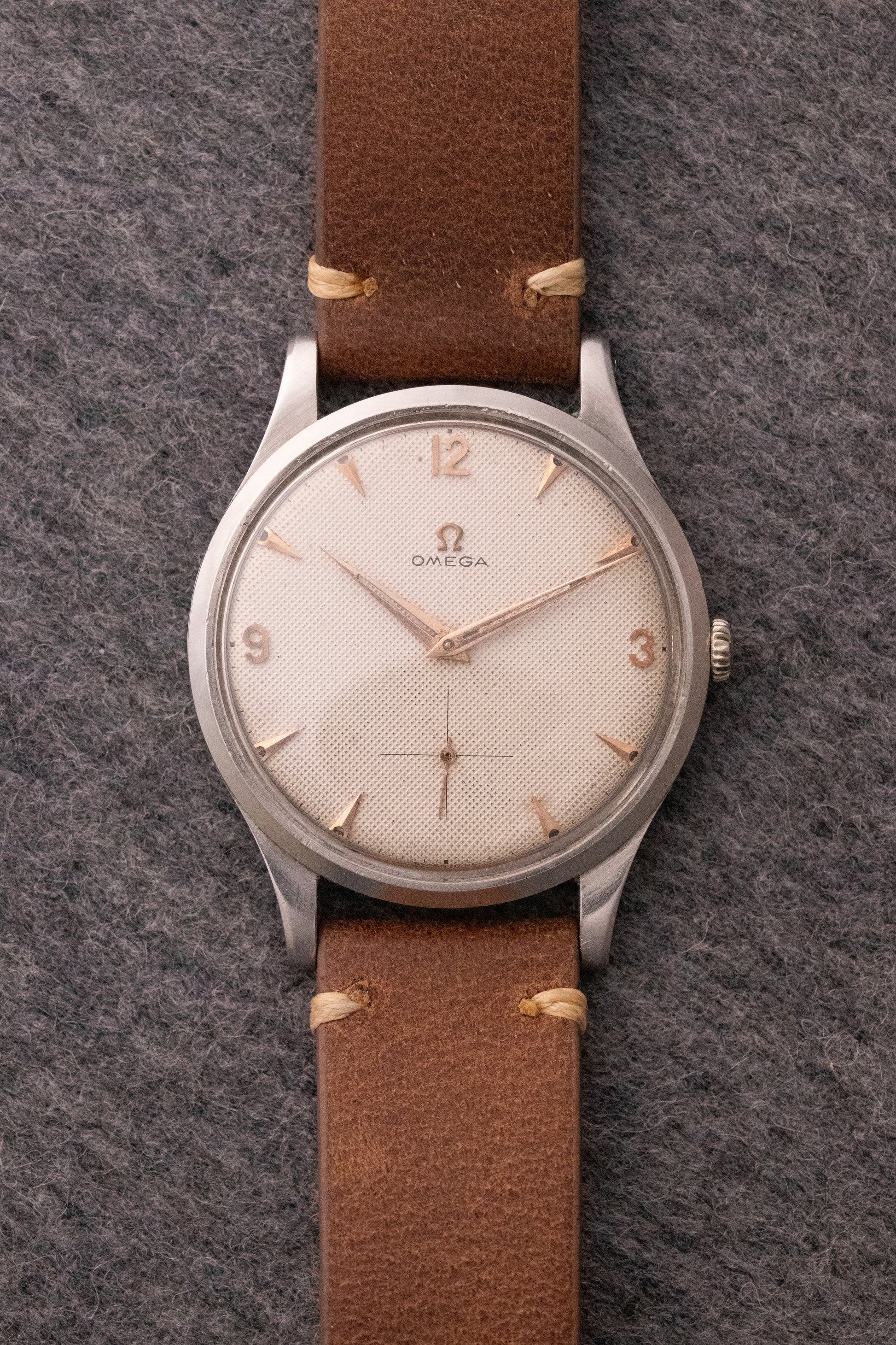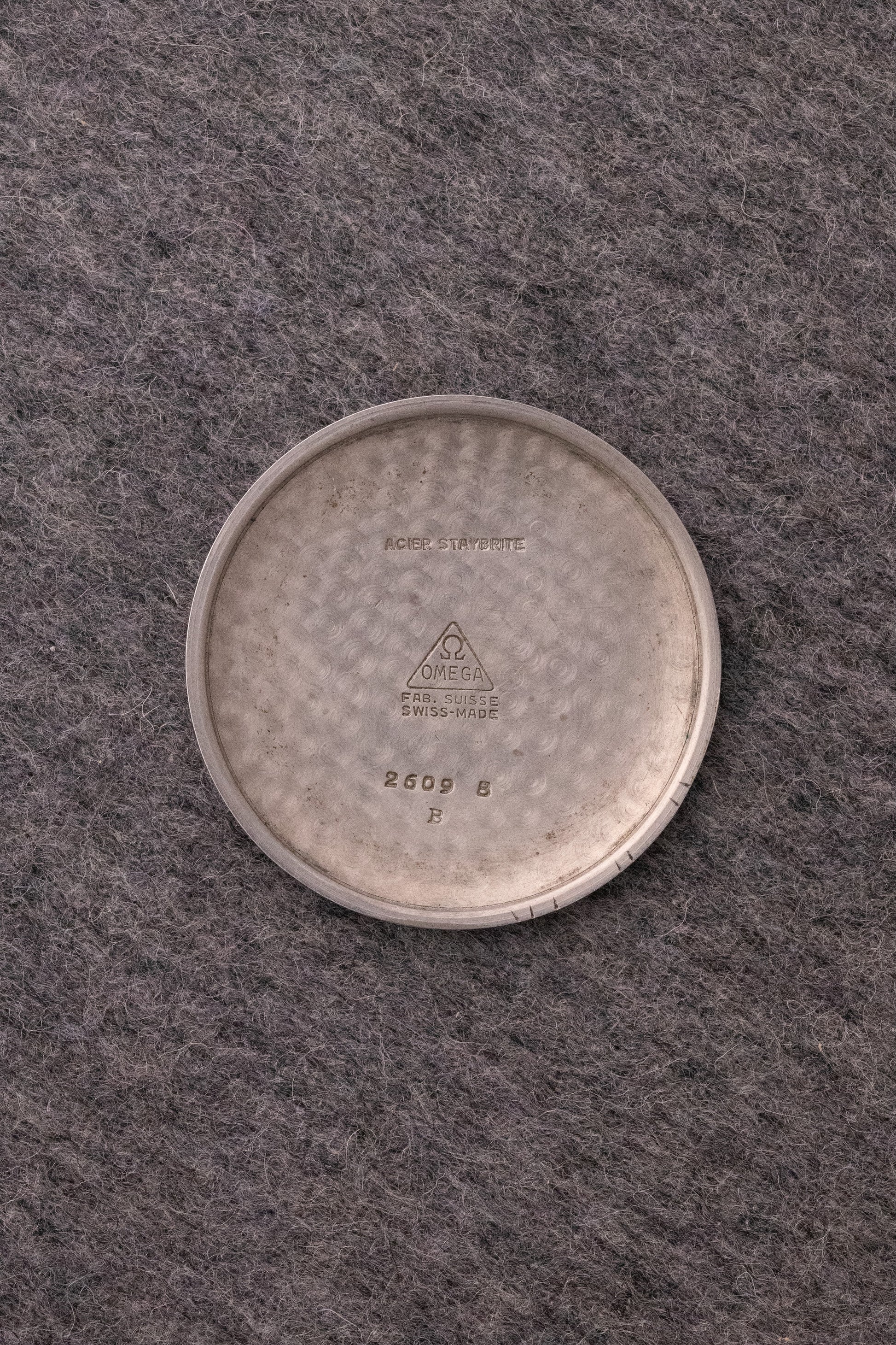 Boitier acier brossé 37mm, fond clipsé, couronne Omega