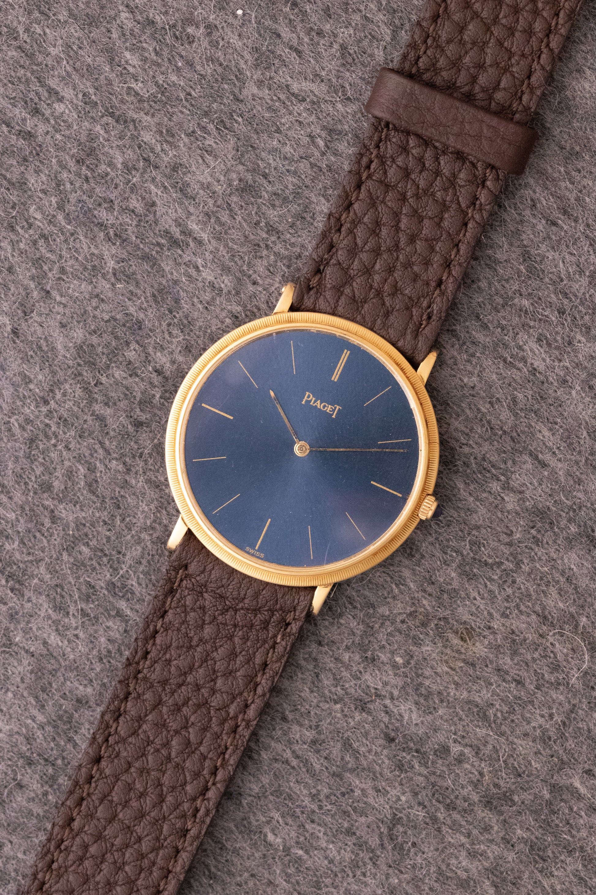 Cadran bleu, index bâtons appliqués en or, aiguilles bâtons en or
