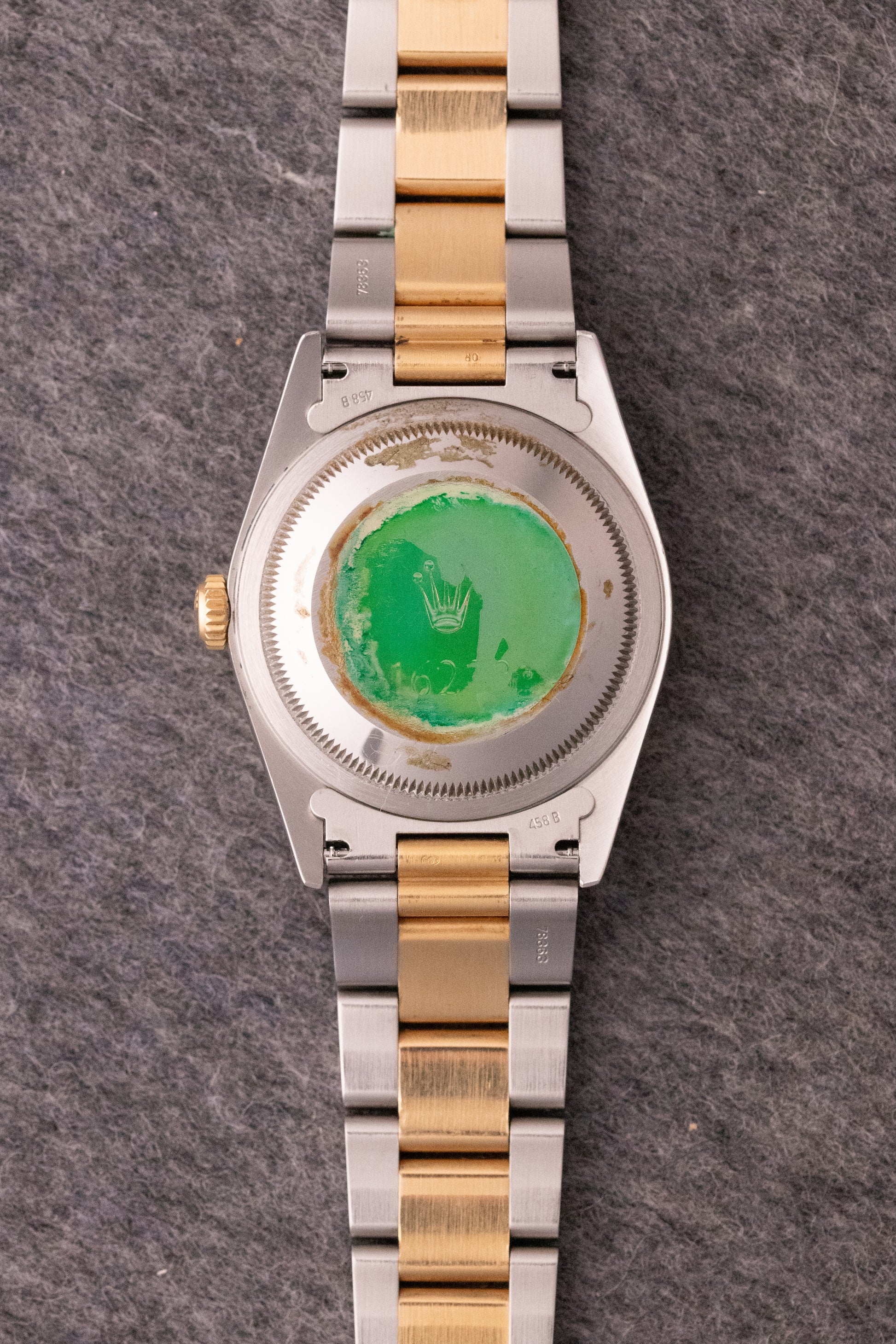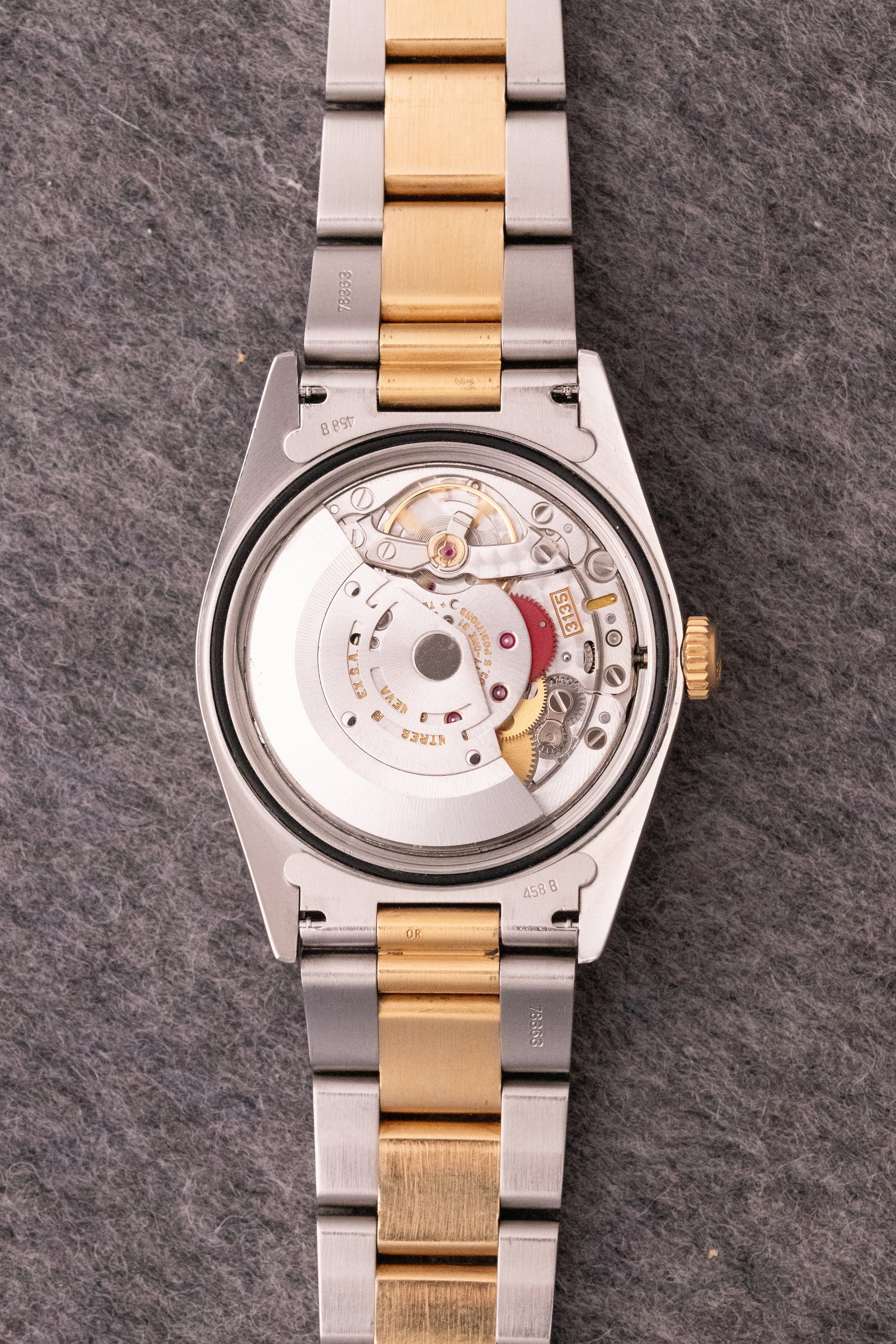 Boitier acier oyster, fond vissé, pastille d'origine, couronne d'origine or, verre cyclope, lunette cannelée or