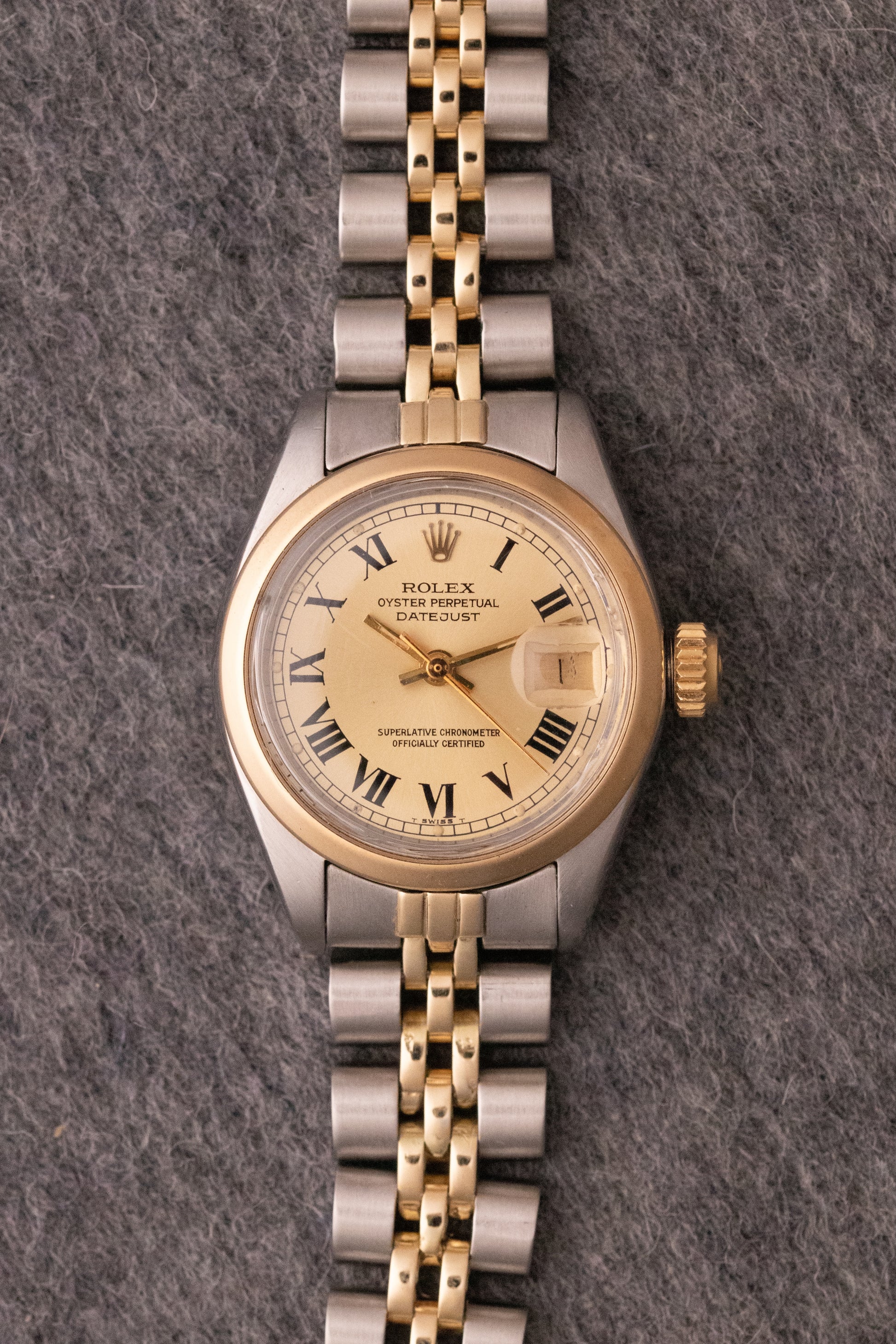 Cadran or , index chiffres romains peints, plots tritiums, aiguilles bâtons au tritium, date par guichet à 3H