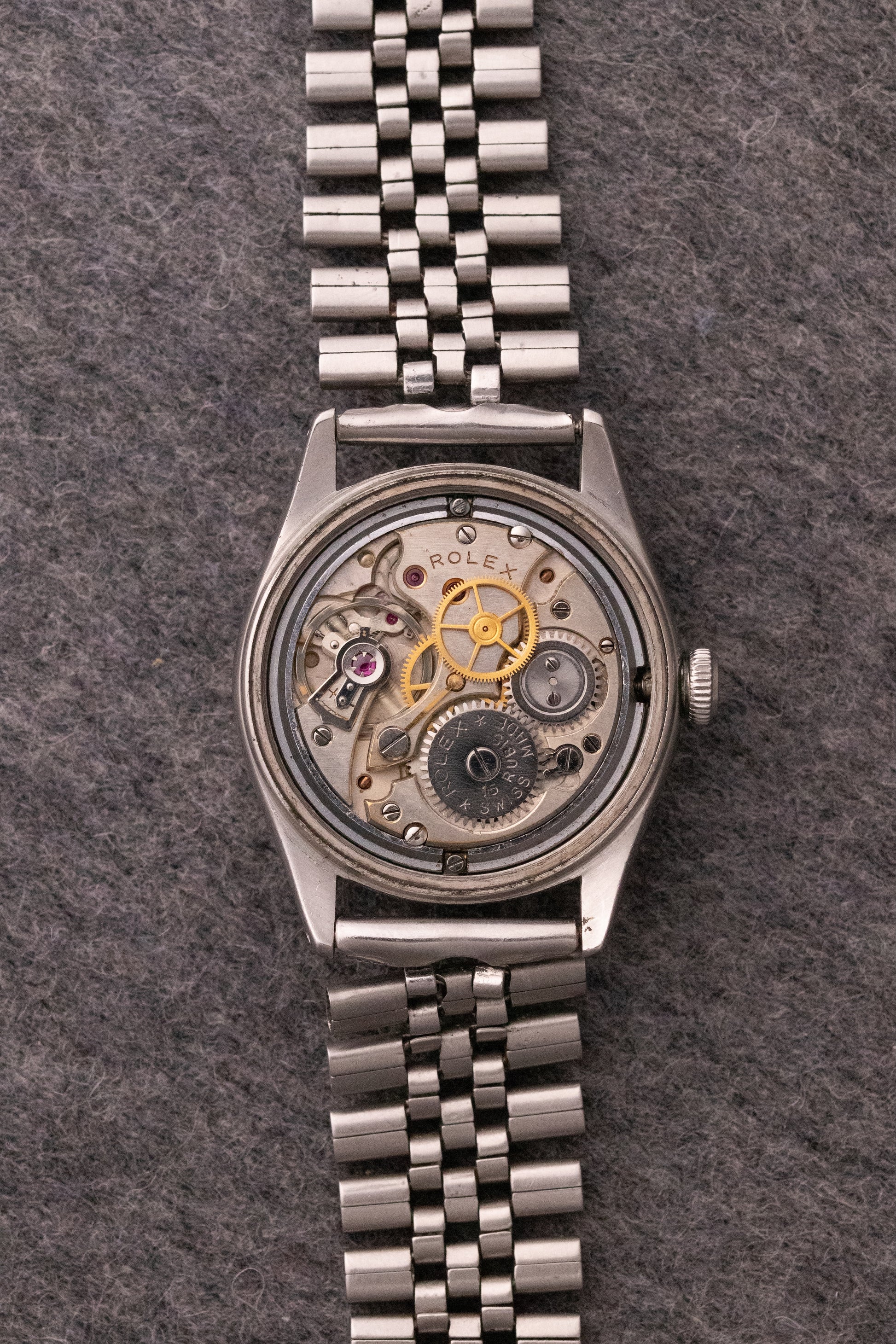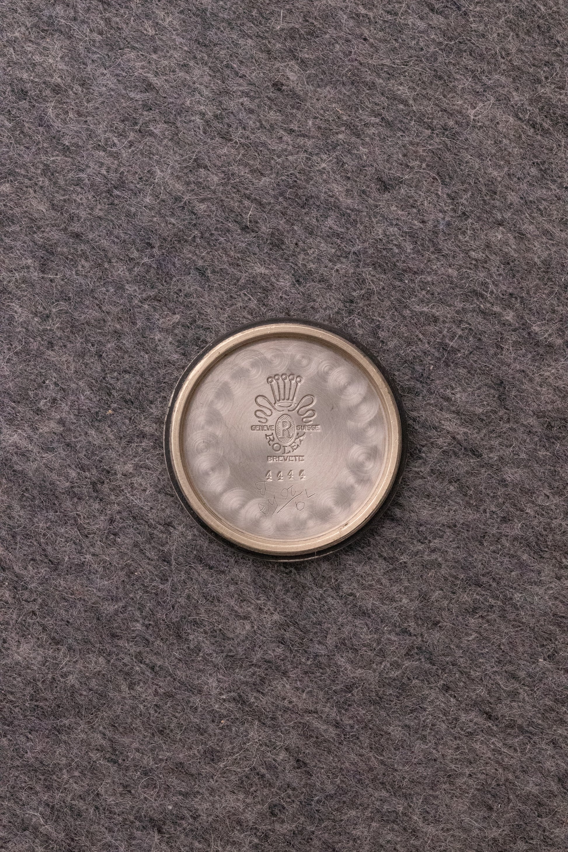 Boitier acier 32mm, fond vissé gravé Rolex 4444, couronne Oyster breveté