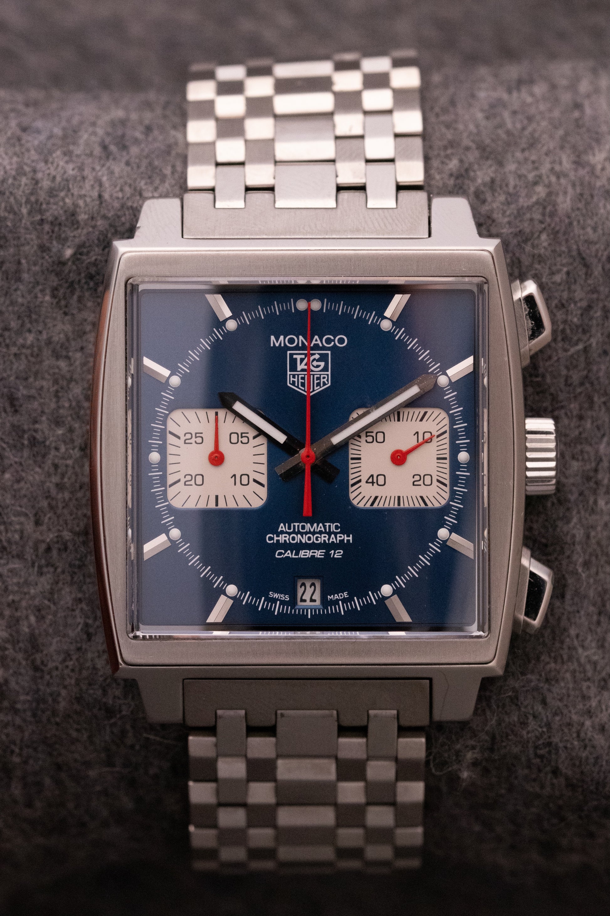 Cadran bleu à index appliqués, chemin de fer et points lumineux blancs, aiguilles rouges, date par guichet à 6h